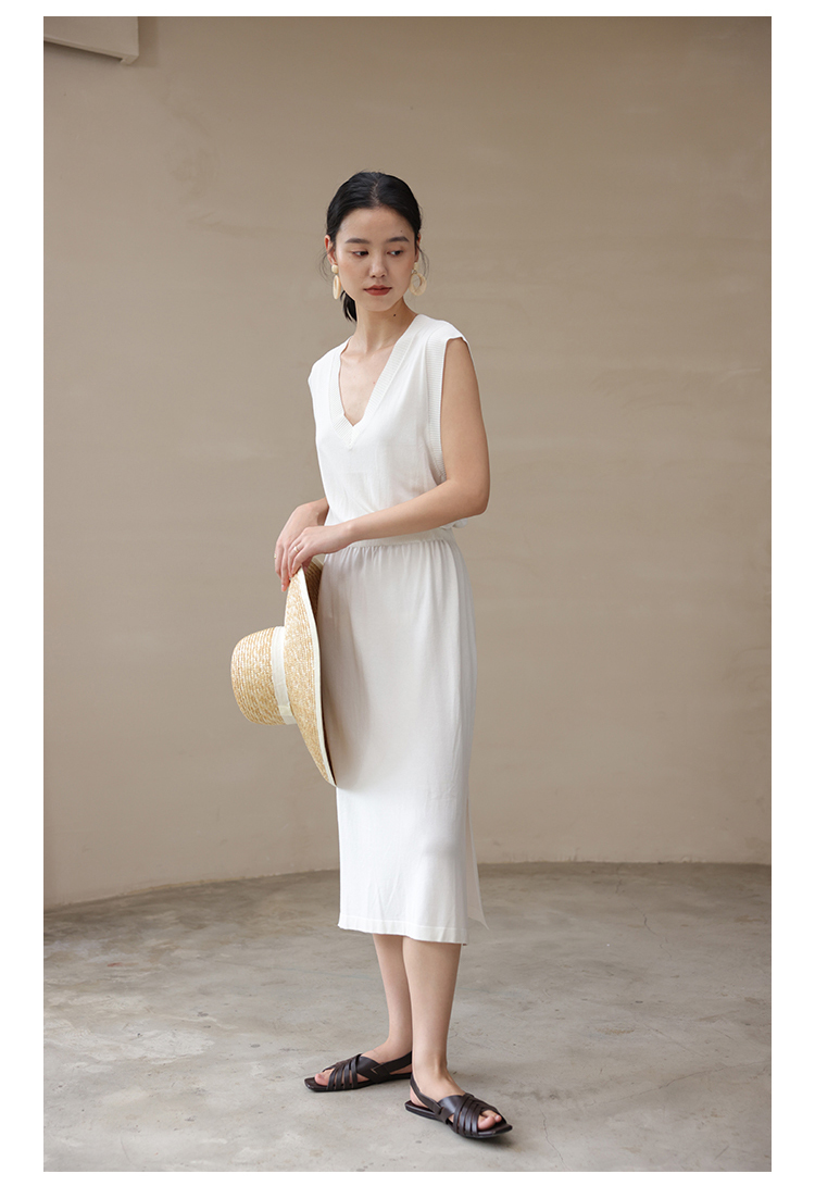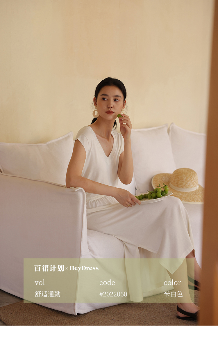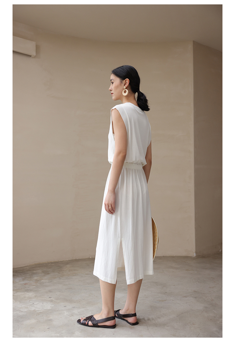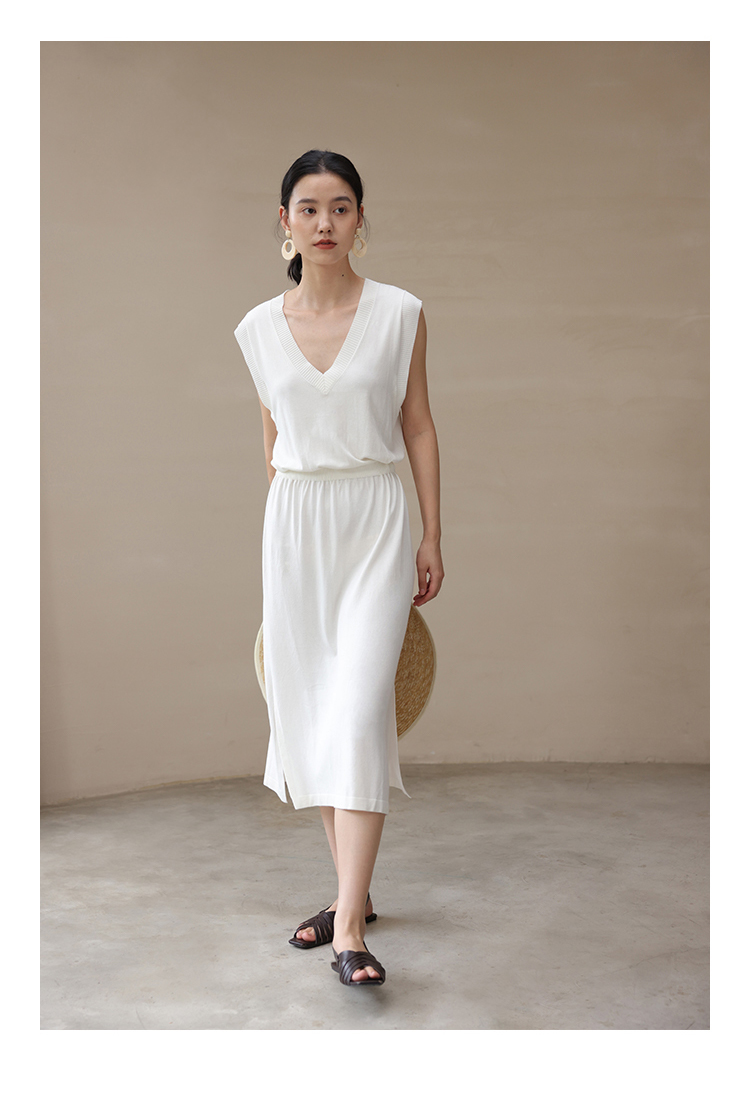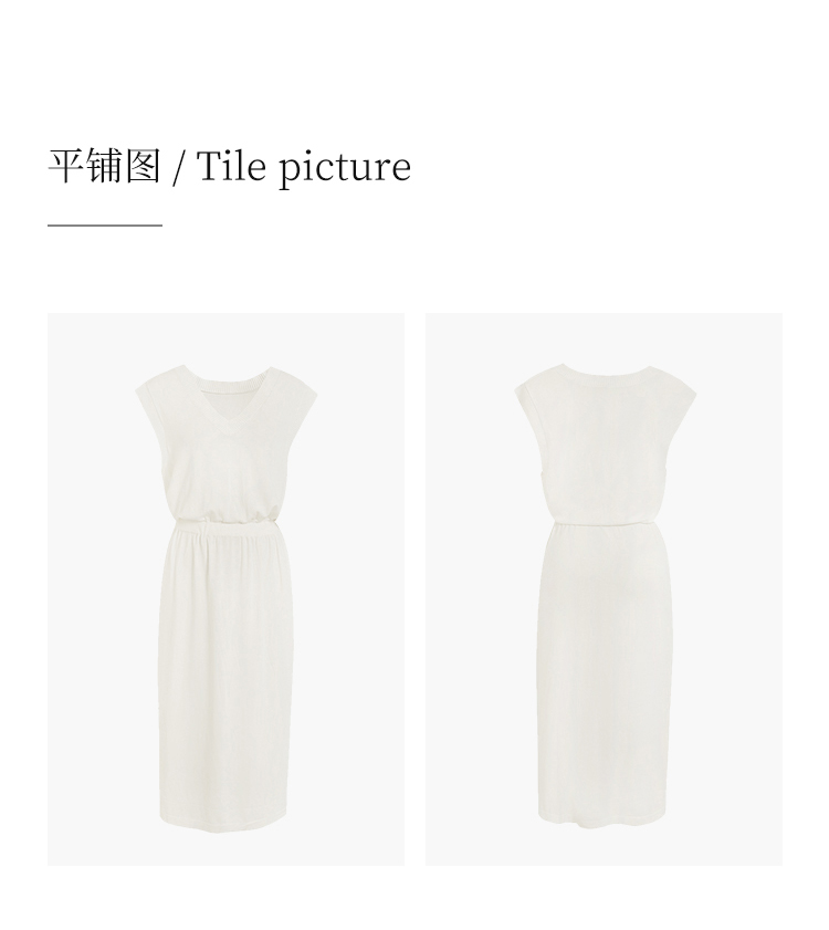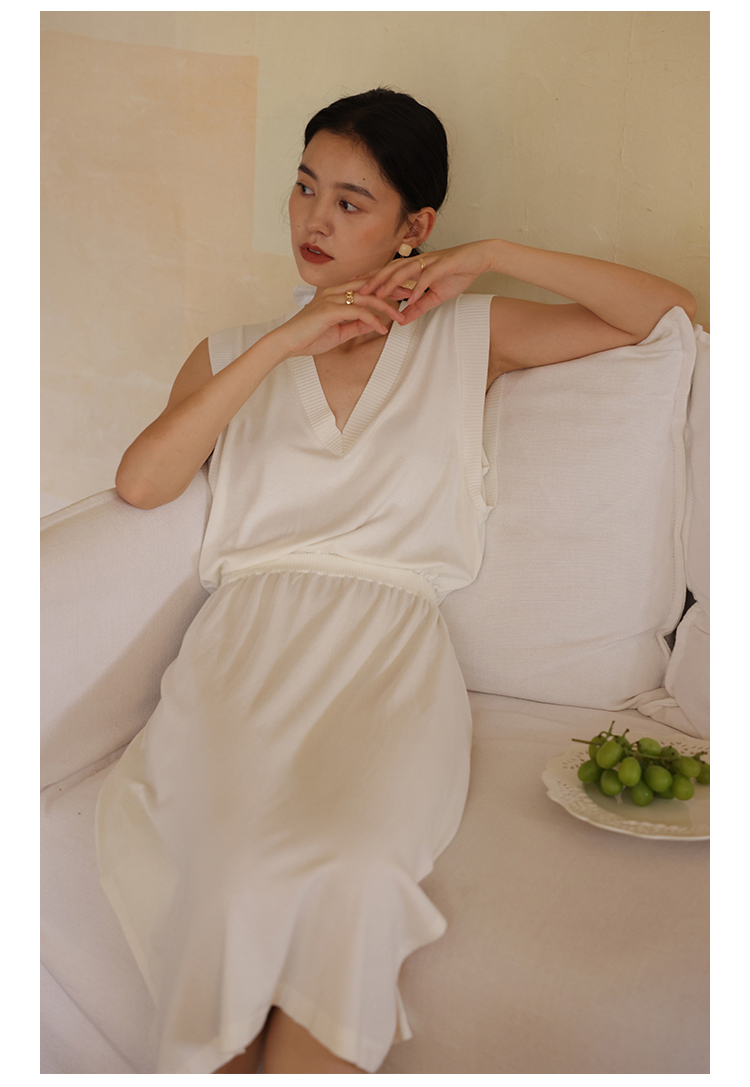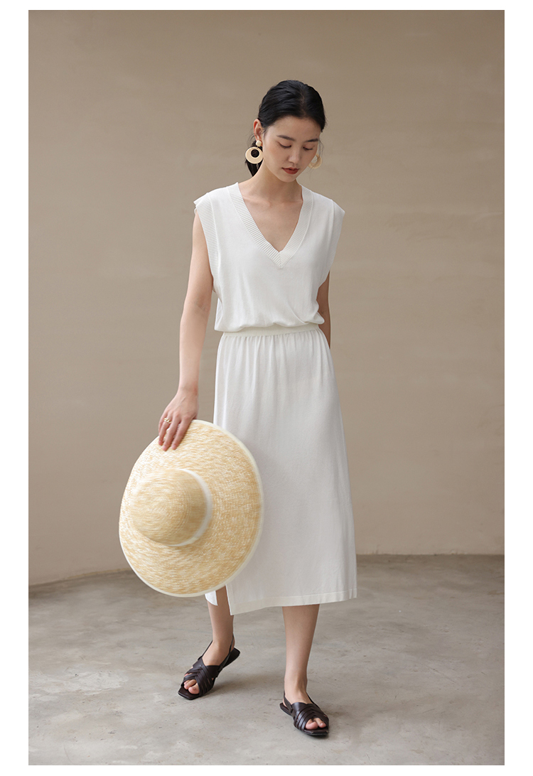 HeyDress法式针织连衣裙女夏季白色V领收腰显瘦设计气质无袖裙子