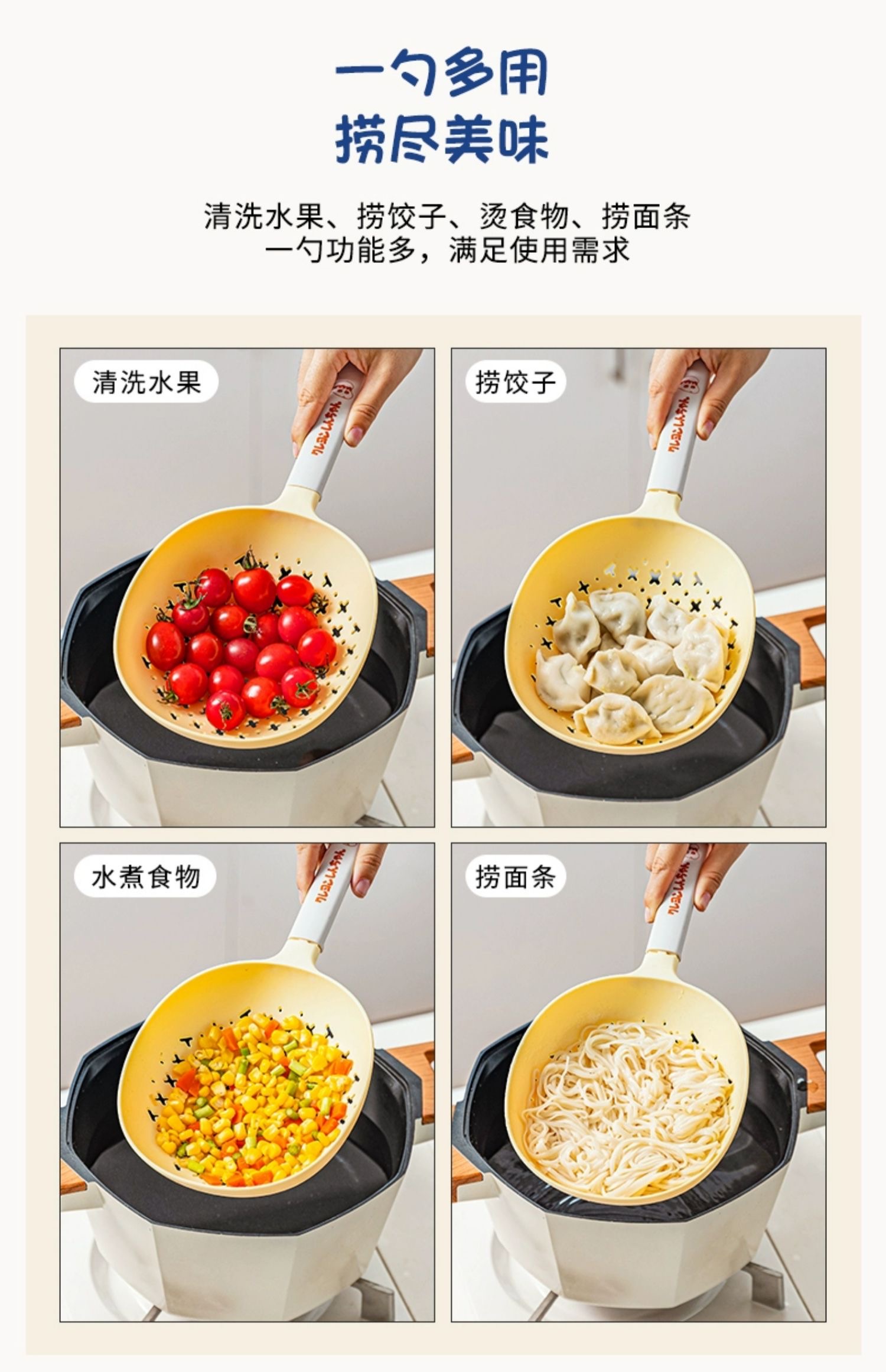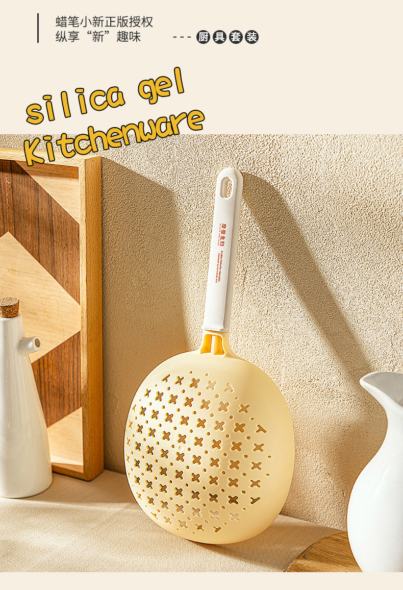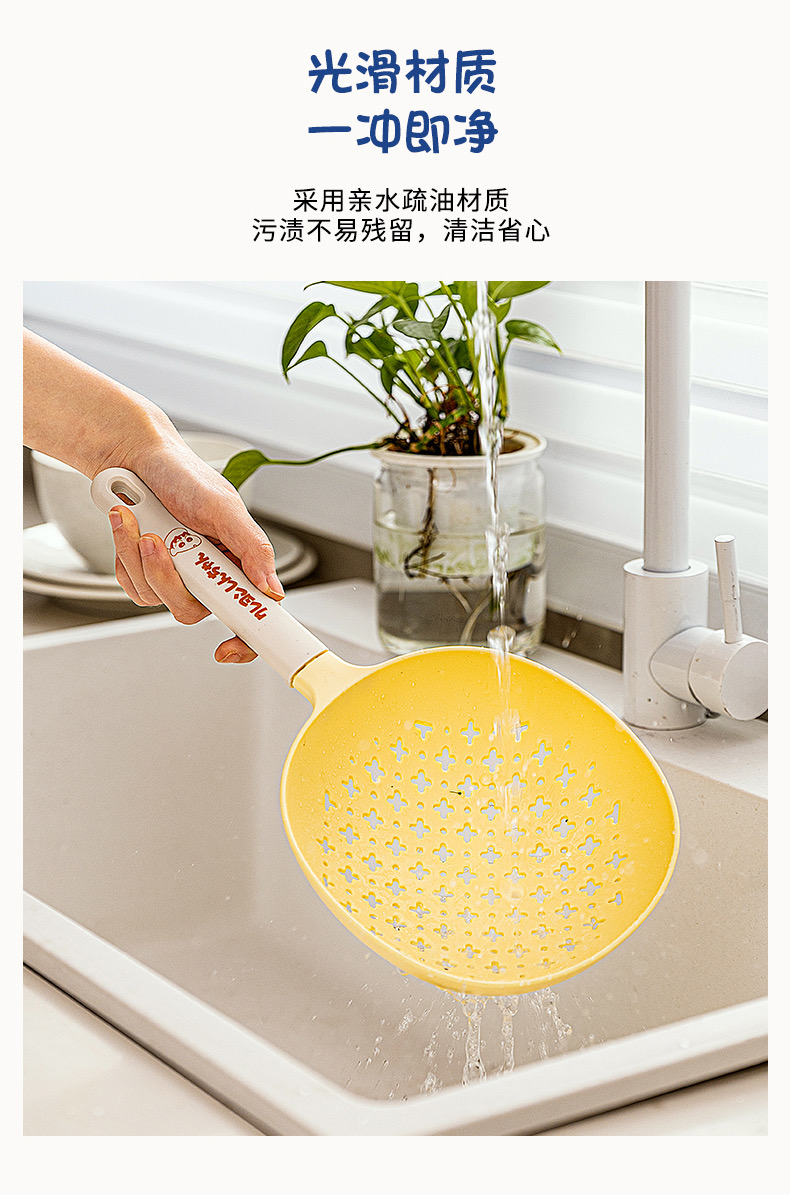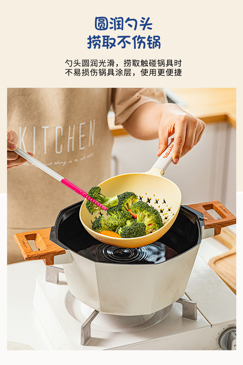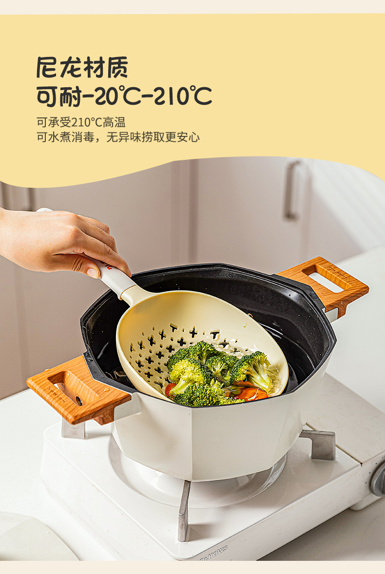 捞勺采用食用级可接触的尼龙和硅胶材质,可以耐高温,与食物接触也更安心。