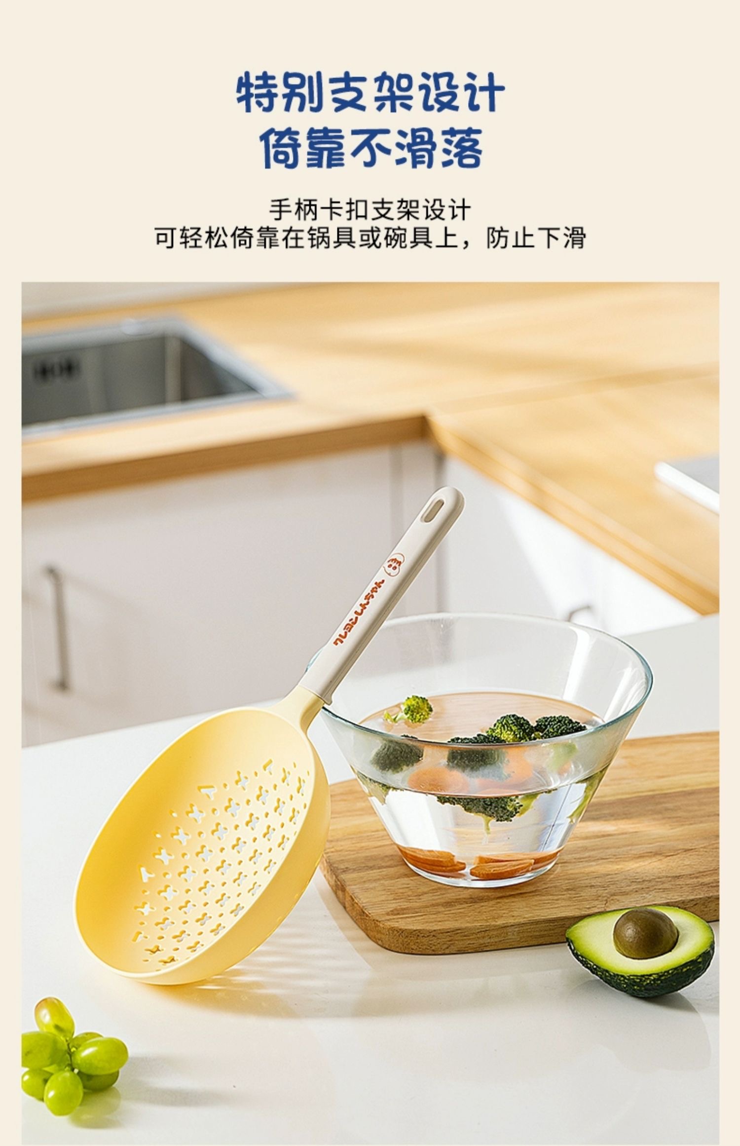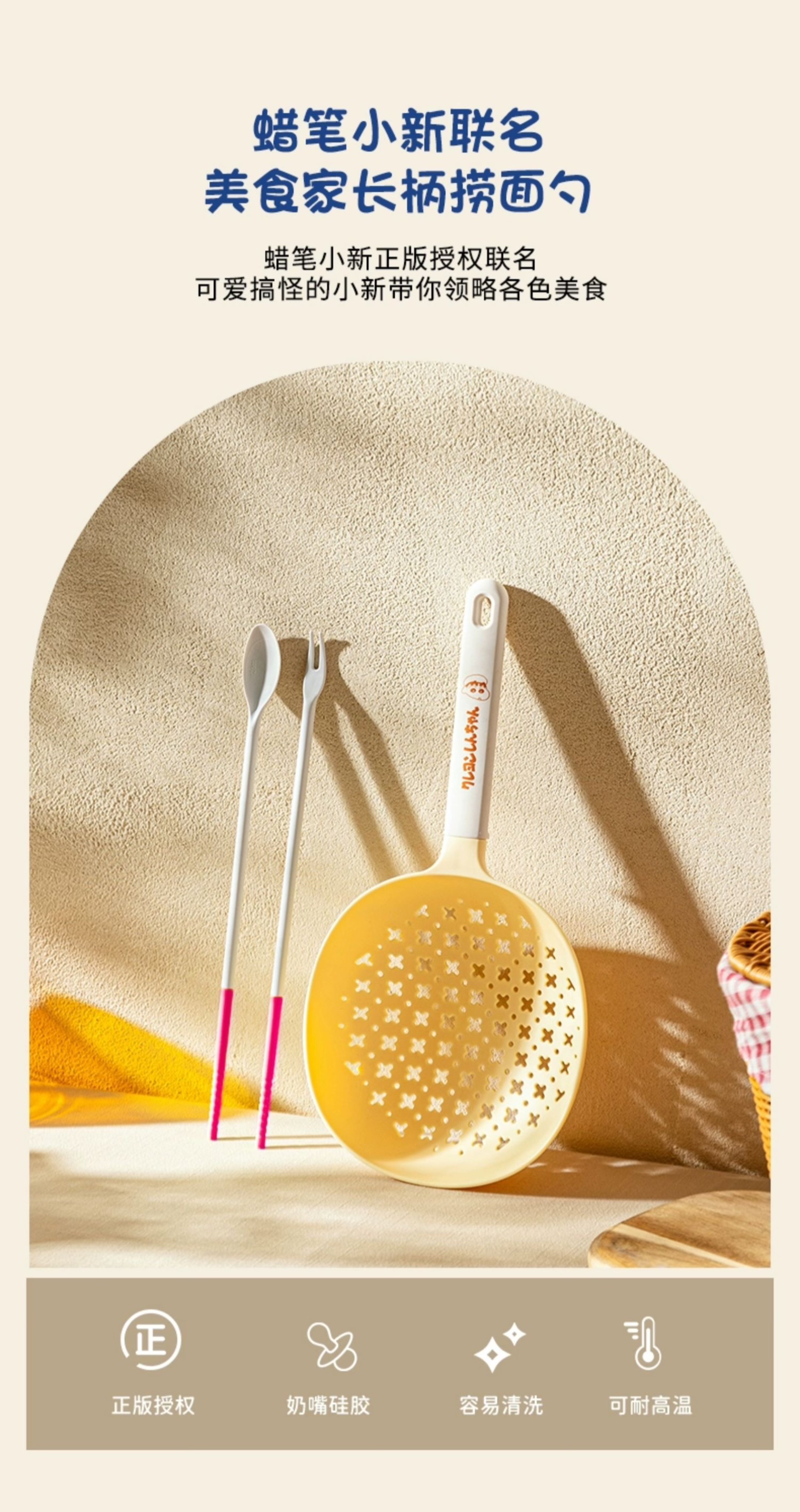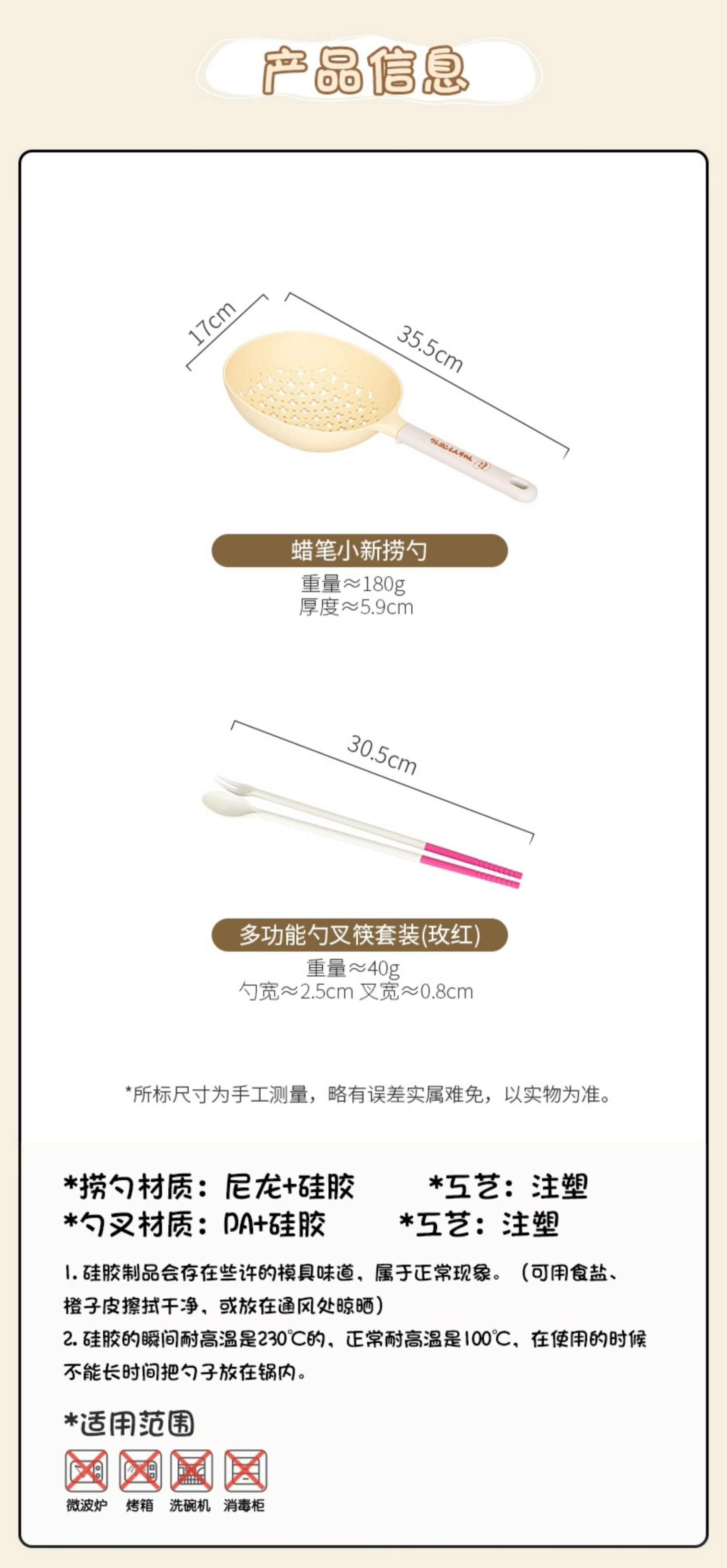 捞勺采用食用级可接触的尼龙和硅胶材质,可以耐高温,与食物接触也更安心。