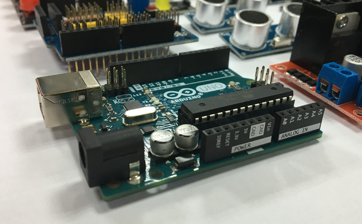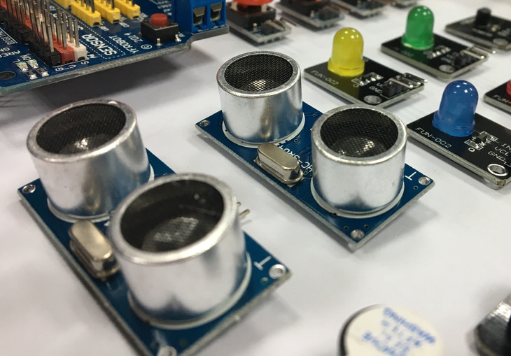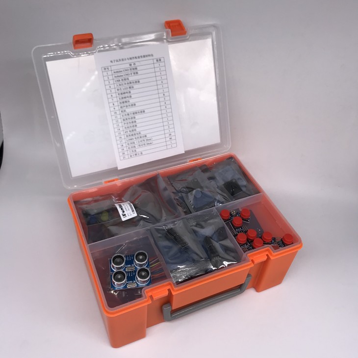 材料包中包含Arduino UNO 控制板、扩展版,蜂鸣器,超声波传感器,红外避障传感器,直流减速电机等电子模块,方便学生开展创客探究活动。