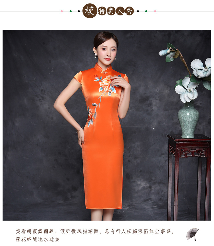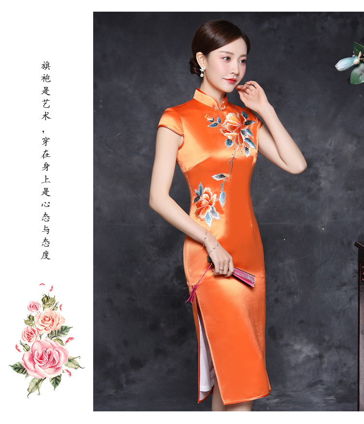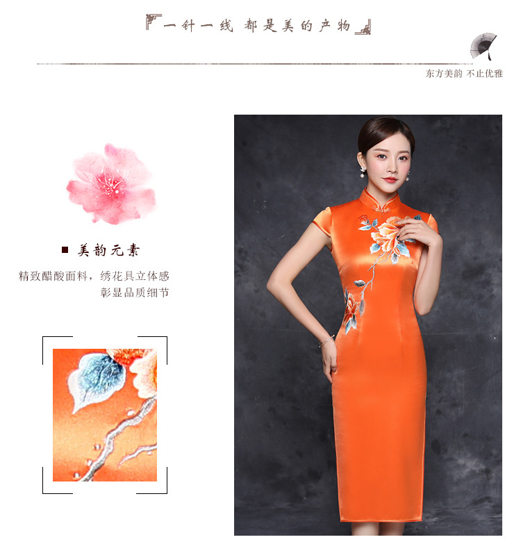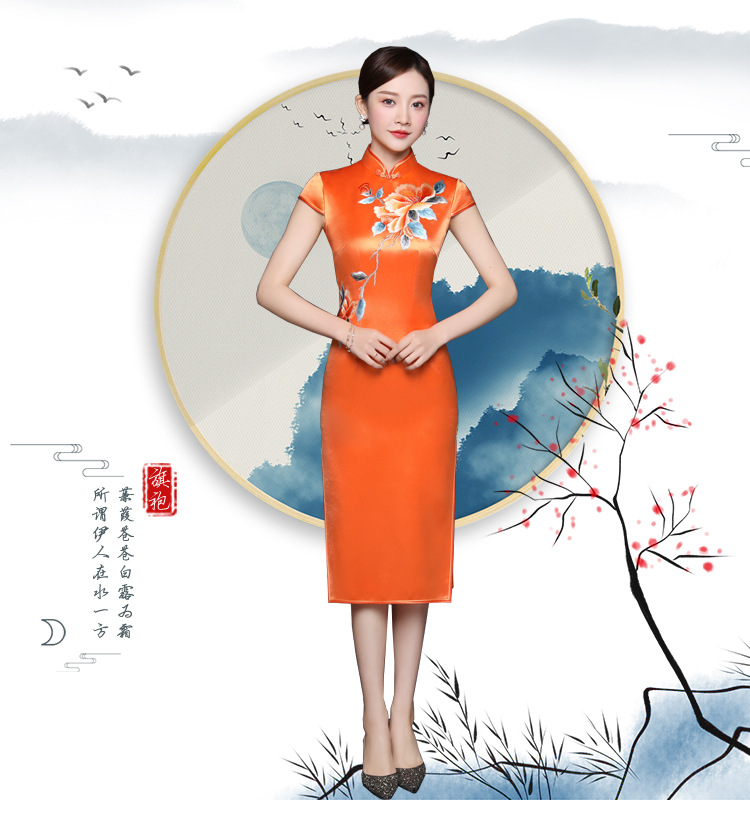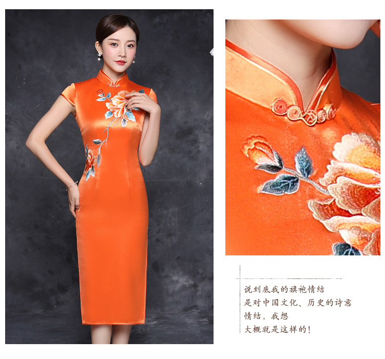 JQY-XZ20-10橙色大朵绣花醋酸缎中长款宴会走秀高档旗袍