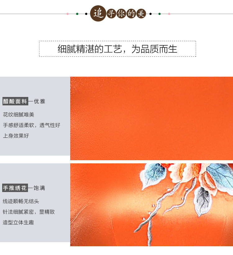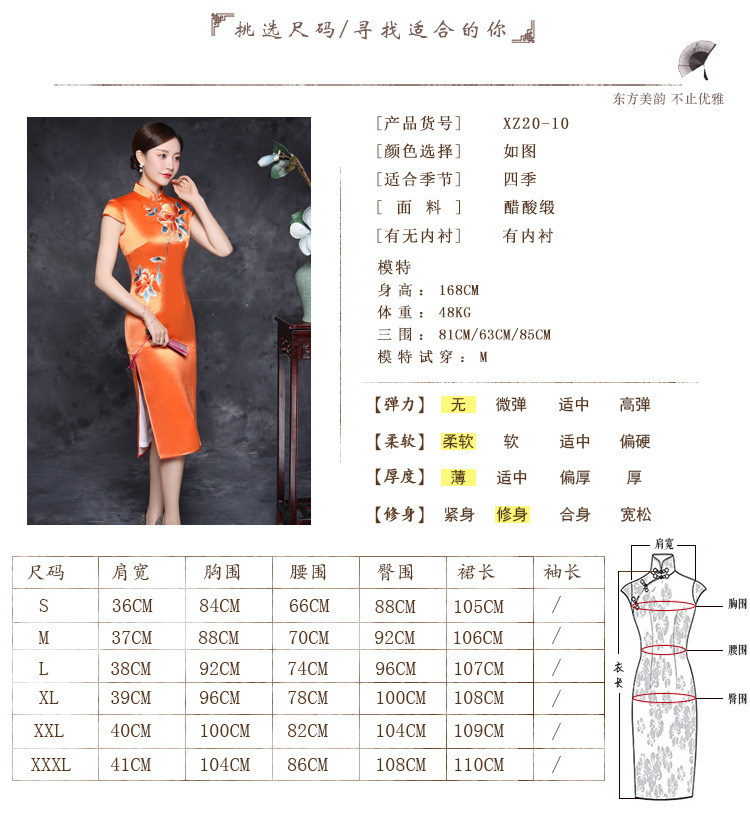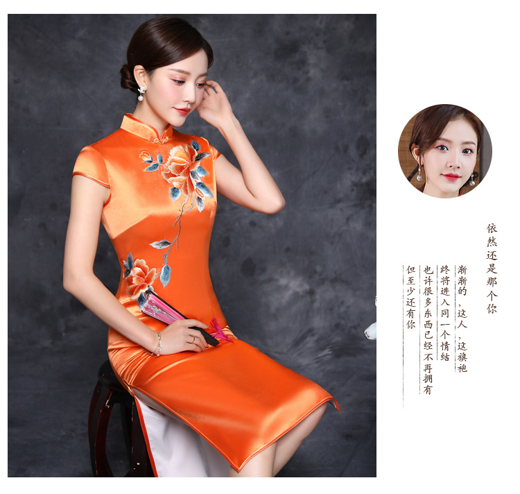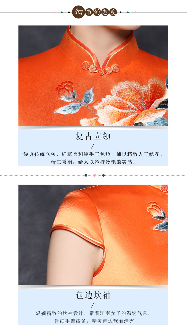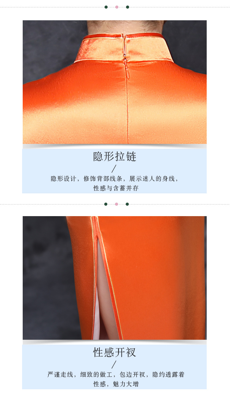 JQY-XZ20-10橙色大朵绣花醋酸缎中长款宴会走秀高档旗袍