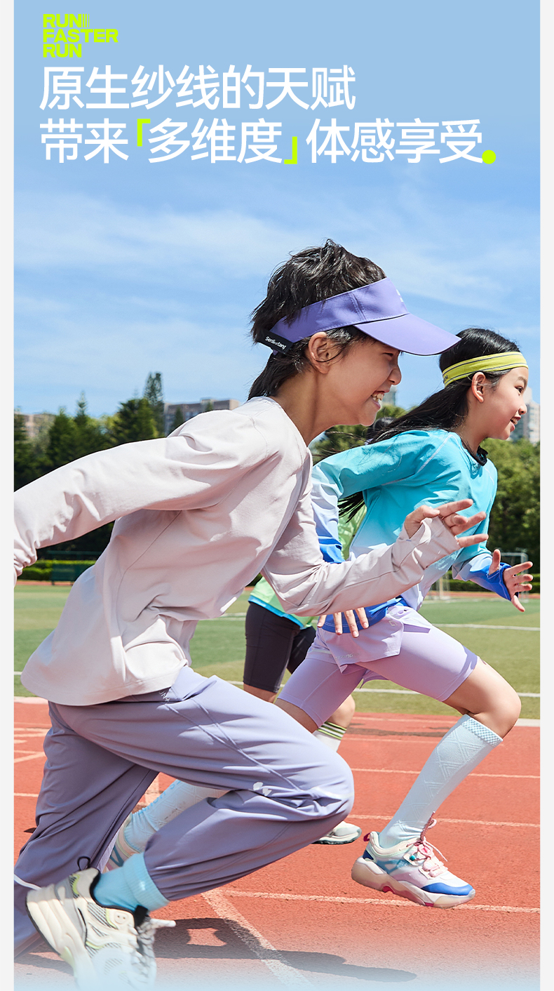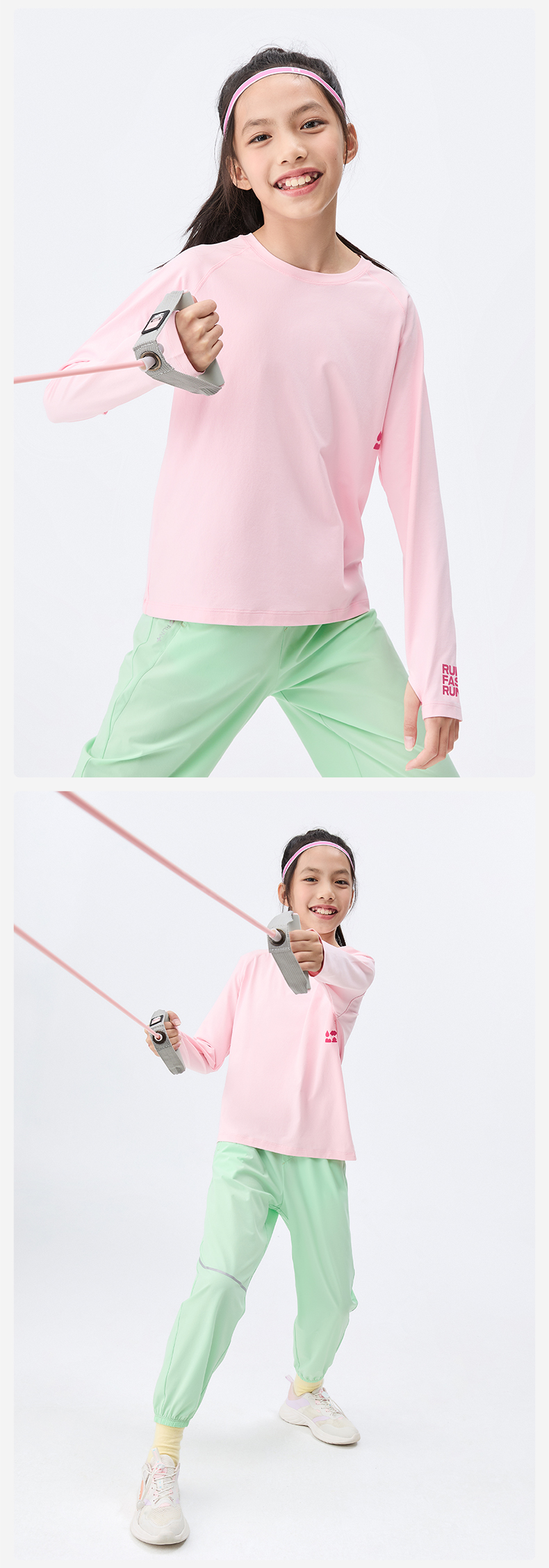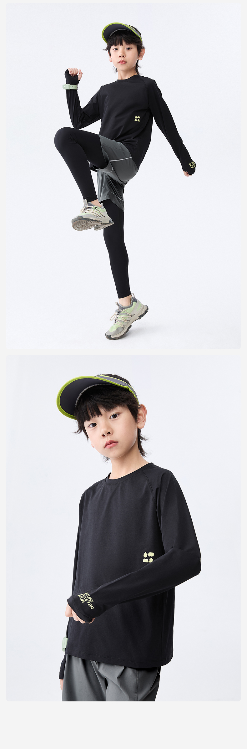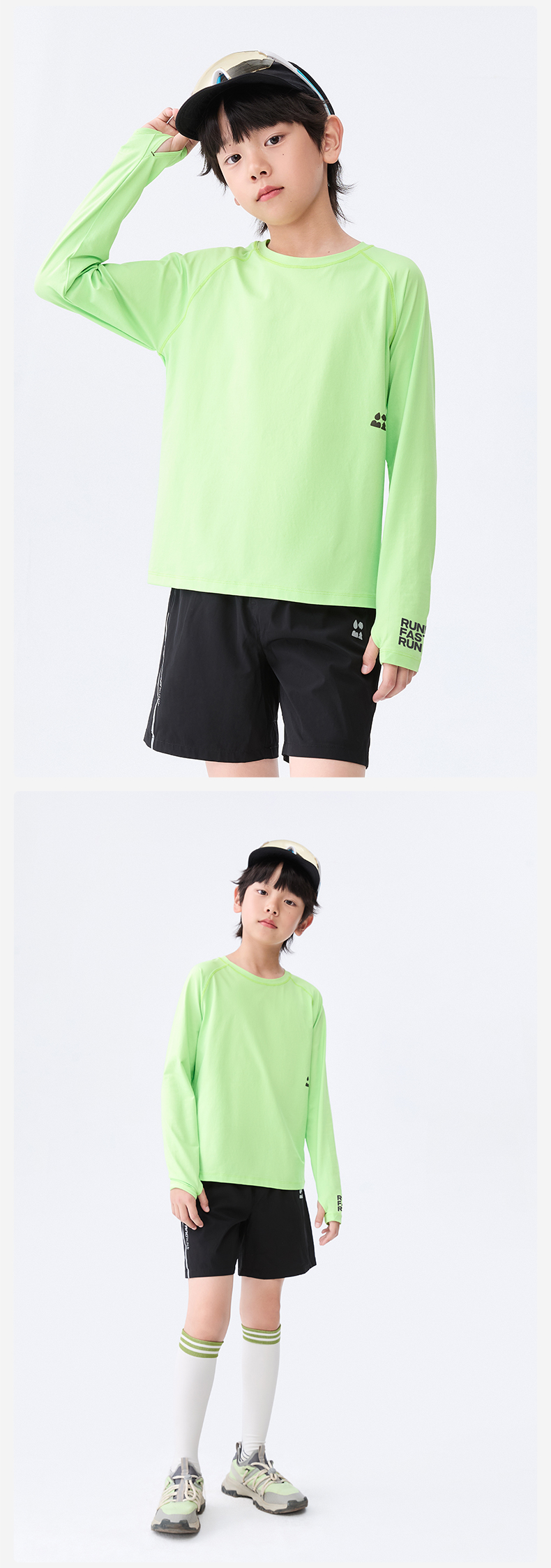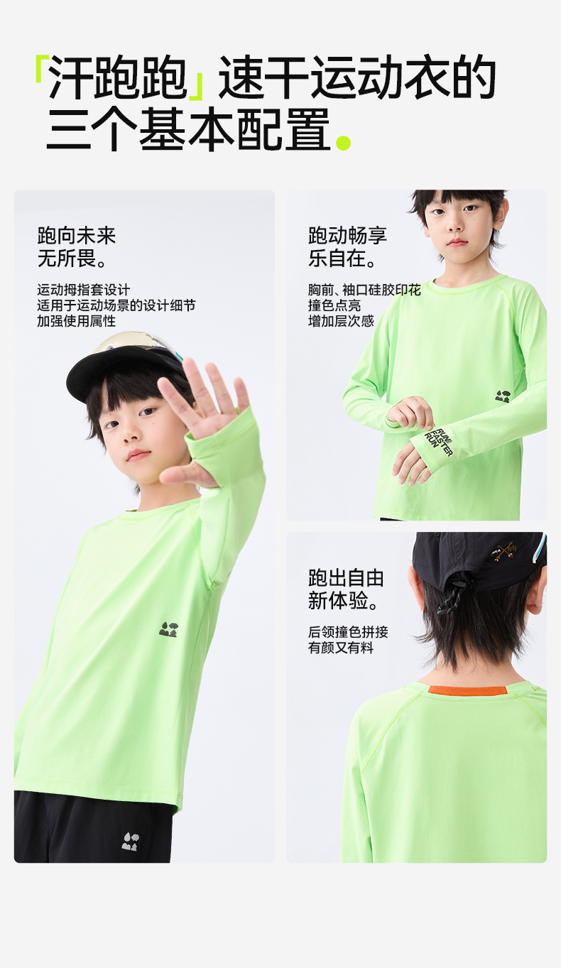 合体的插肩袖运动版型,方便大幅度运动,简约干净的设计,不管是小年龄段,还是大年龄段的孩子穿着都合适,不显幼稚;运动拇指套设计,袖口不易位移,主打一个专业运动