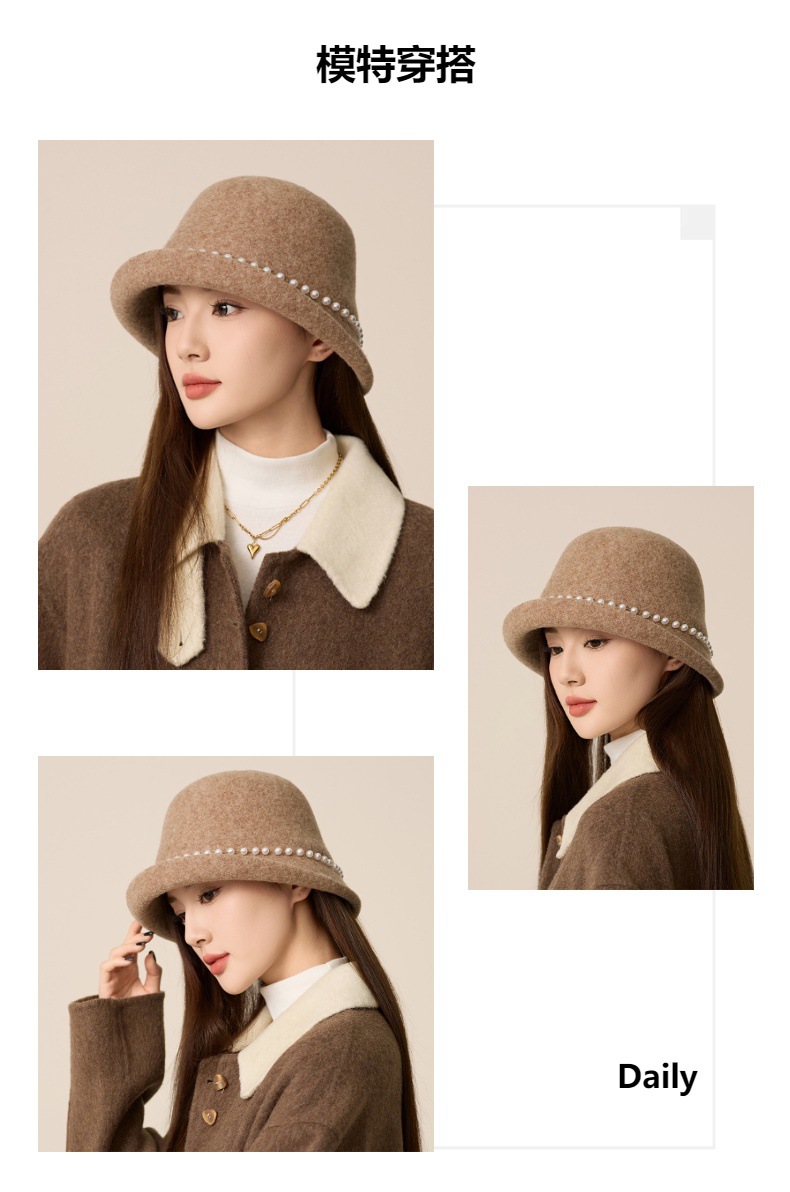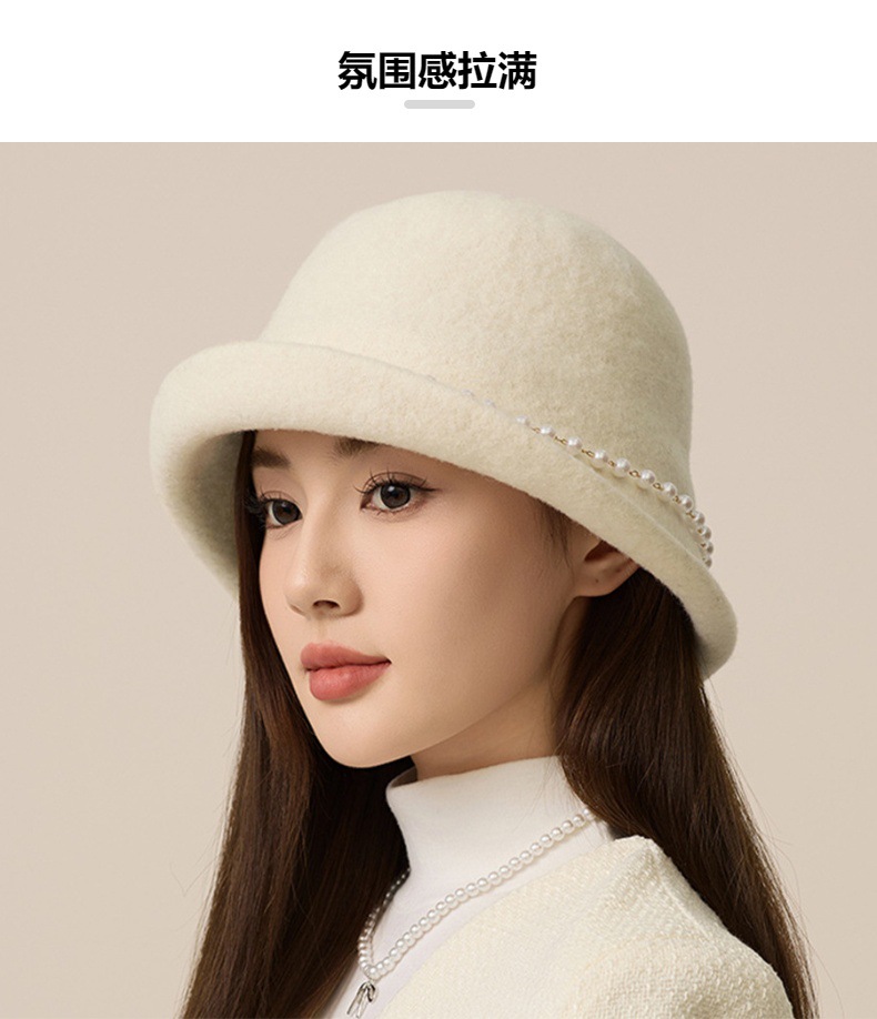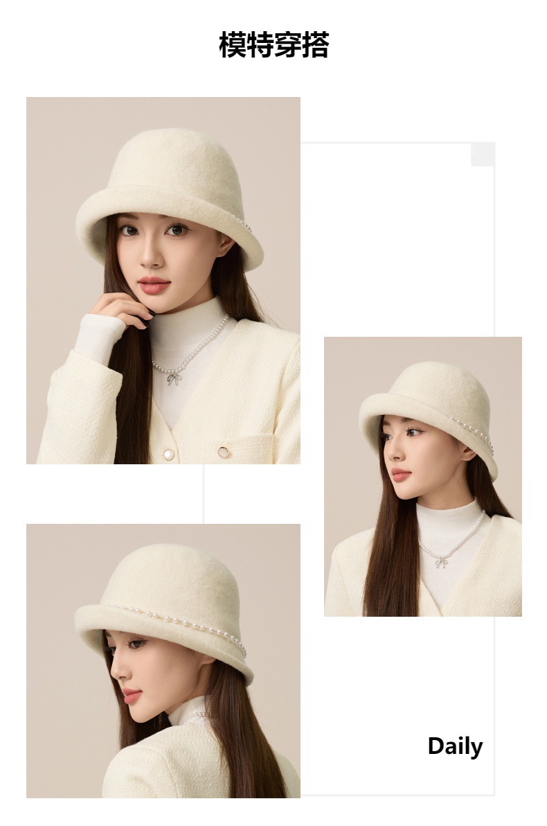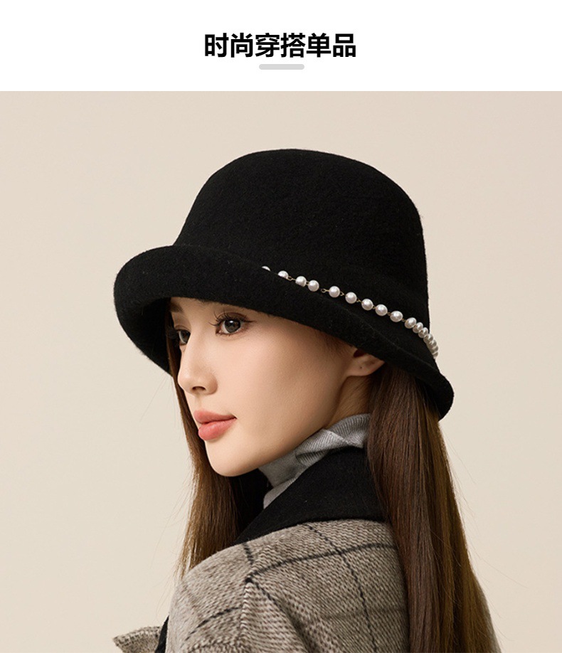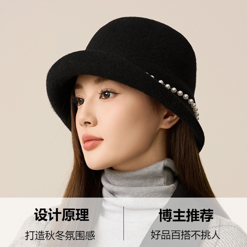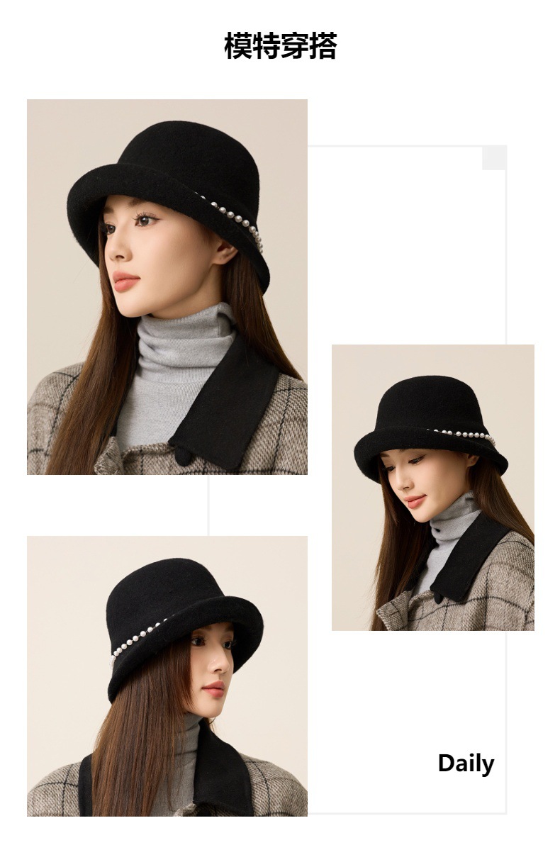 丁摩 名媛小香风珍珠羊毛礼帽法式气质盆帽秋冬天保暖帽子5ZF-M3240