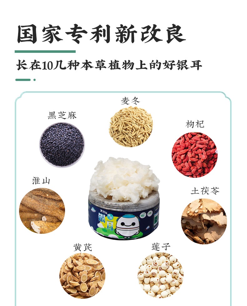 选用了淮山,莲子,土茯苓,枸杞等十几种草本植物培育而成,称为是银耳界的爱马仕,银耳界的白富美。