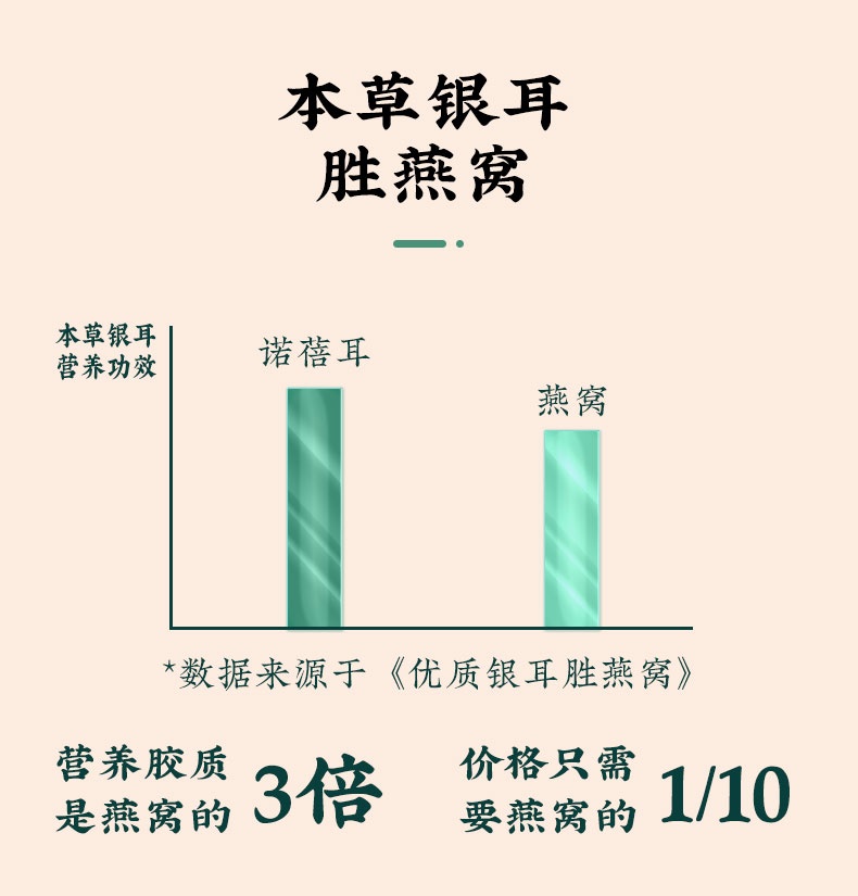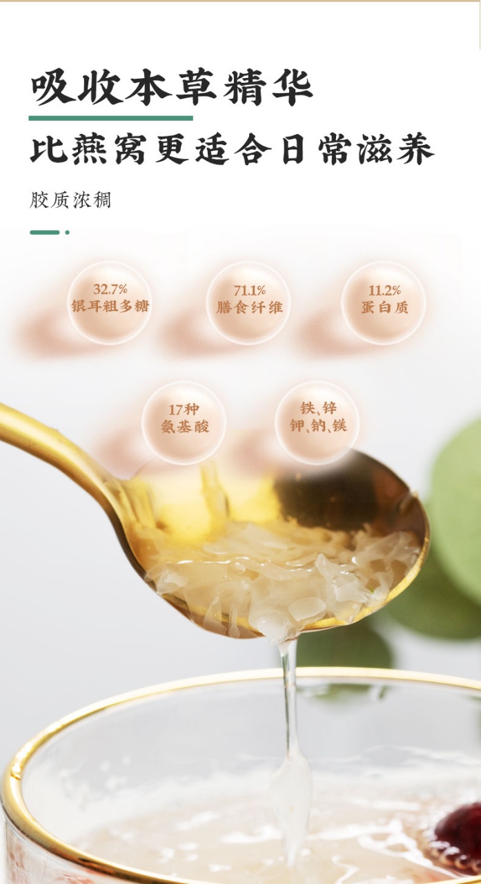 每一罐本草银耳都是由36朵新鲜的本草银耳加工而成 每朵只萃取营养集中的顶端部分。