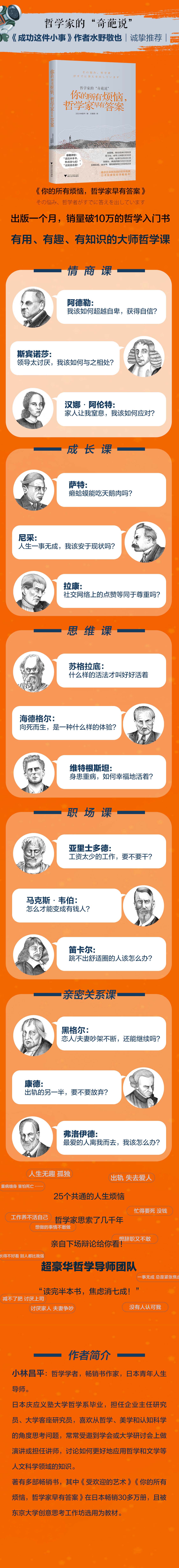 “对未来感到焦虑”“想变成有钱人”“害怕死亡”“不喜欢上司”“总是和伴侣吵架”“穷忙”……当代青年思考的问题和面对的烦恼,其实都是人类共通的焦虑。对于这些人类共同的烦恼,先贤哲人们思辨了几千年,早就给出了解答,只是哲学家的语言通常艰深晦涩,所以一直被大多数人所忽视。