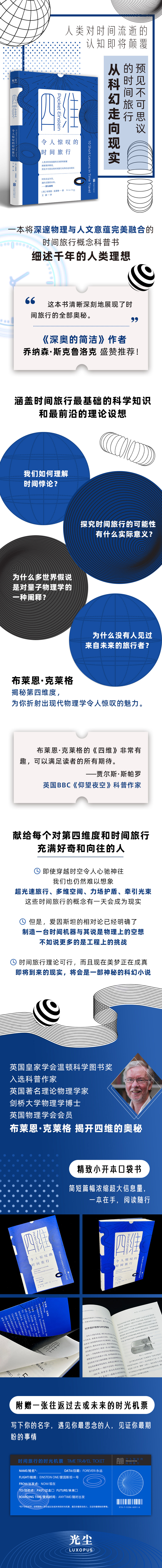 ★深邃物理与人文意蕴的完美融合。穿越时空,对每个人都有诱人的吸引力。谁不想穿越到过去呢?这是一个令人神往的假设。如果能观看或参与历史上的重大事件,看看真相是什么,那就太棒了。或者看看活生生的恐龙在地球上行走,古生物学一定会发生翻天覆地的变化。如果有机会再次见到思念的人,说出从未有机会说出口的话……即将到来的现实,将会是一部神秘的科幻小说,献给每个对第四维度和时间旅行充满好奇和向往的人。