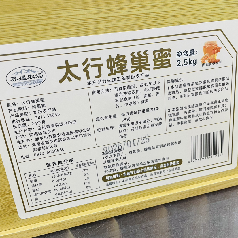 太行蜂巢蜜呈块状,由蜂巢和蜂蜜两部分组成,蜂巢为规则的六边形结构,蜂蜜填充其中,颜色多为金黄或深琥珀色,在阳光下晶莹剔透,宛如琥珀。口感:味道甜润,带有浓郁的花香,轻轻咀嚼,蜜汁会在口中四溢,口感醇厚,且甜而不腻。