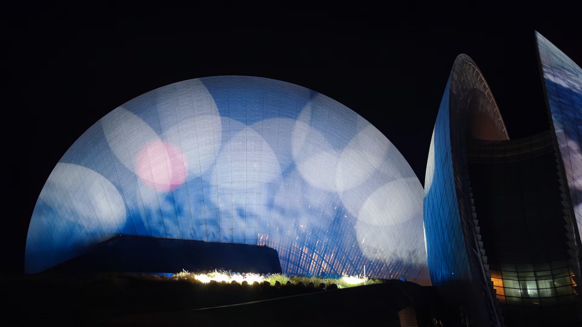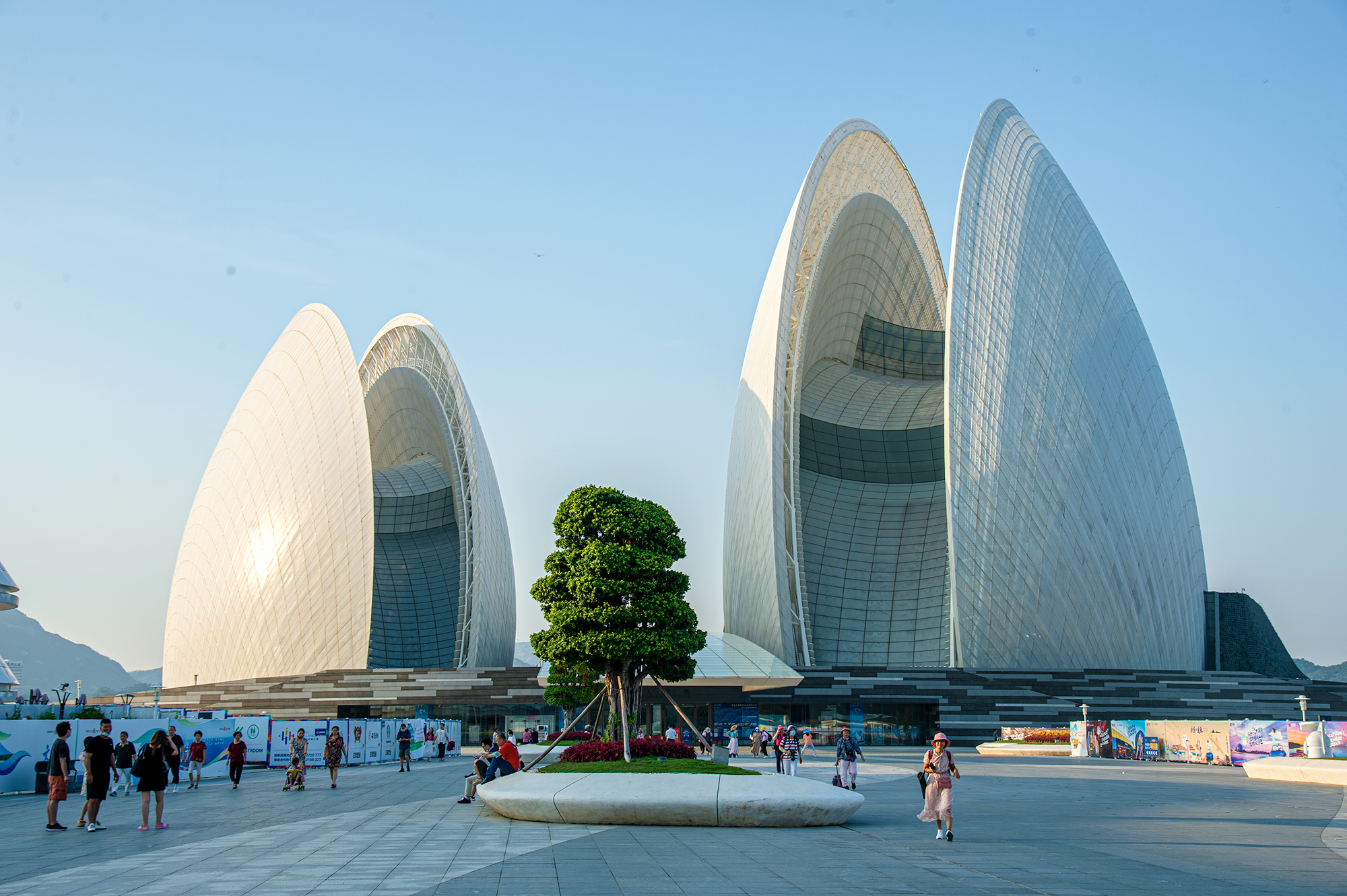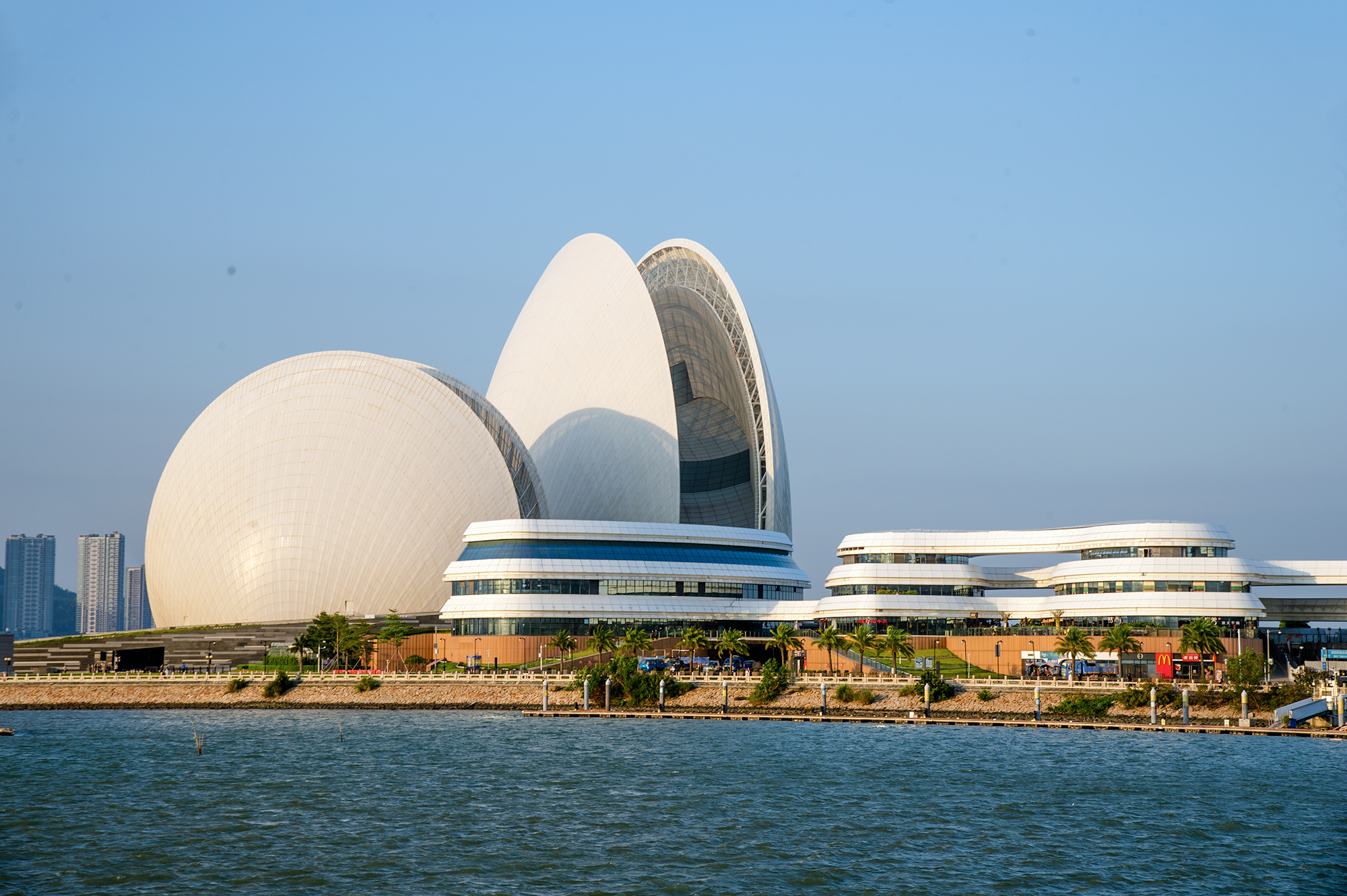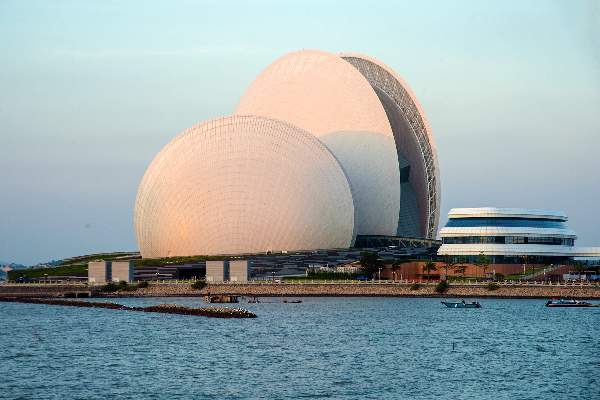 珠海大剧院,就像是一大一小两组“贝壳”的形体。白天呈现半通透效果
