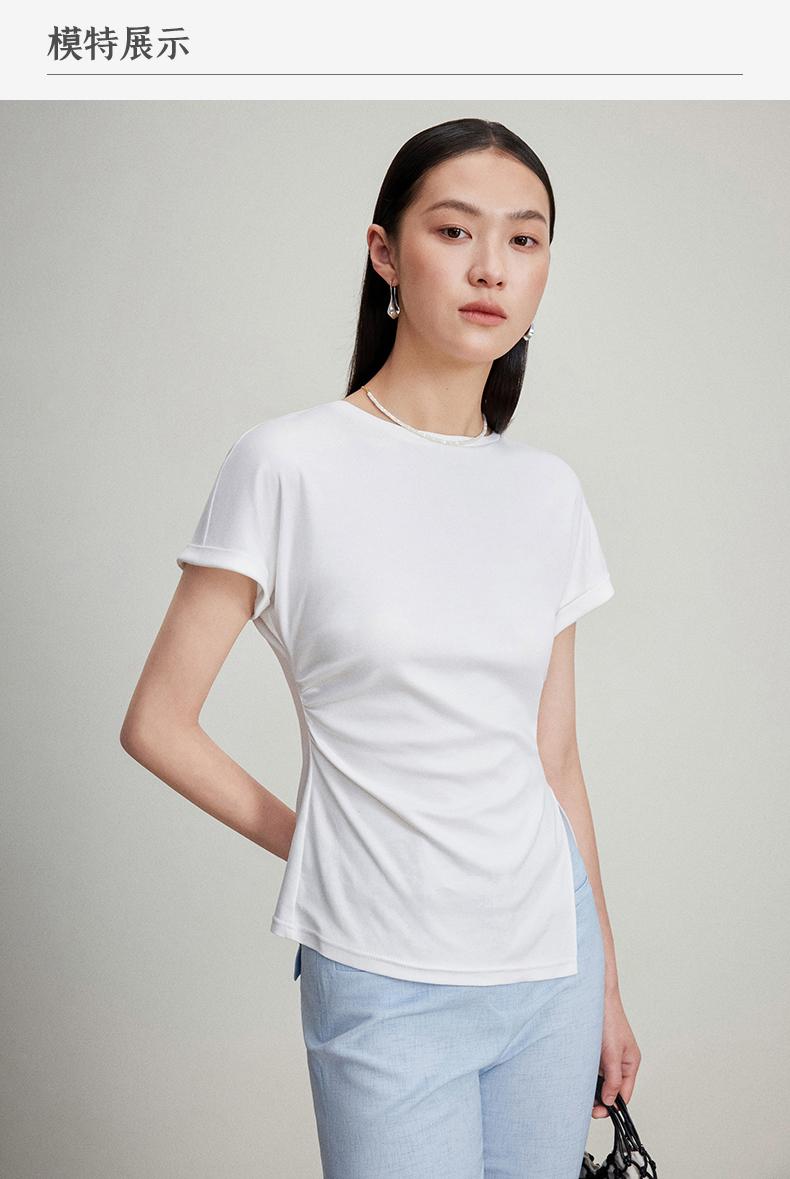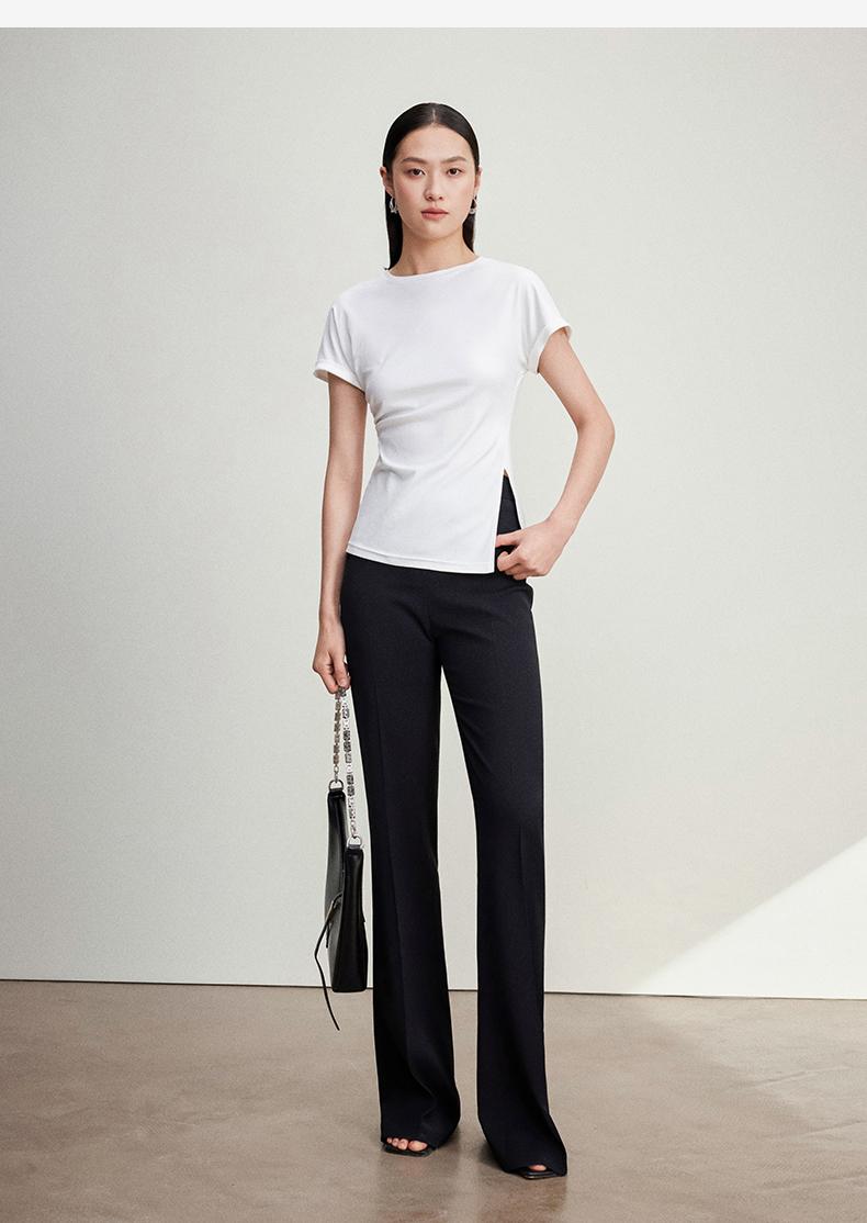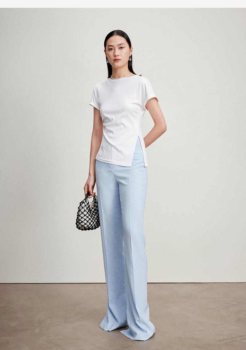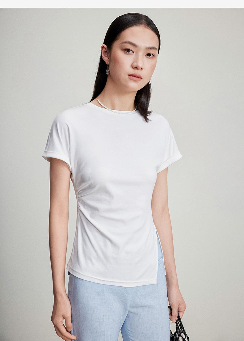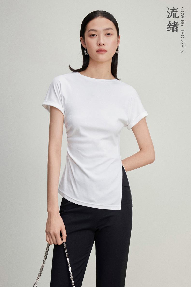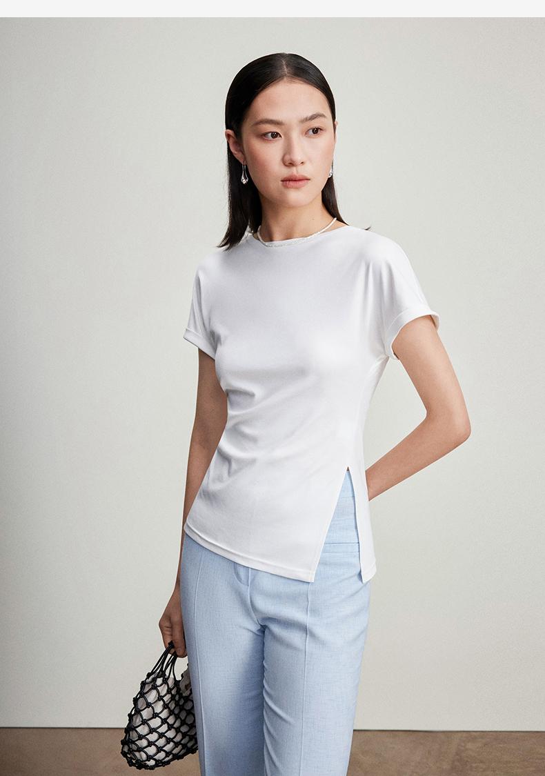 西嘉C+IMPRESS/西嘉时髦不对称侧开衩圆领短袖百搭显瘦高支醋酸棉T恤T2401086