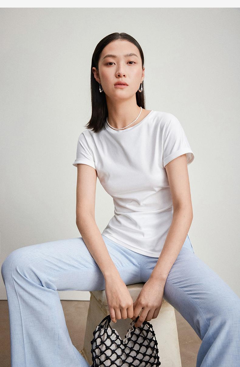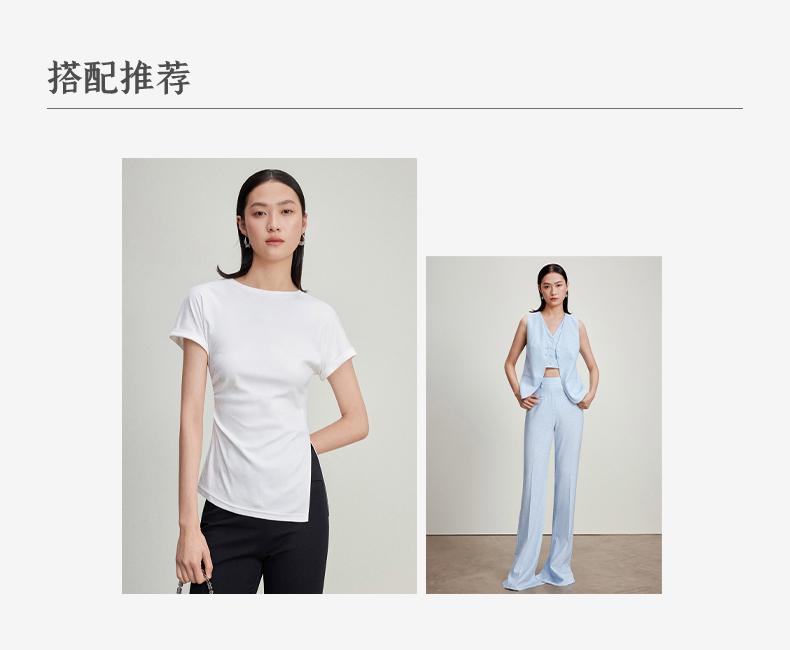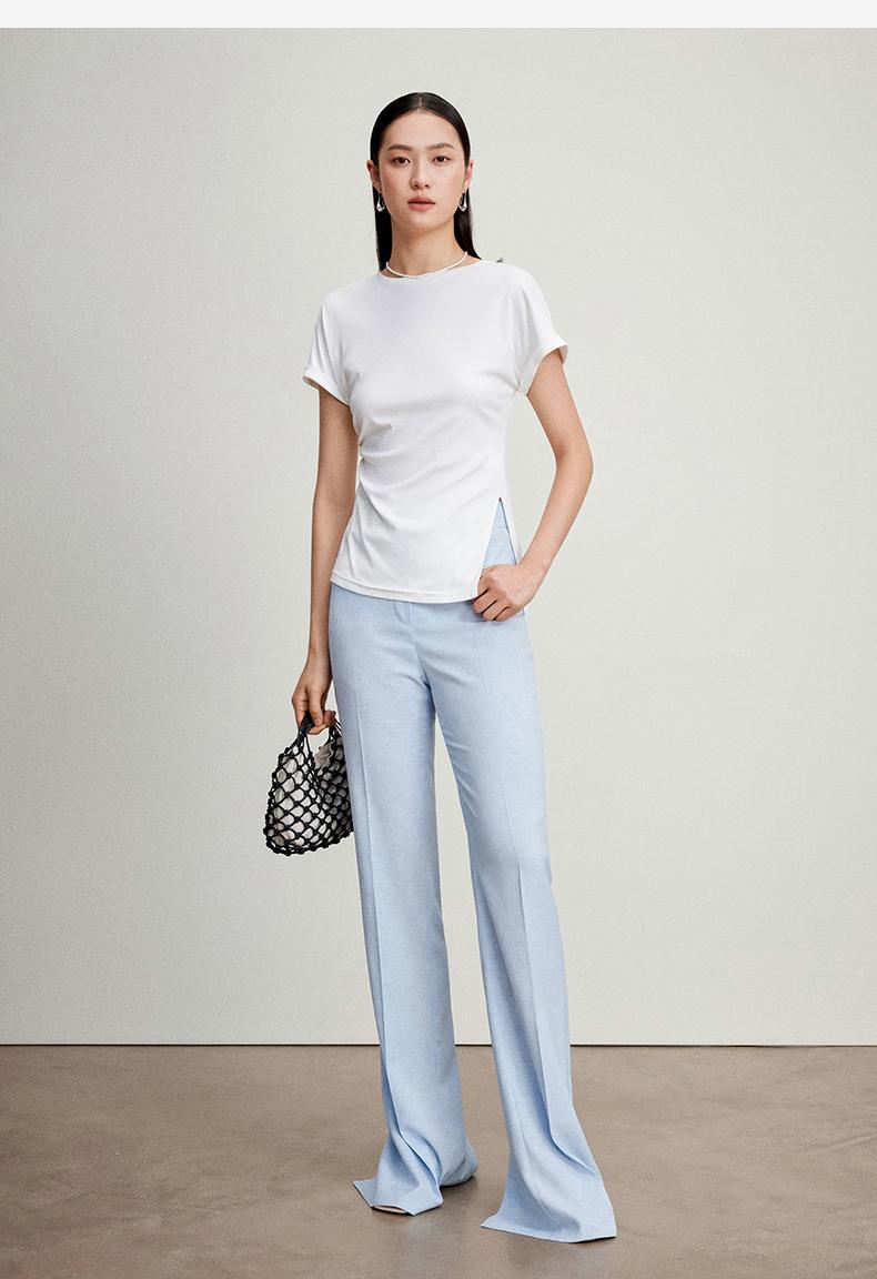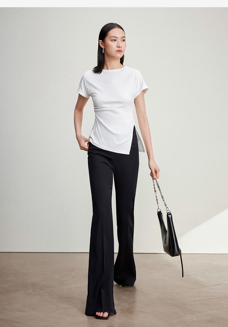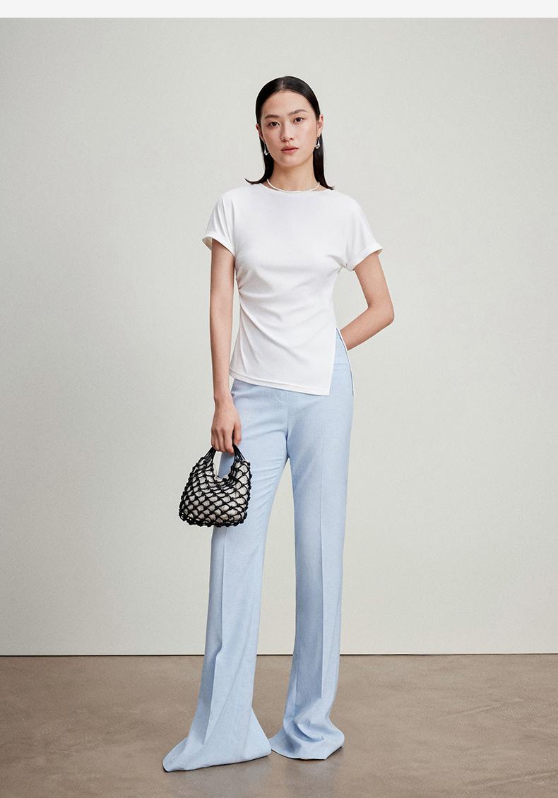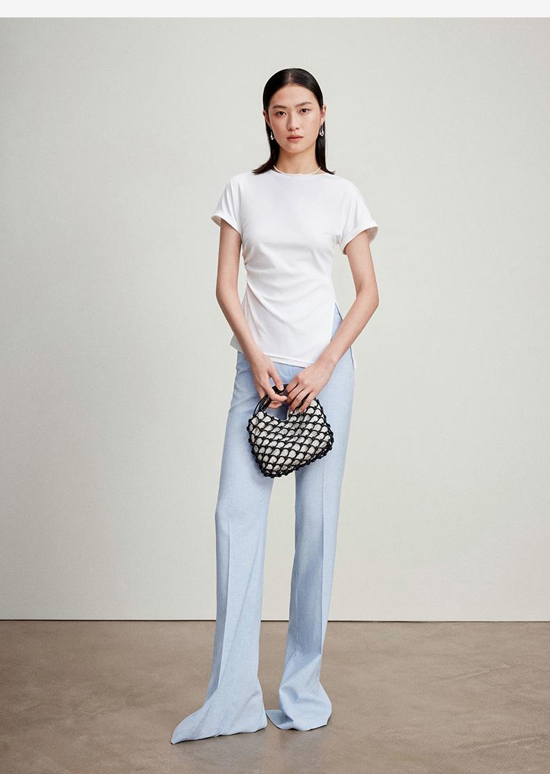 西嘉C+IMPRESS/西嘉时髦不对称侧开衩圆领短袖百搭显瘦高支醋酸棉T恤T2401086
