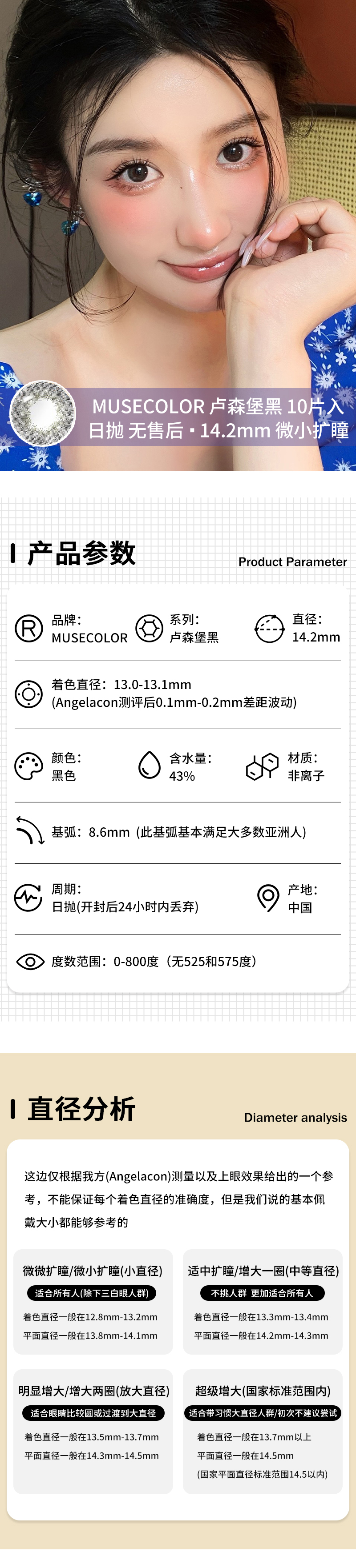 MUSECOLOR / 卢森堡黑 / 10片入 / 美瞳日抛 / 14.2mm / 无售后 / 微小扩瞳素颜提亮明眸款