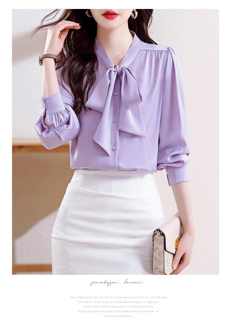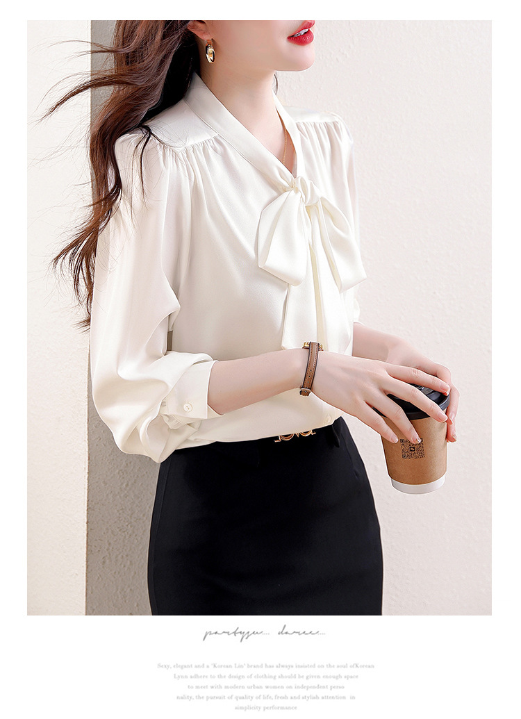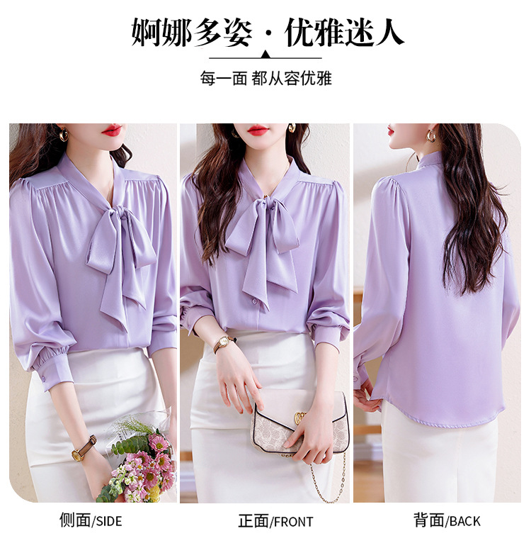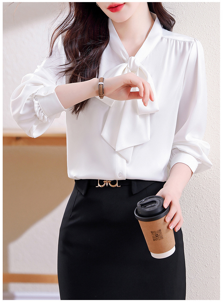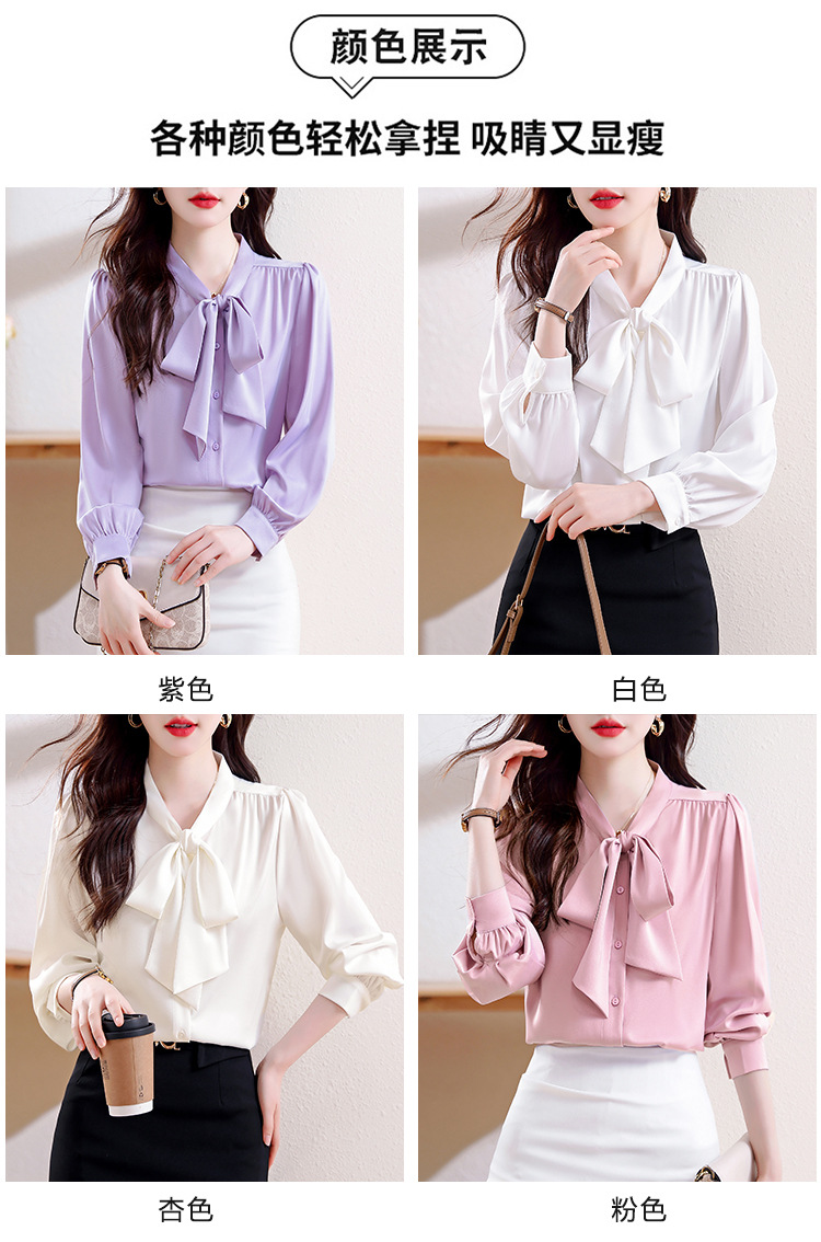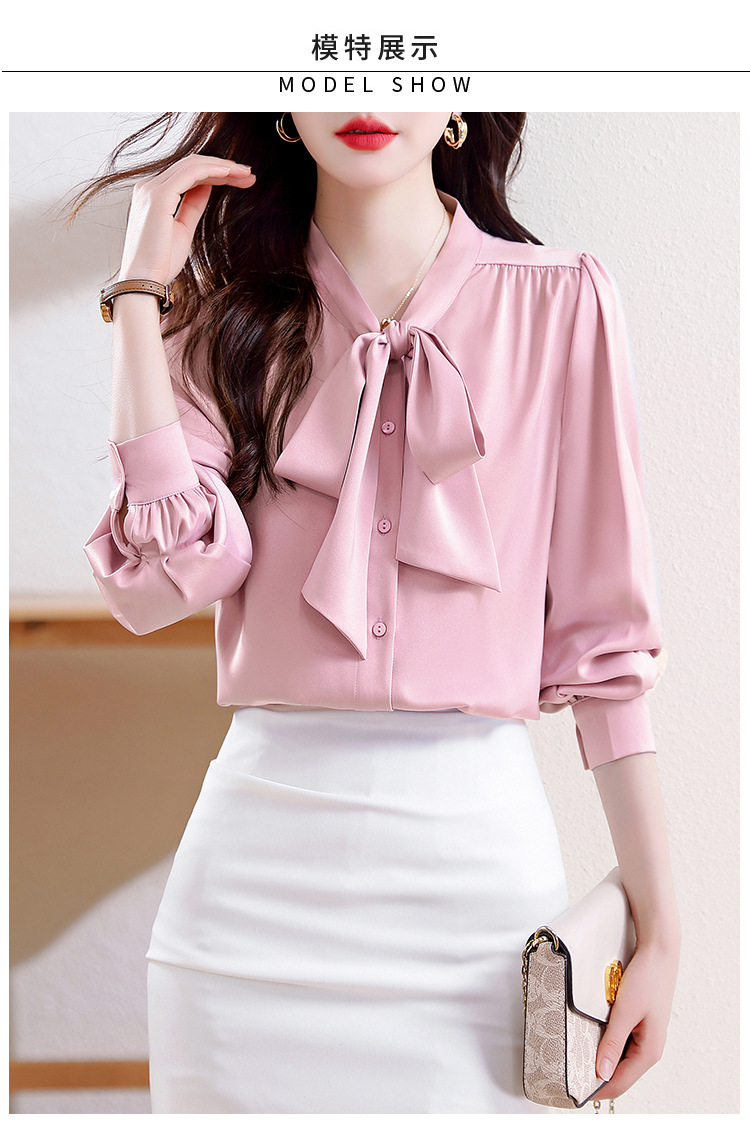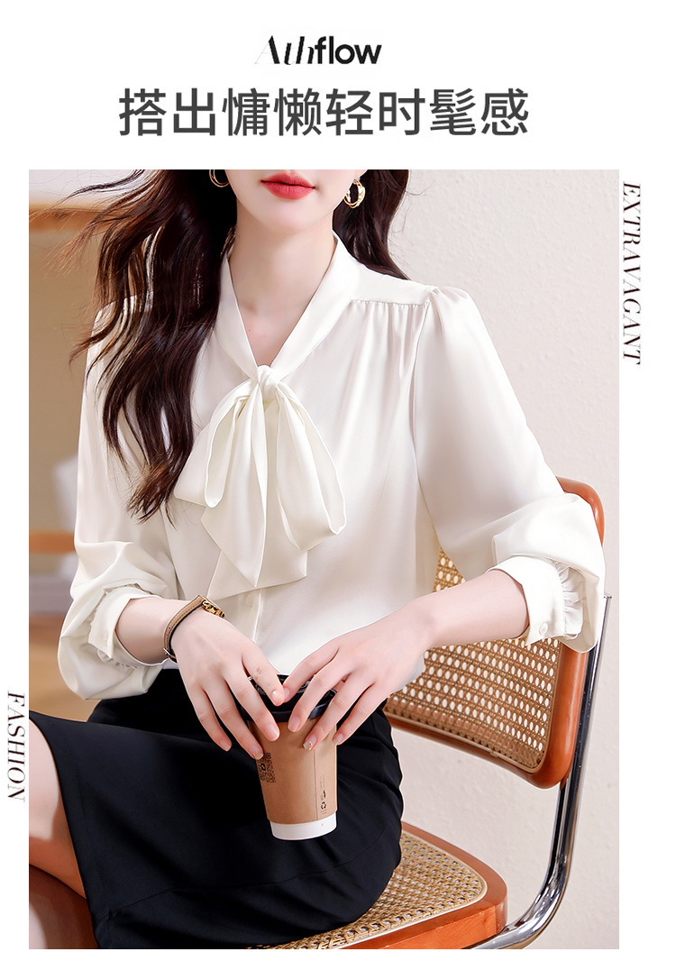KQL现货时尚韩版系带衬衣2025春季新款休闲缎面OL通勤单排扣职业衬衫