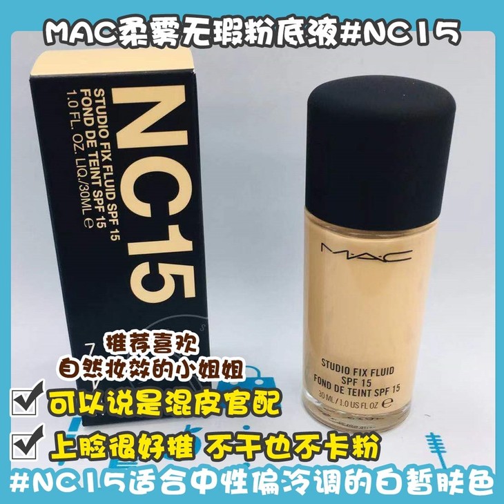 MAC柔雾无瑕粉底液#NC15 👍临近秋冬🍁底妆又开始趋于“柔雾感妆容”啦🌬!这款无暇粉底液火到被称为血洗微博和B站🔥🔥,主打偏哑光感奶油肌,控油持久不脱妆😊!上脸很好推,不干也不卡粉并且上妆的质感并不厚重👅,上妆完就是奶油肌效果的半雾面妆☁,越油越美💫~遮瑕力和控油效果也是值得表扬的,润而不油💦,可以说是混皮官配啦👉#NC15适合中性偏冷调的白皙肤色,推荐喜欢自然妆效的小姐姐~