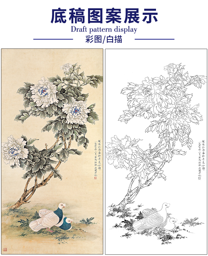 于非闇花鸟工笔画白描底稿《和平富贵》鸽子牡丹临摹勾线高清打印稿HS17
