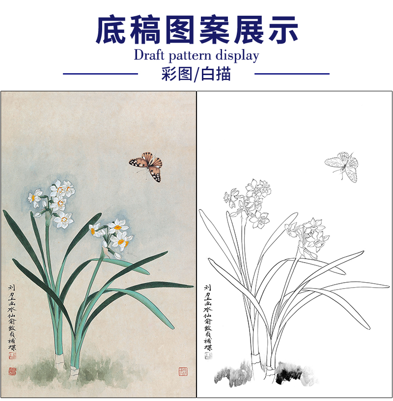 俞致贞花鸟工笔画白描底稿竖幅《水仙蝴蝶》临摹勾线高清打印稿ZZ31