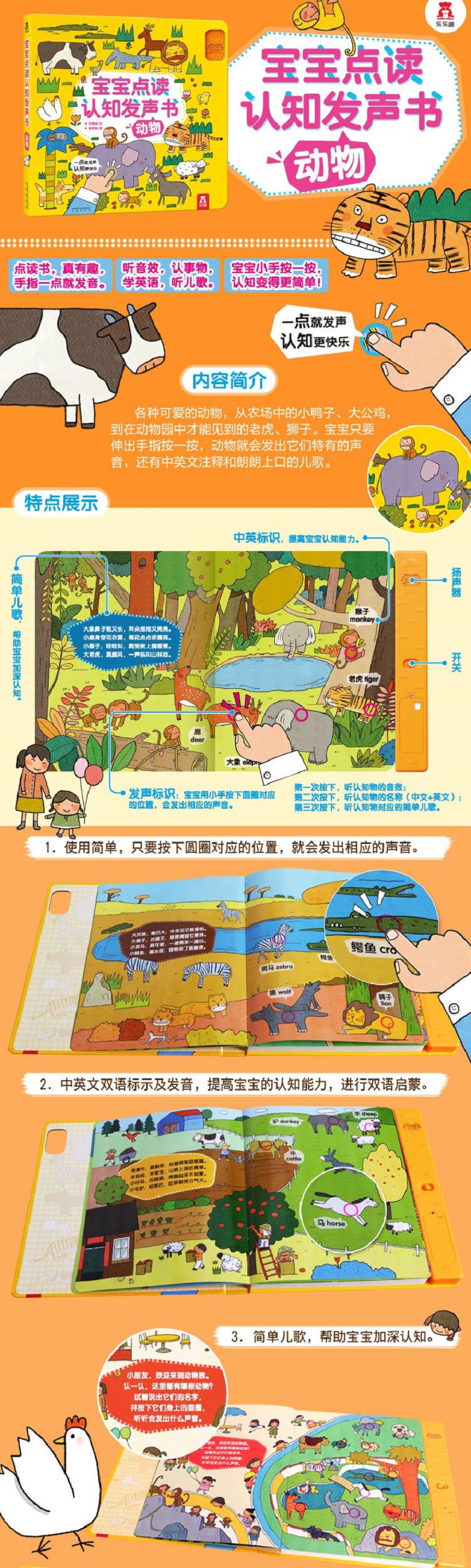 1.使用简单,只要按下圆圈对应的位置,就会发出相应的声音。 2.中英文双语标示及发音,提高宝宝的认知能力,进行双语启蒙。 3.简单儿歌,帮助宝宝加深认知。