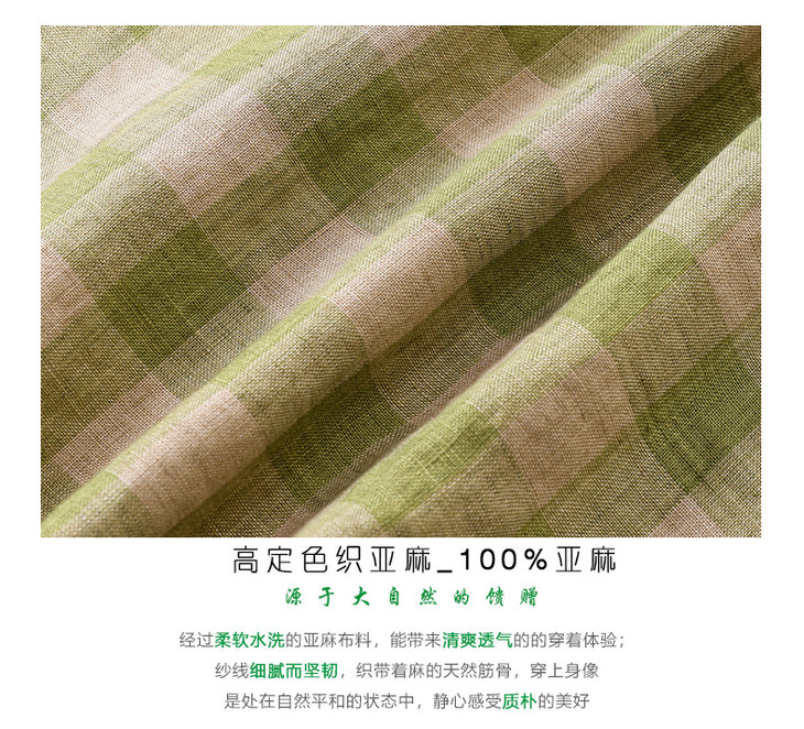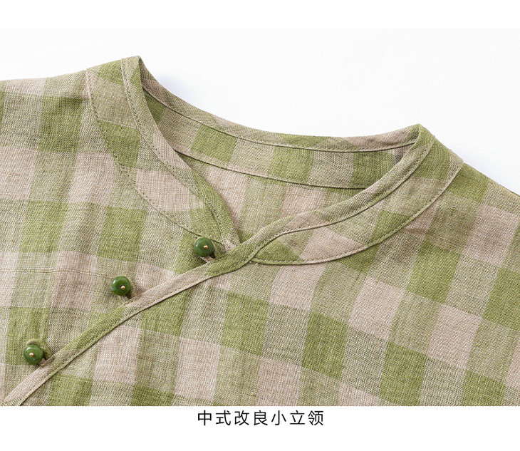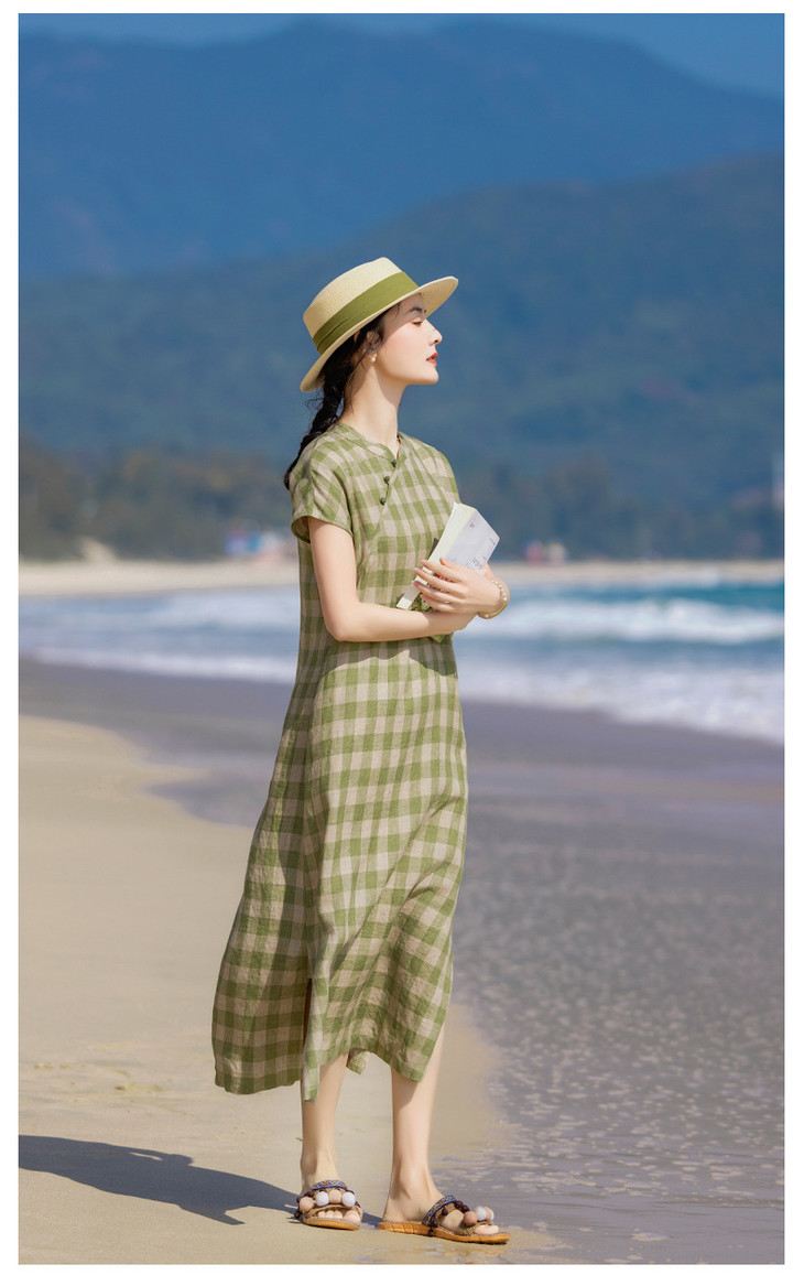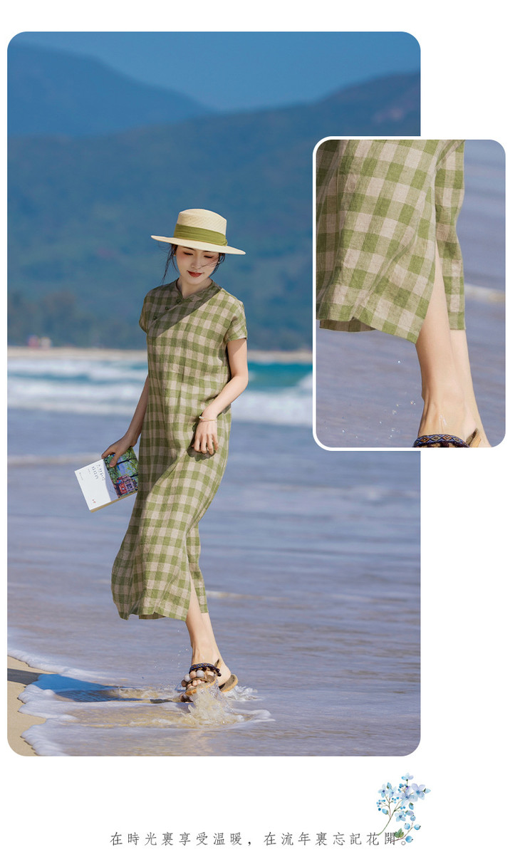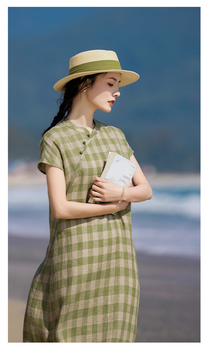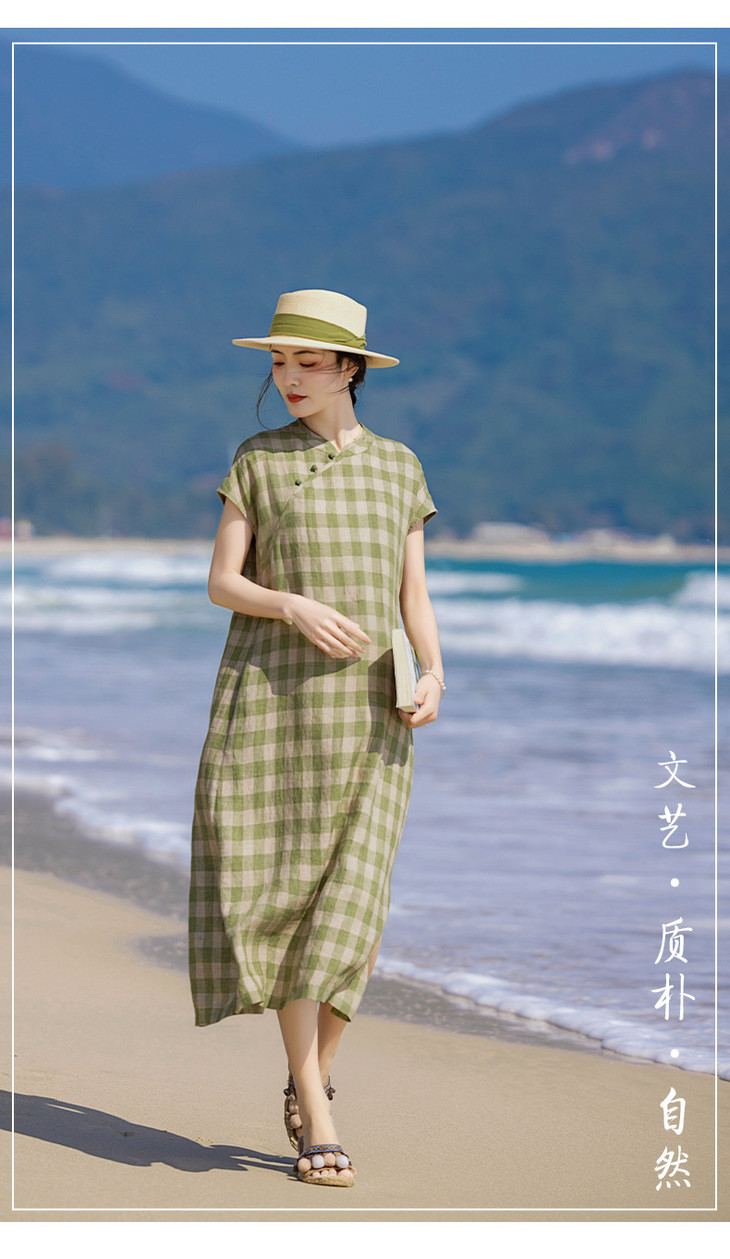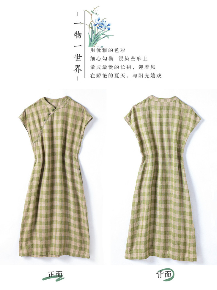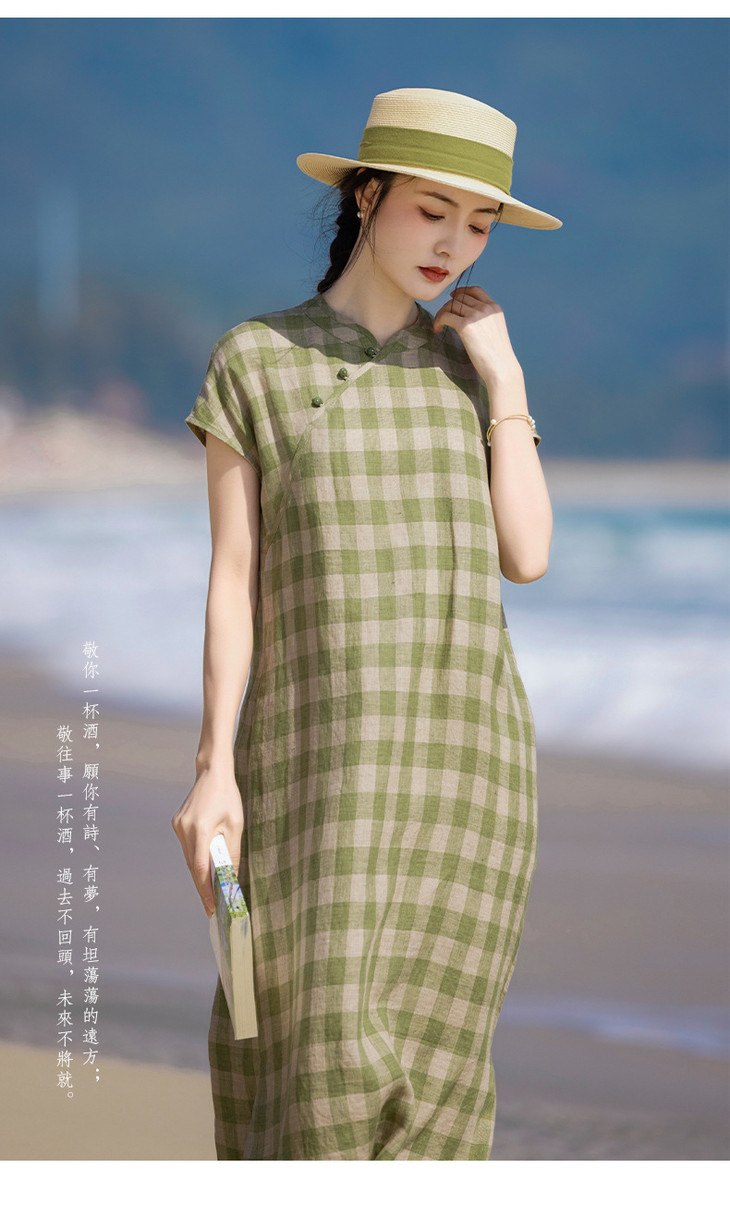 HM复古格纹色织亚麻改良旗袍 2024春夏原创新款国风无袖立领连衣裙