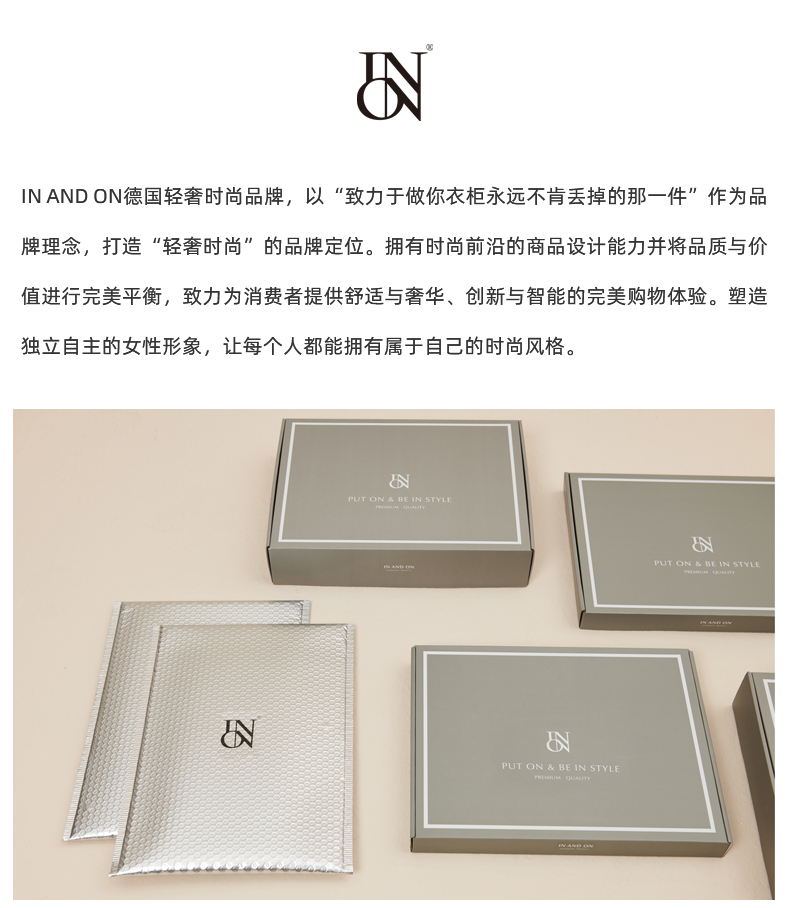IN AND ON—轻奢时尚品牌,以“致力于做你衣柜永远不肯丢掉的那一件”作为品牌理念,打造“轻奢时尚”的品牌定位。拥有时尚前沿的商品设计能力并将品质与价值进行完美平衡,致力为消费者提供舒适与奢华、创新与智能的完美购物体验。塑造独立自主的女性形象,让每个人都能拥有属于自己的时尚风格。