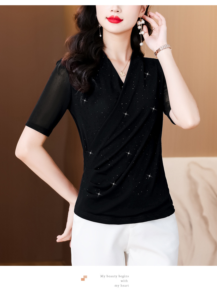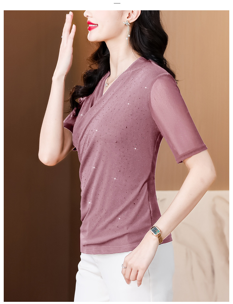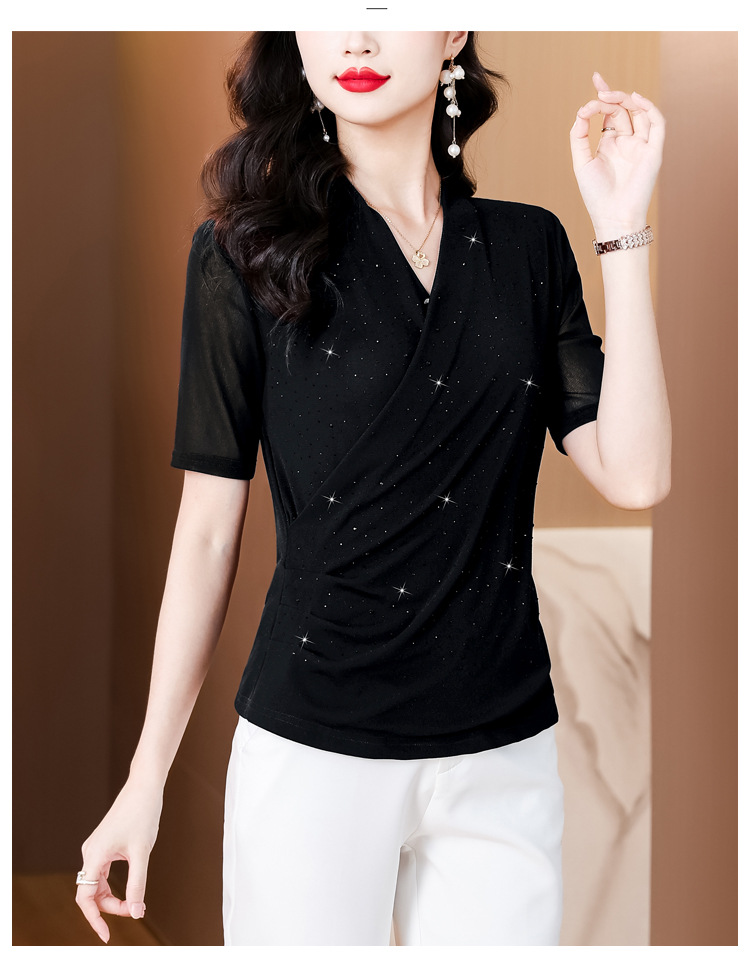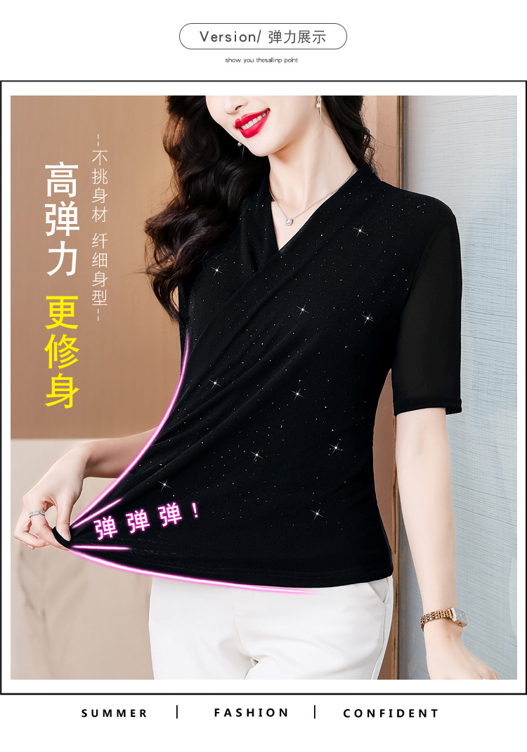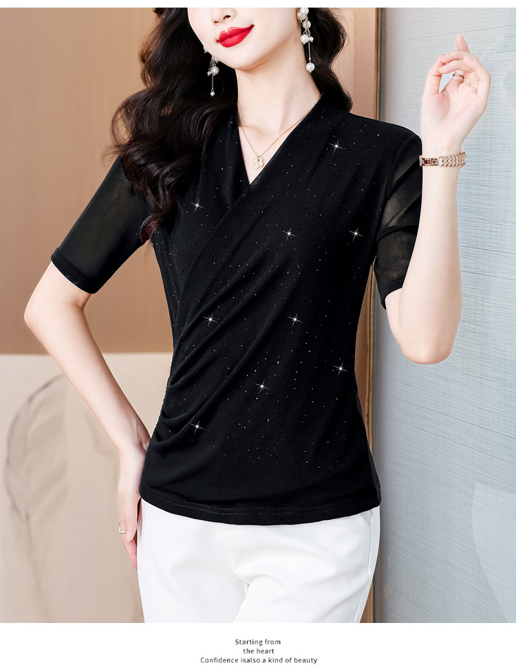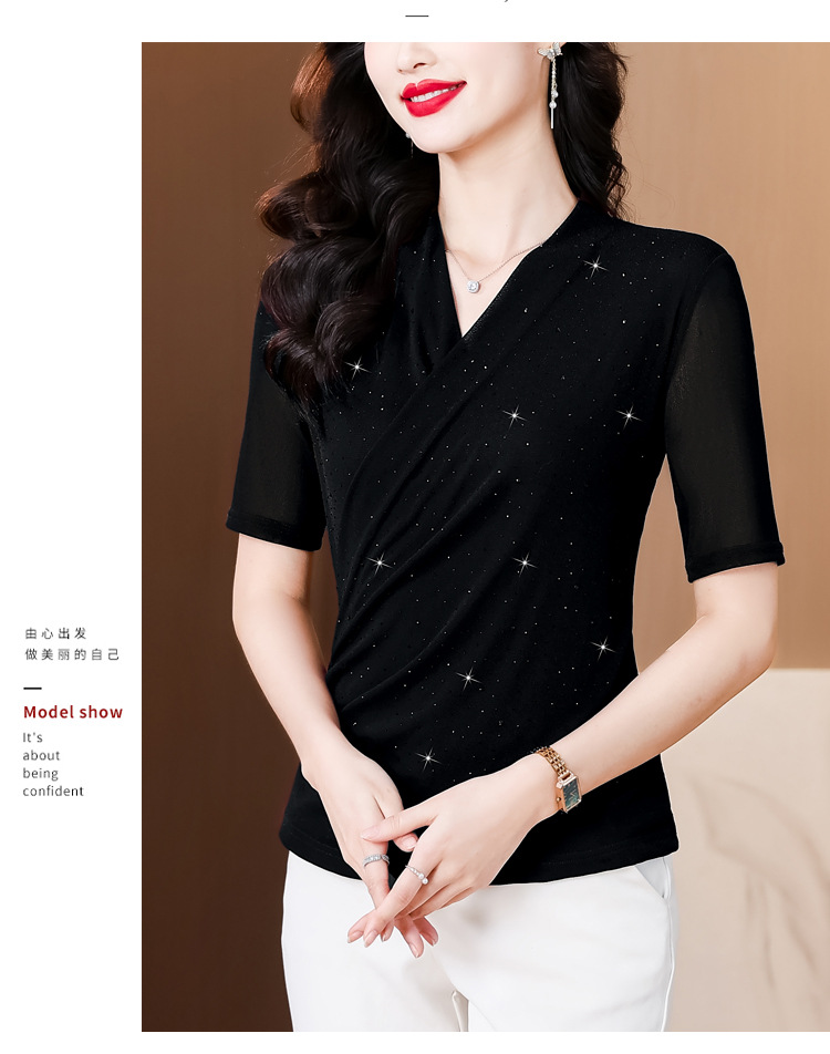 KQL B12N2802烫钻时尚洋气小衫网纱显瘦V领打底衫