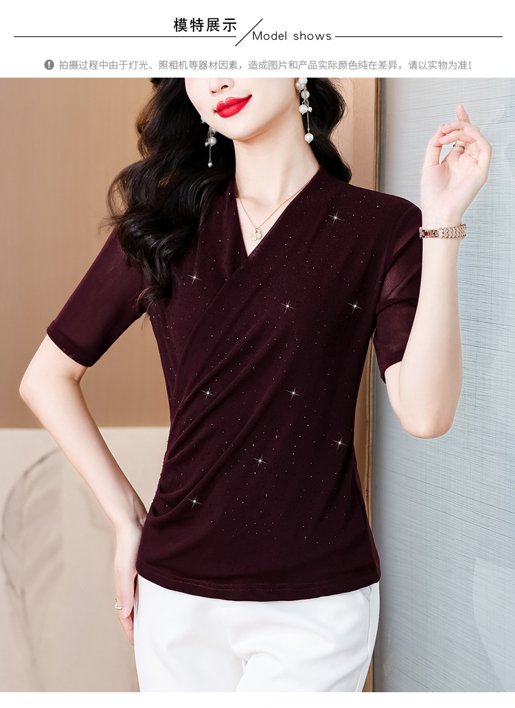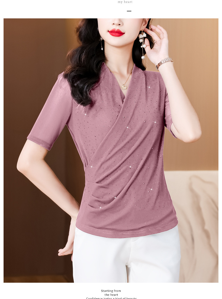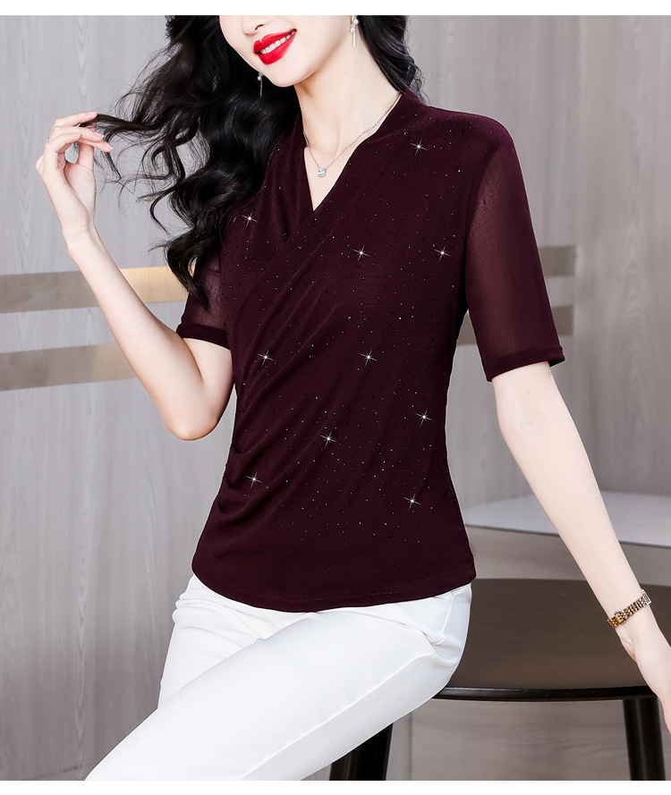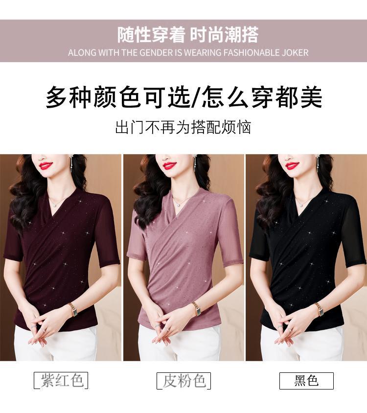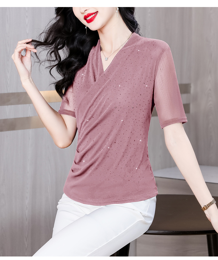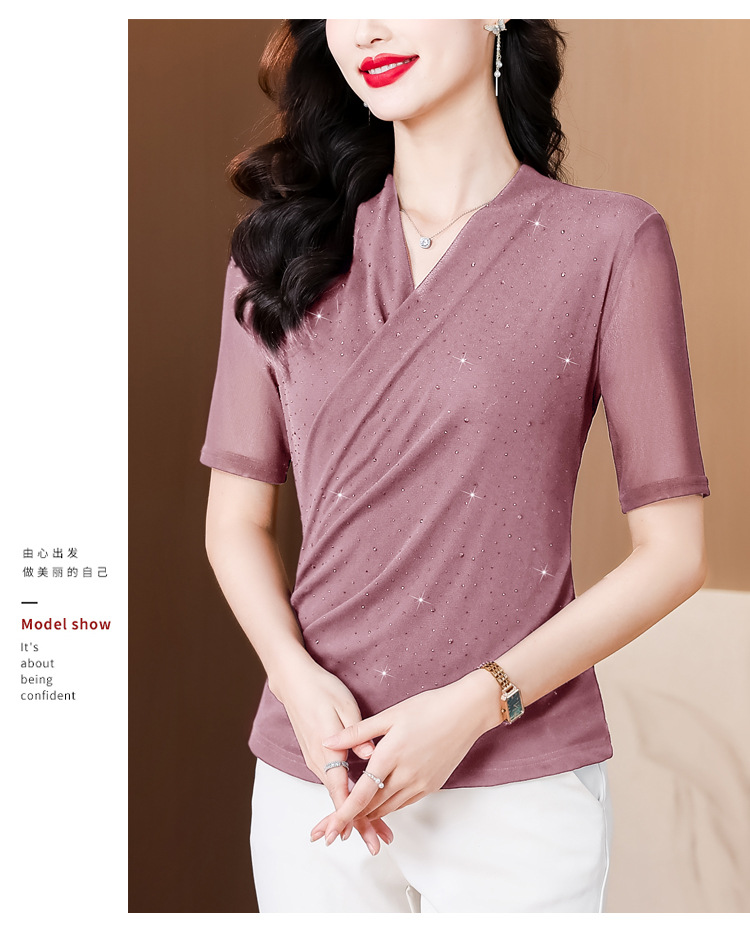 KQL B12N2802烫钻时尚洋气小衫网纱显瘦V领打底衫