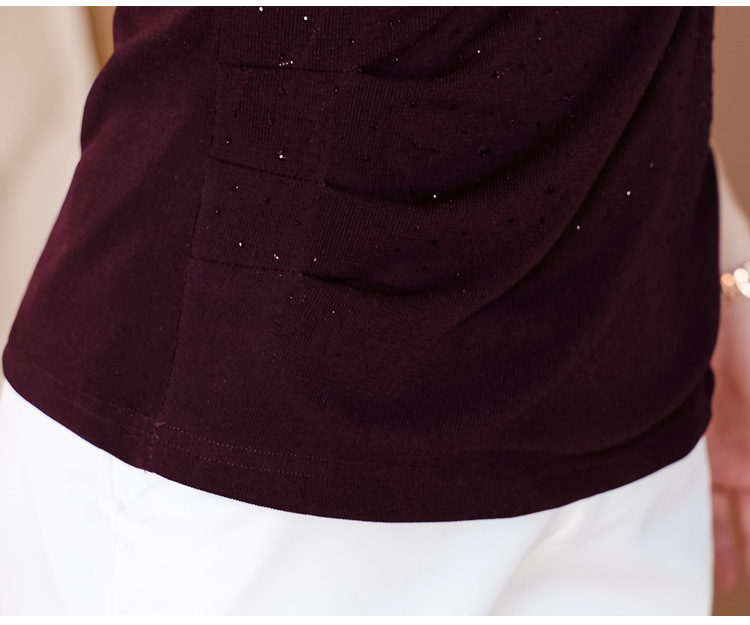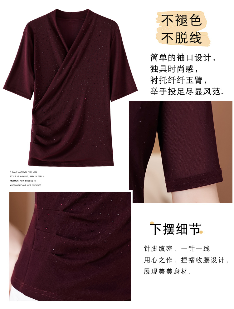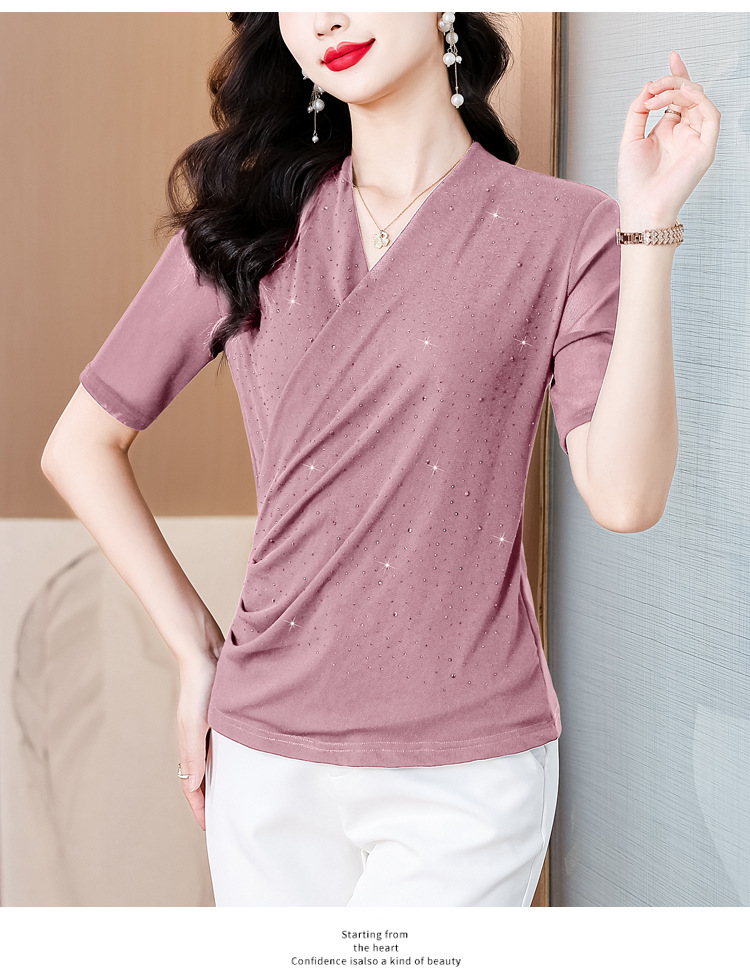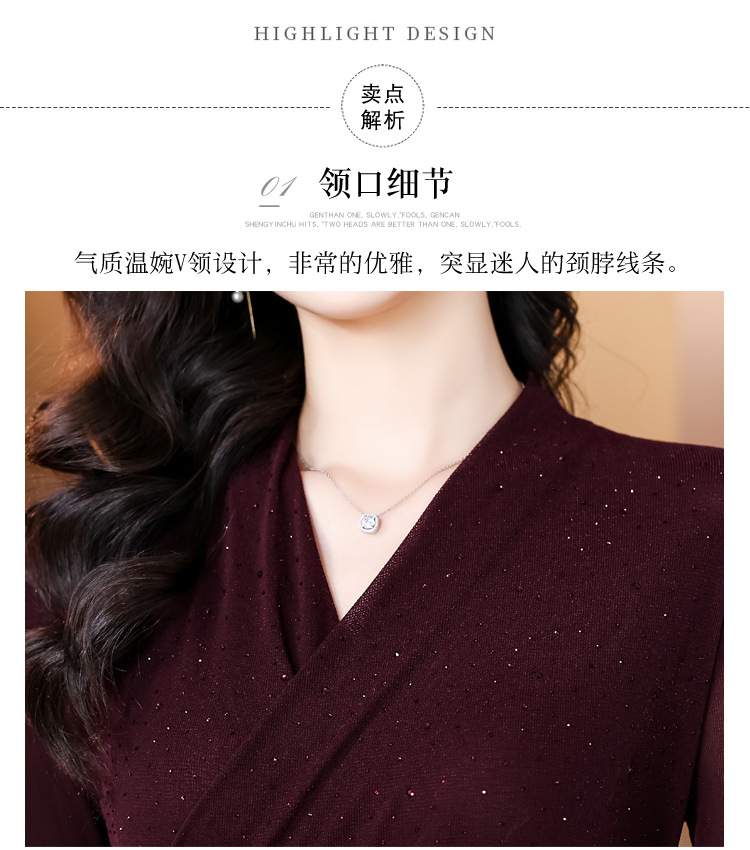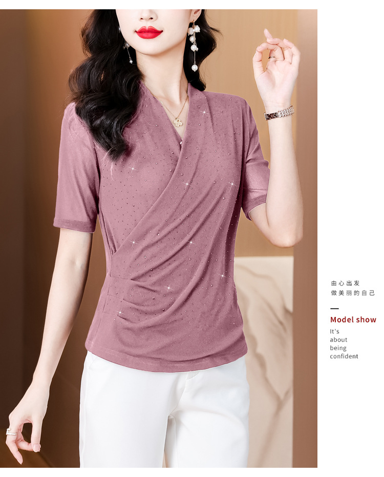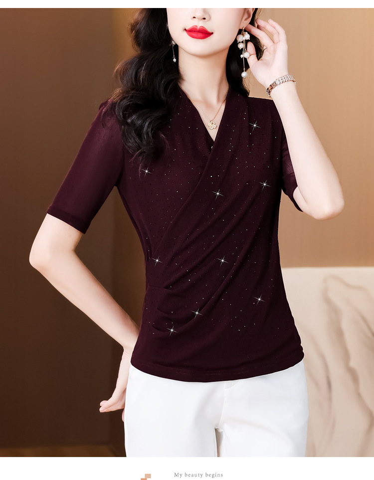 KQL B12N2802烫钻时尚洋气小衫网纱显瘦V领打底衫