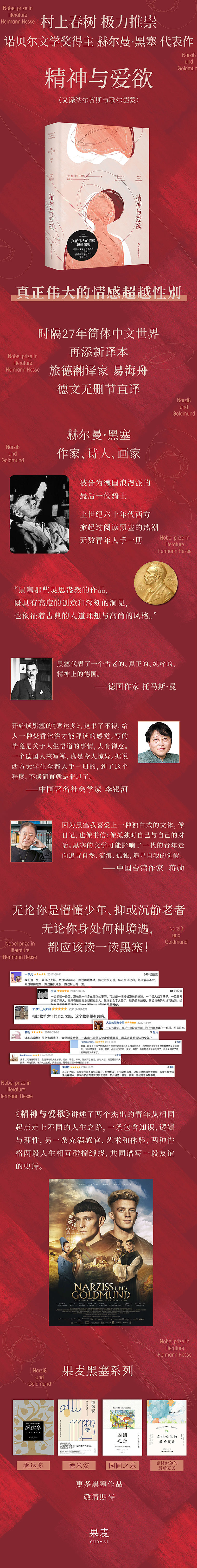《精神与爱欲》(Narzi? und Goldmund)是诺贝尔文学奖得主赫尔曼·黑塞的长篇小说代表作,写作于《德米安》《悉达多》《荒原狼》之后。小说讲述了两个才华横溢但天性迥异的青年纳尔齐斯与歌尔德蒙的一生。玛利亚布隆修道院的年轻学者纳尔齐斯天资出众、才华过人,一直严于律己,秉持着成为一名崇尚逻辑与理性的神学家的理想,而作为新人入学的歌尔德蒙原本秉承父亲的愿望希望成为一名修士,但偶然中发现了世俗生活的乐趣。二人虽然被对方独特的气质所吸引,但天性的差异使两人走上了截然不同的道路。歌尔德蒙以少年之躯游历四方,品尝了爱情与感官之乐,学习了雕刻的艺术,熬过瘟疫与死神。多年过去,歌尔德蒙因偷情而被投入牢房,却在行刑前被那个一直活在灵魂里的故人所救,两段生命历史终又交织在一起……