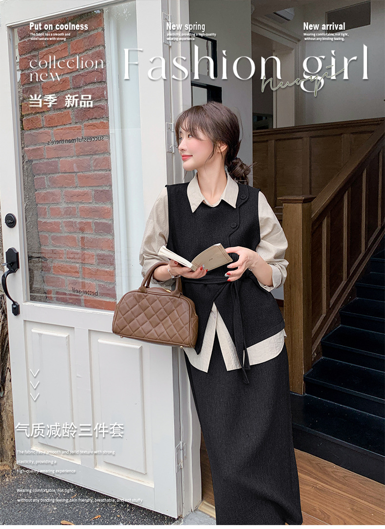 HR2C075W6036 黑色韩系高级感马甲套装裙女春2025新款气质衬衫半身裙三件套 商品图0