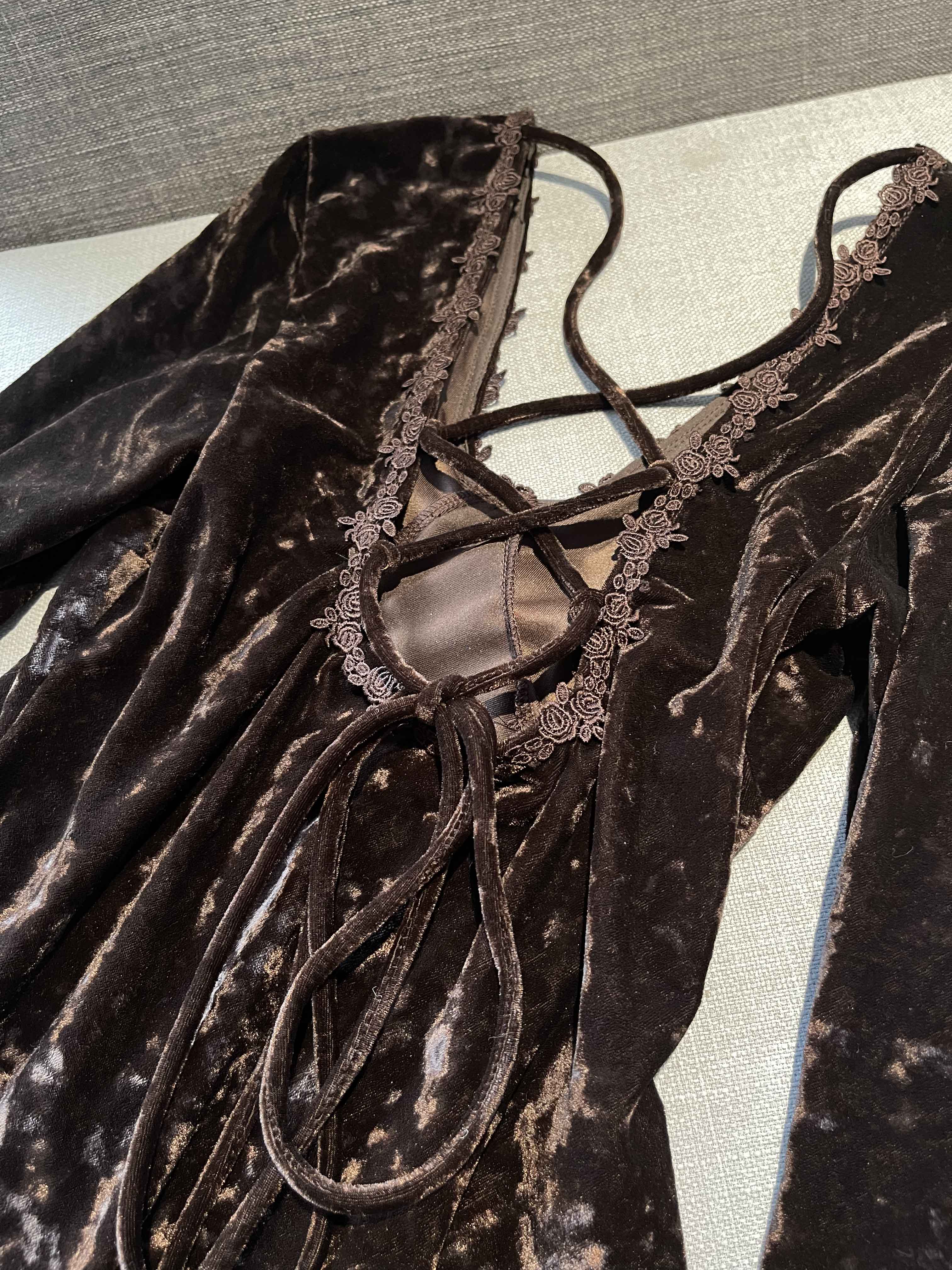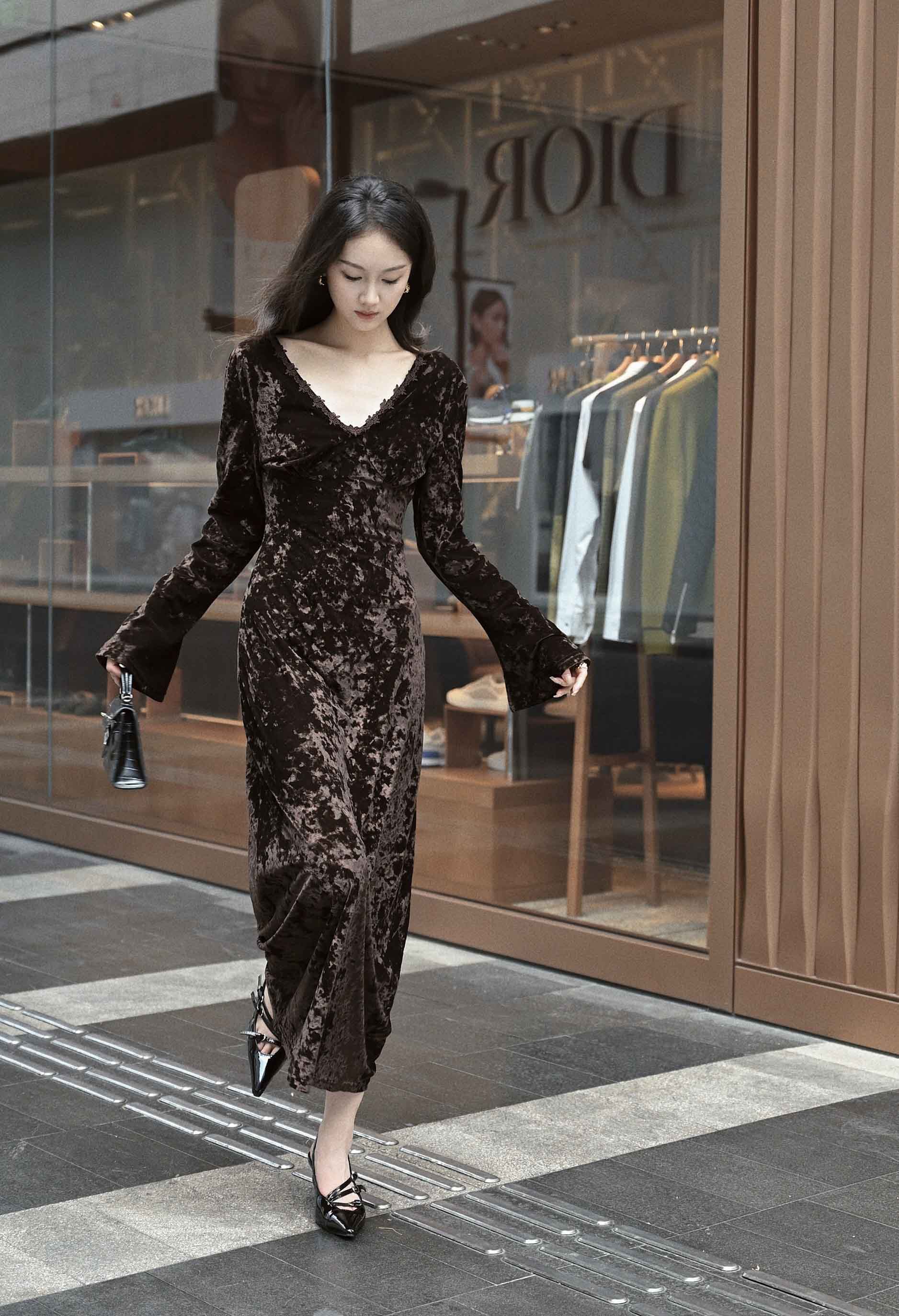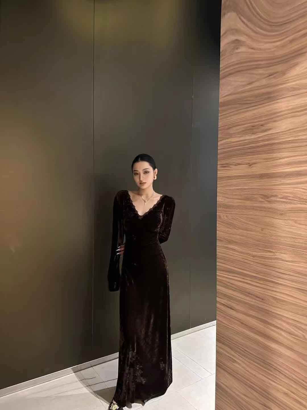 自带温润光泽的丝绒连衣裙,后背绑带镂空,上街回头率chao高