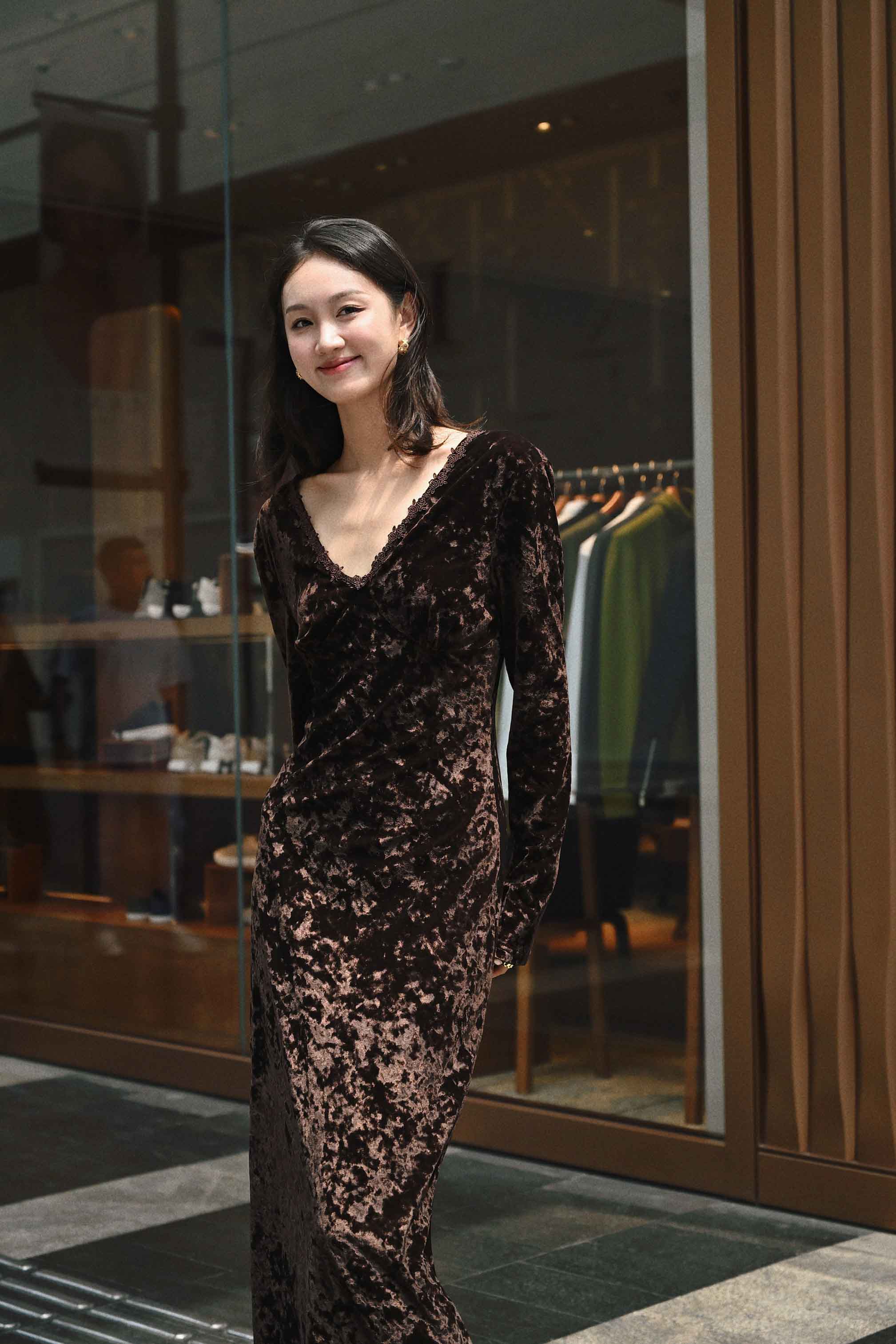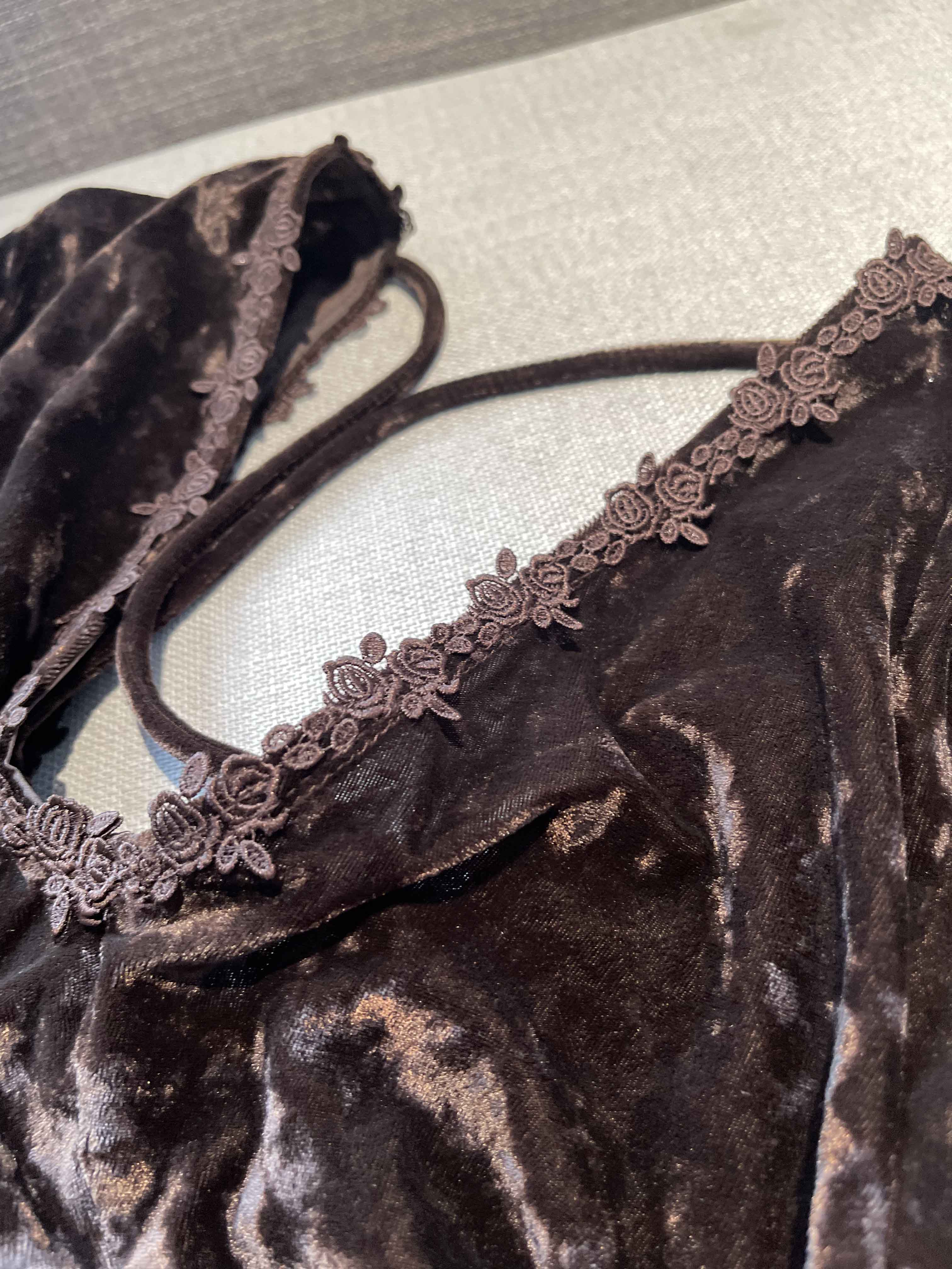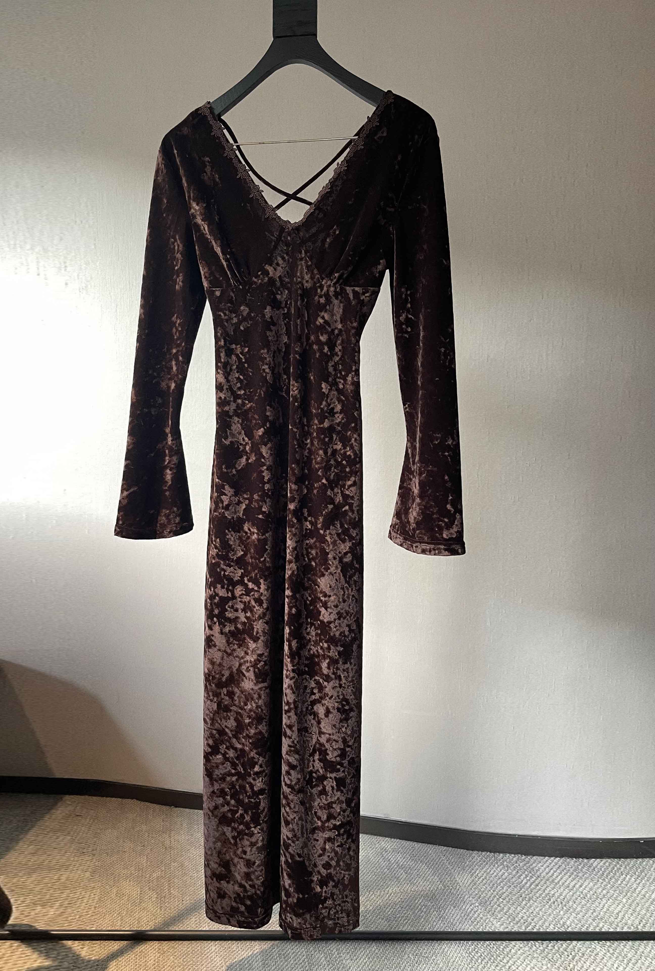 自带温润光泽的丝绒连衣裙,后背绑带镂空,上街回头率chao高