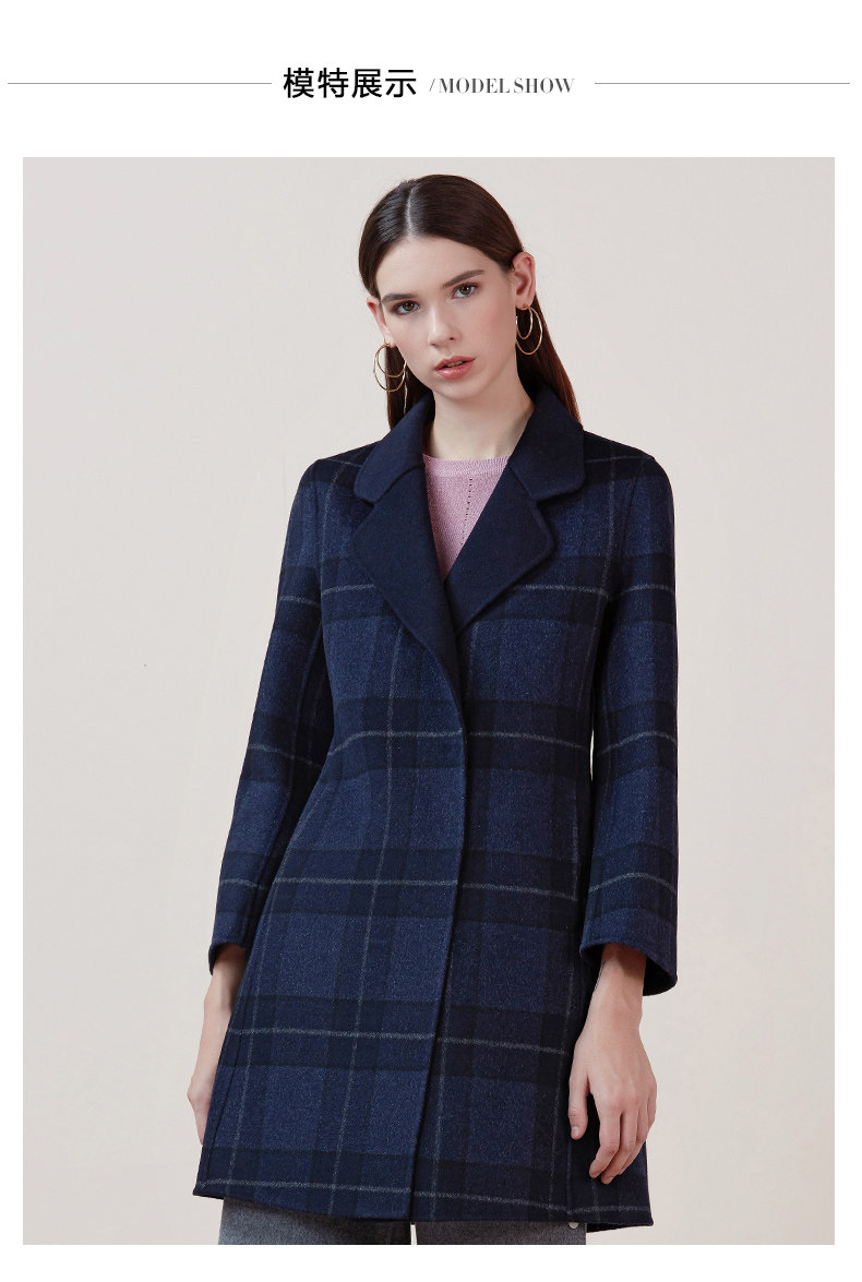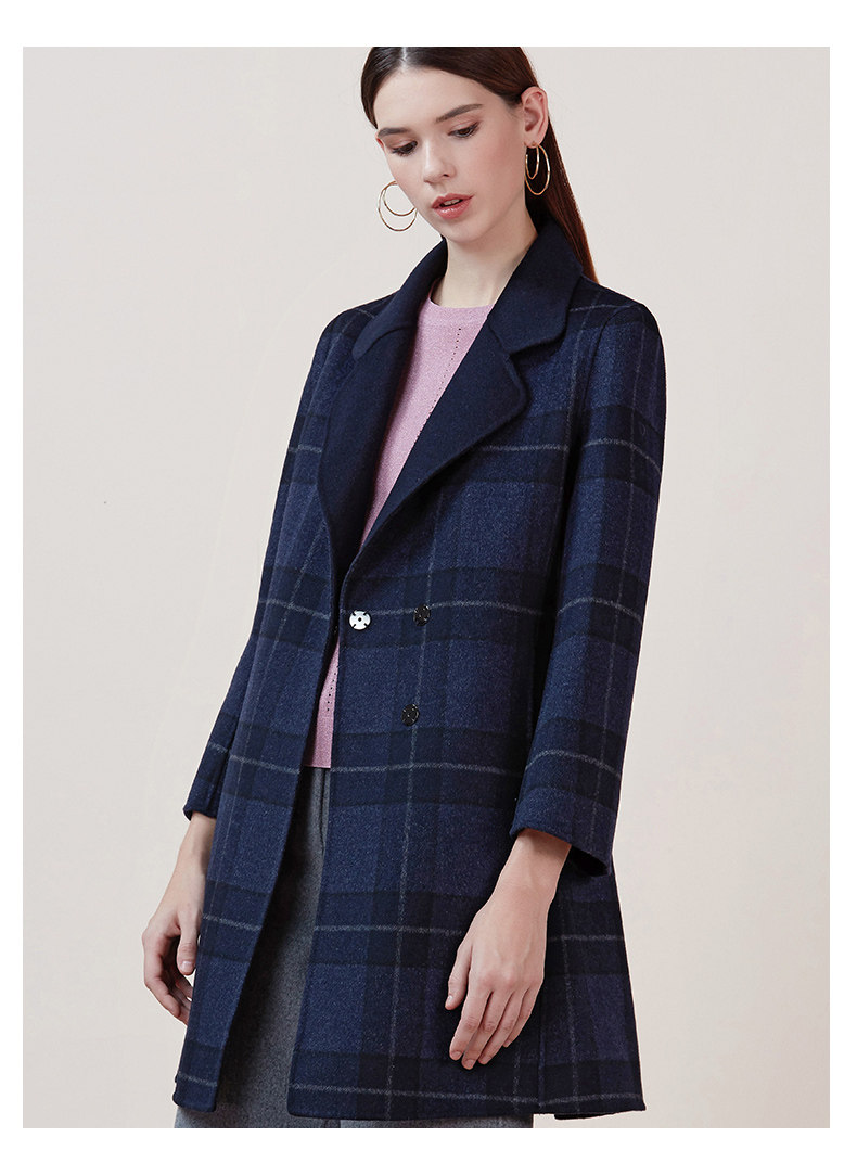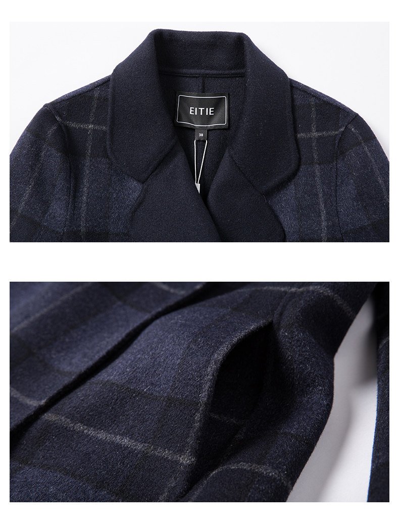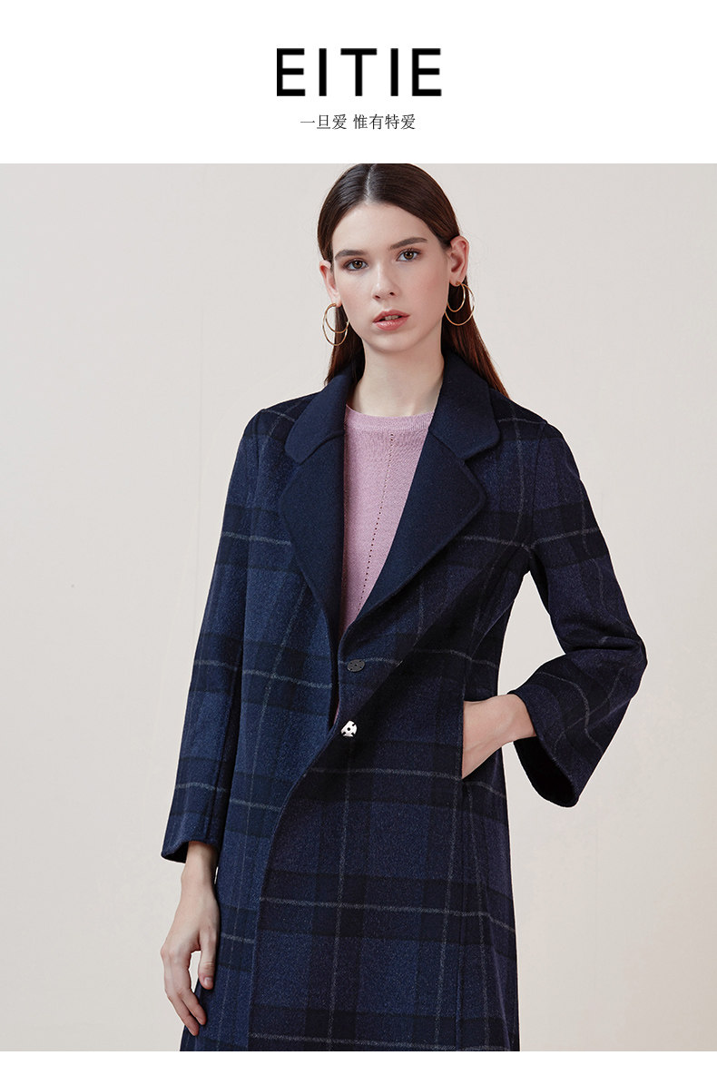 EITIE爱特爱品牌女装冬季修身暗扣格子羊毛呢外套中长款5814516