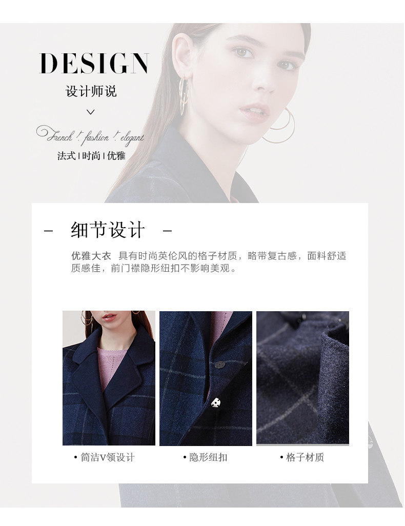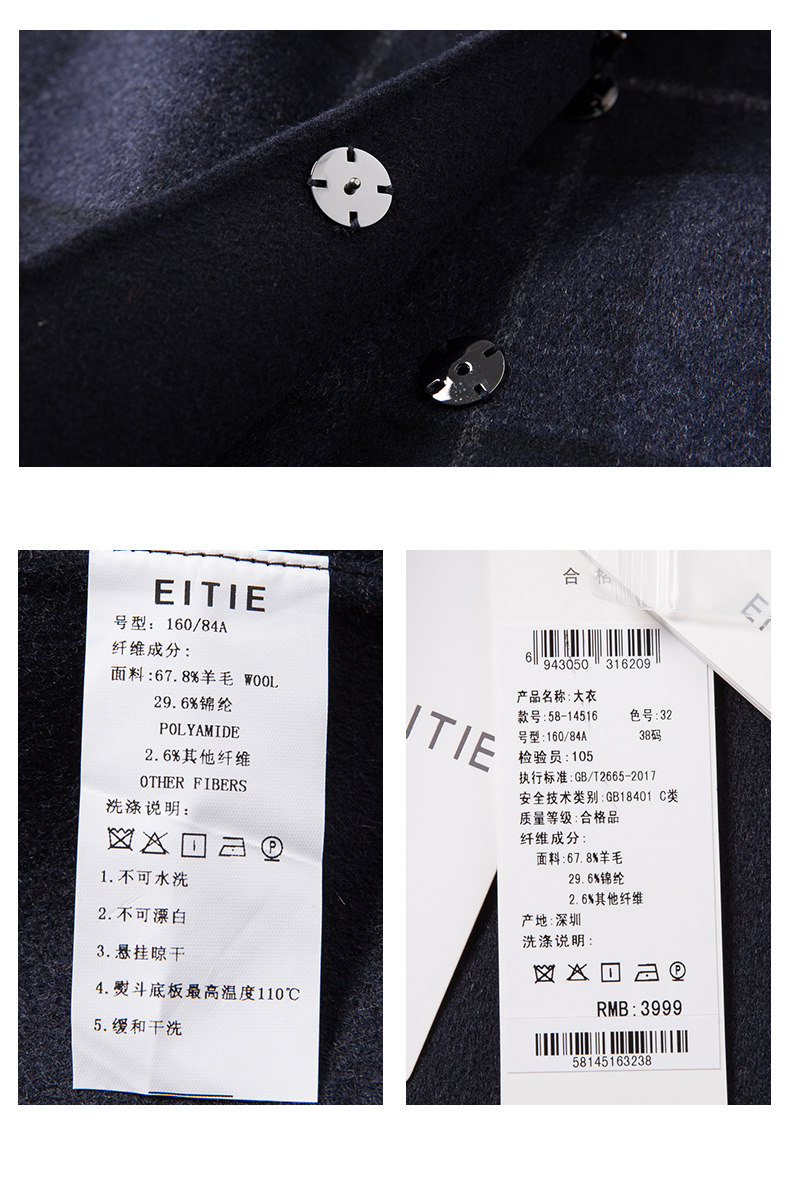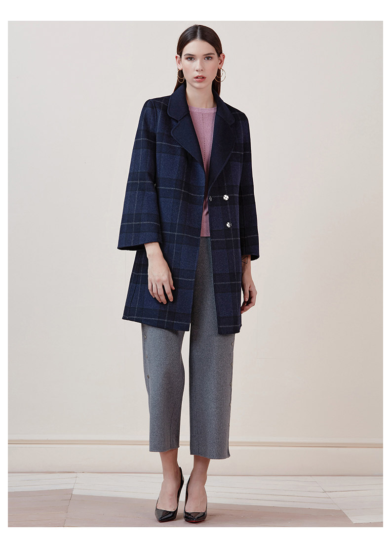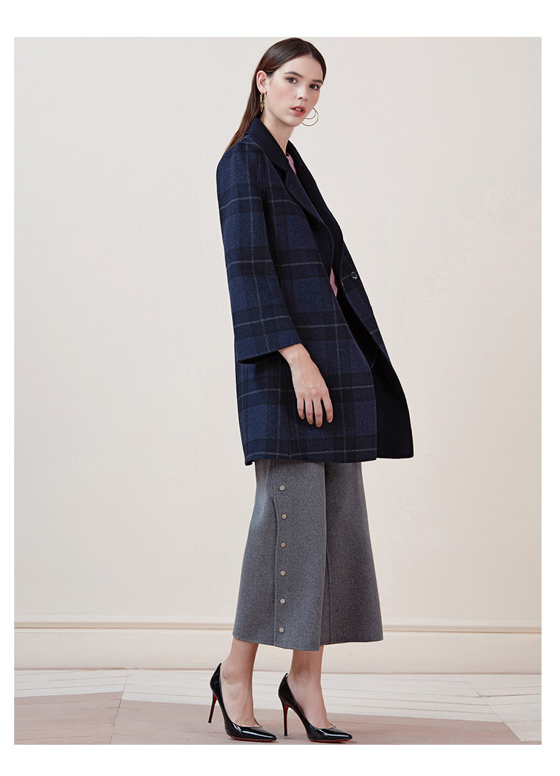 EITIE爱特爱品牌女装冬季修身暗扣格子羊毛呢外套中长款5814516