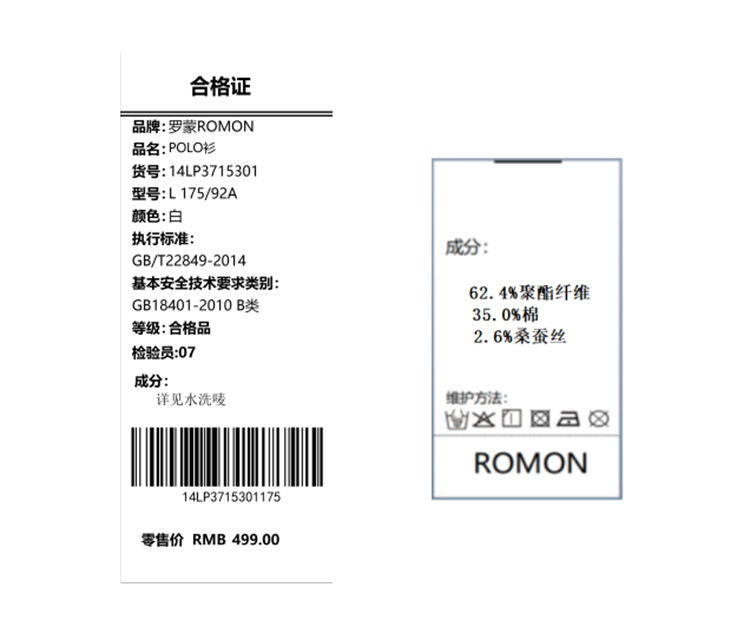 面料:62.4%聚酯纤维 35.0%棉 2.6%桑蚕丝