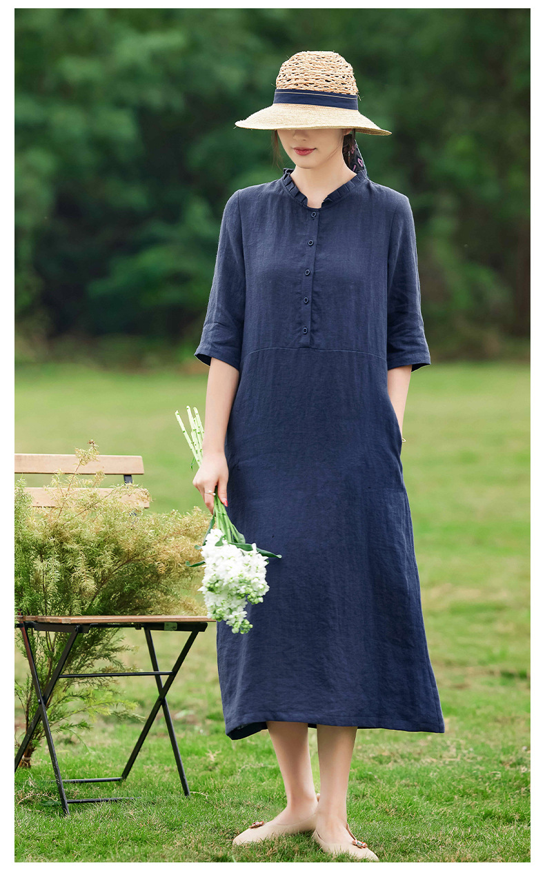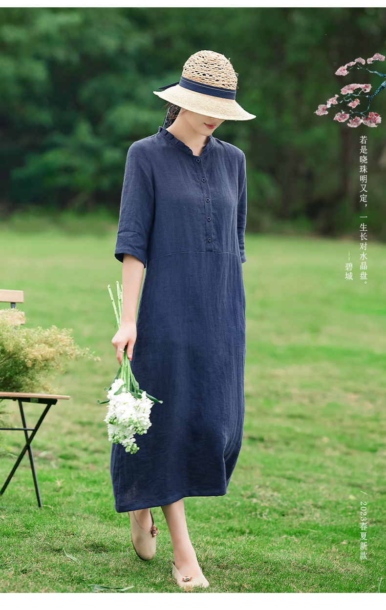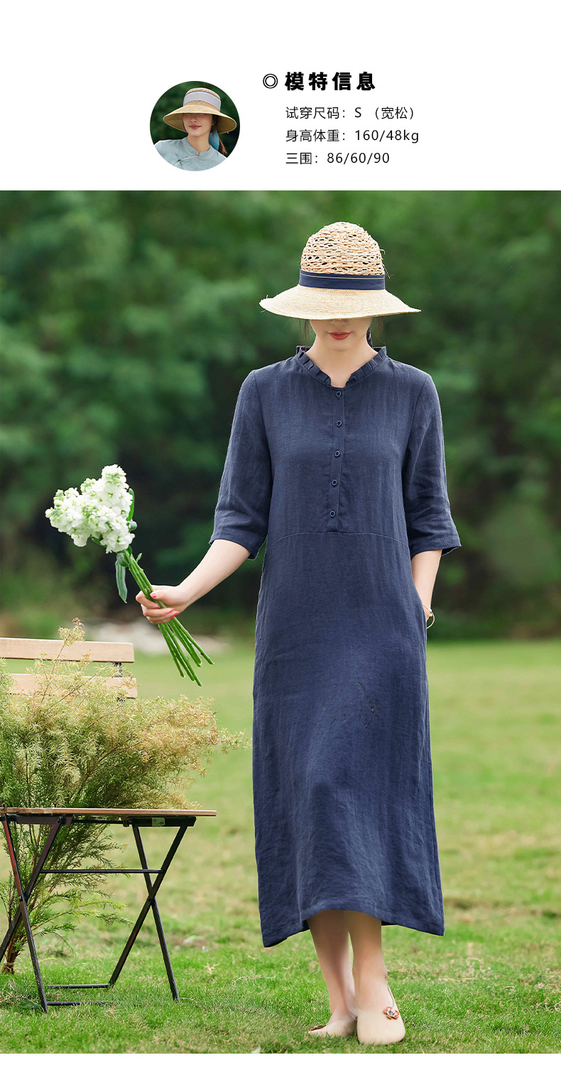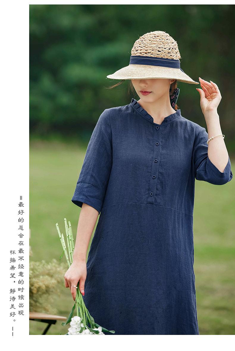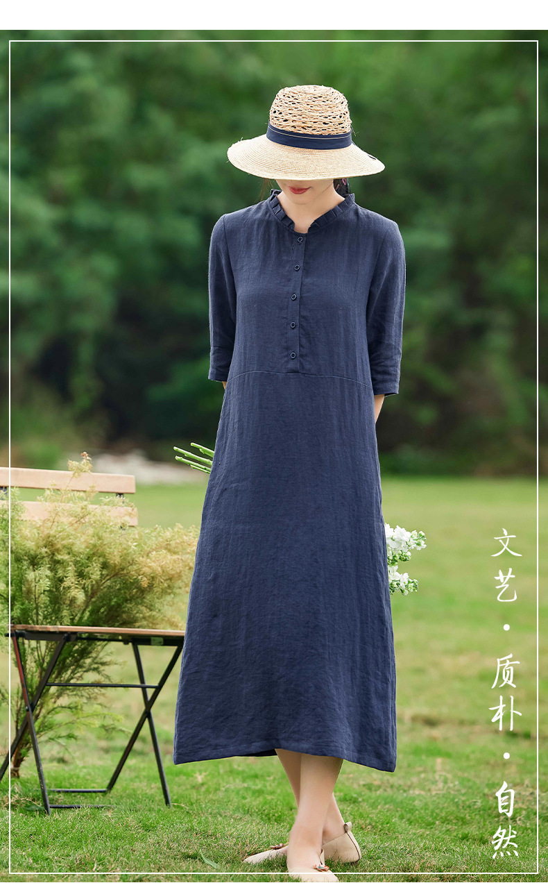 HM-C013春装新款原创设计 文艺亚麻A字裙复古砂洗怀旧纯色连衣裙