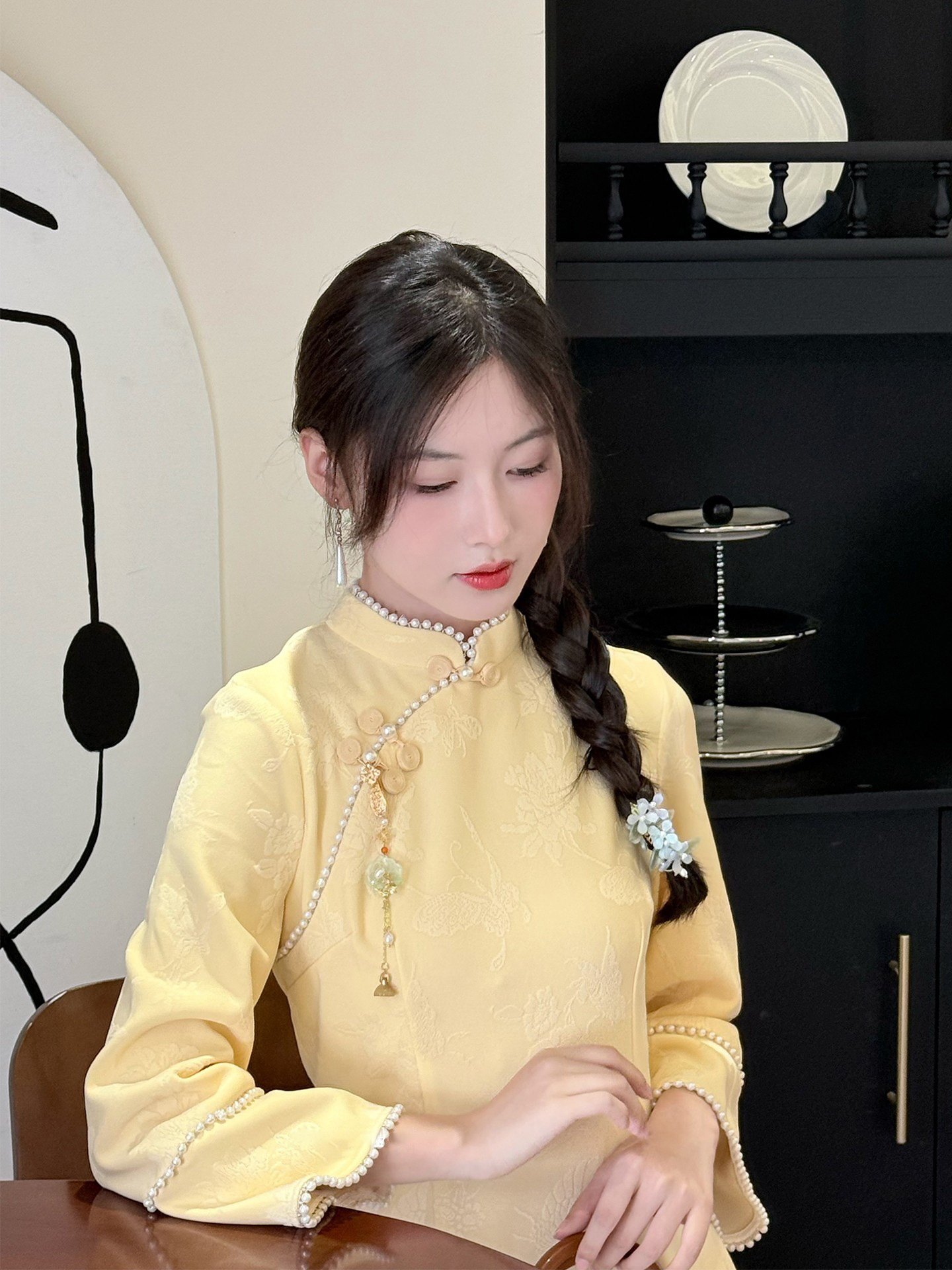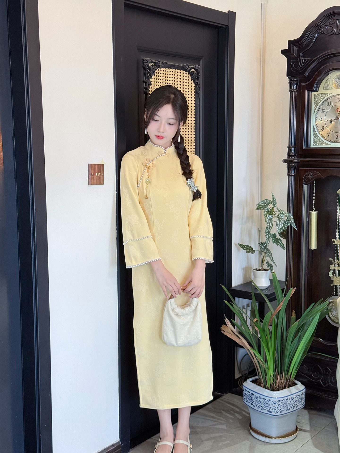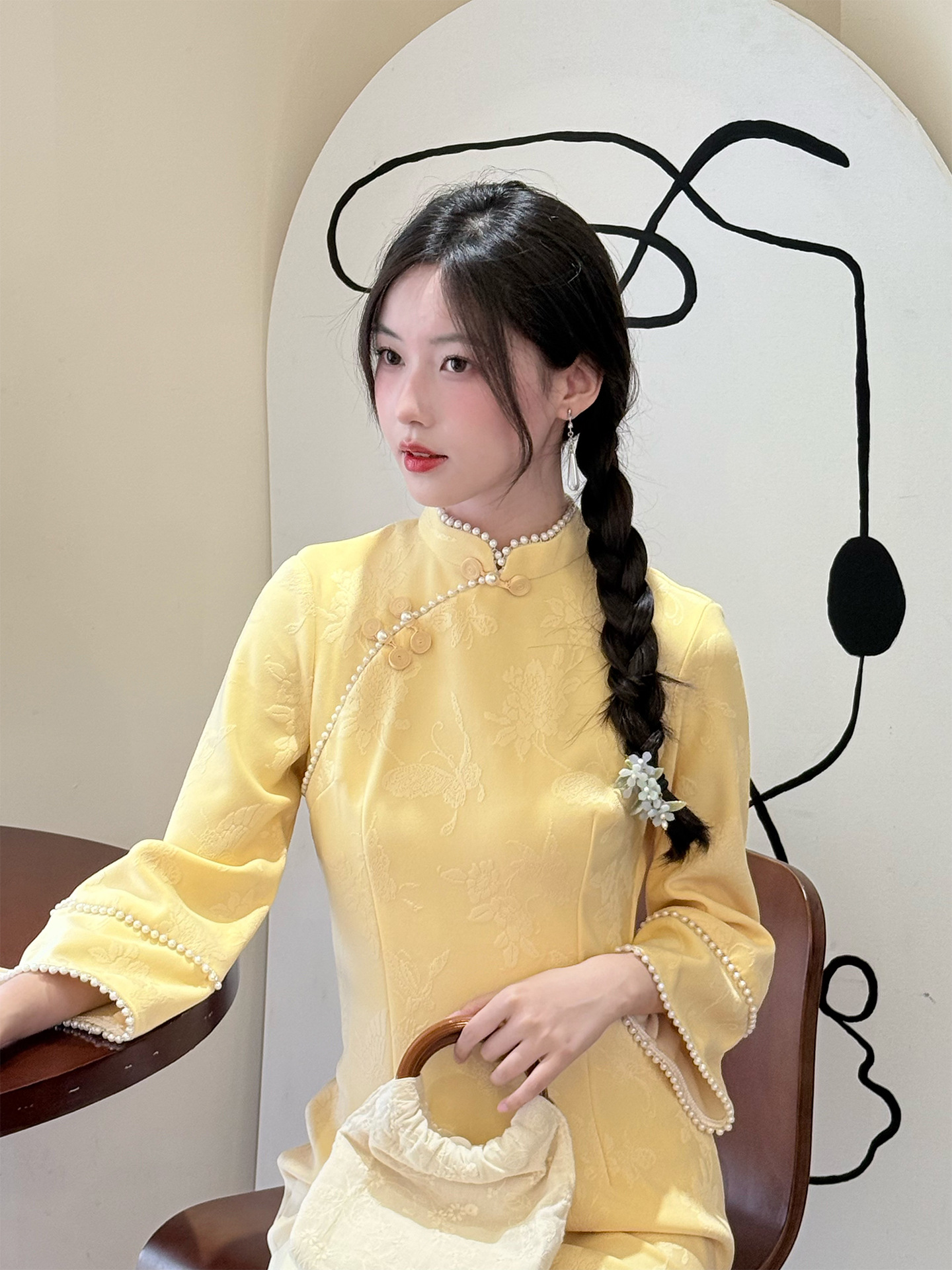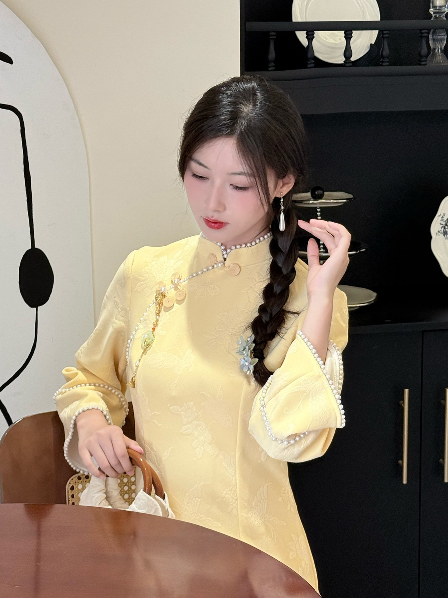 LSB4074改良旗袍黄色2025新款少女日常显白新中式连衣裙复古日常倒大袖秋 商品图0