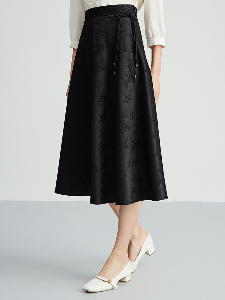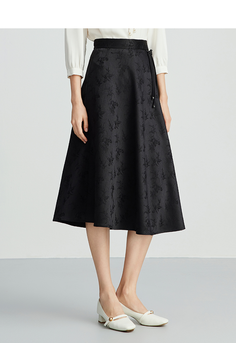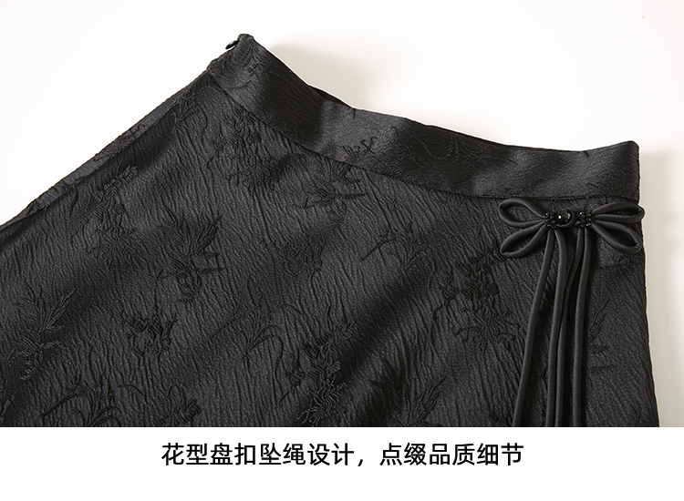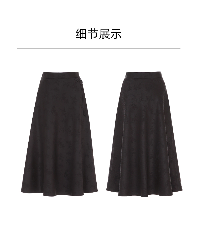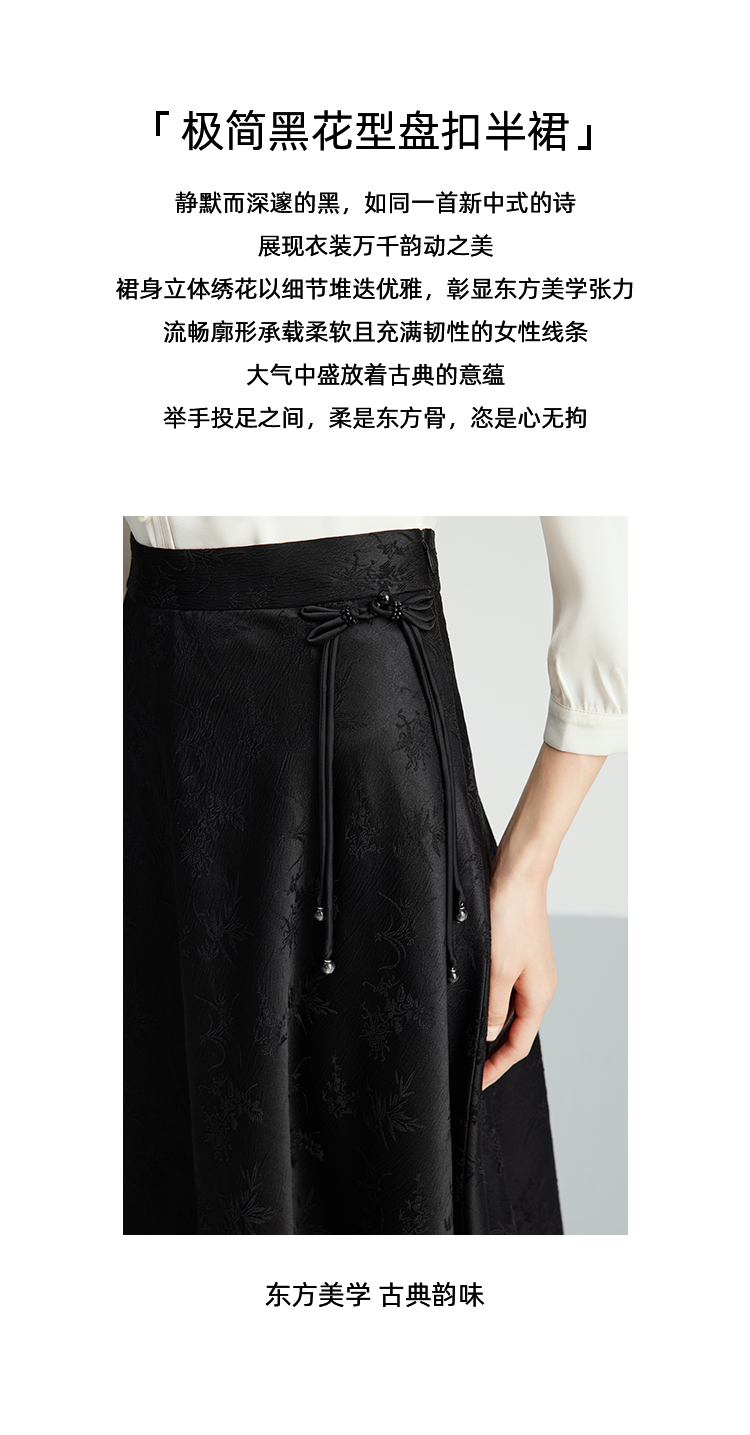 EITIE爱特爱中式盘扣缎面暗纹黑色高腰伞裙过膝半身裙秋新款C2406406