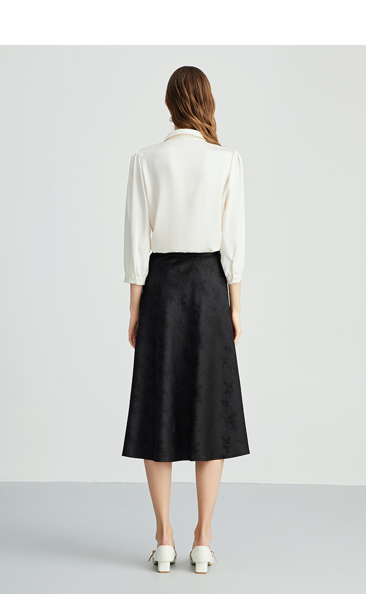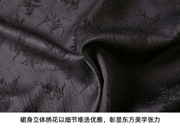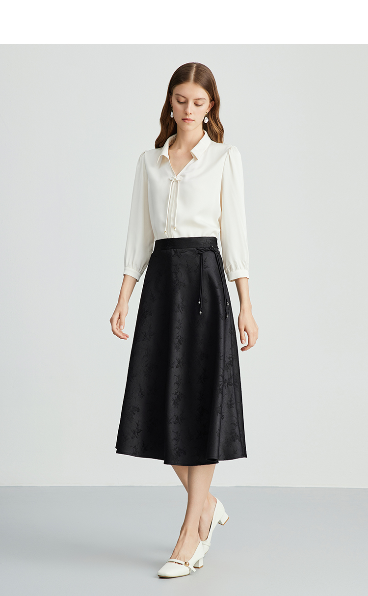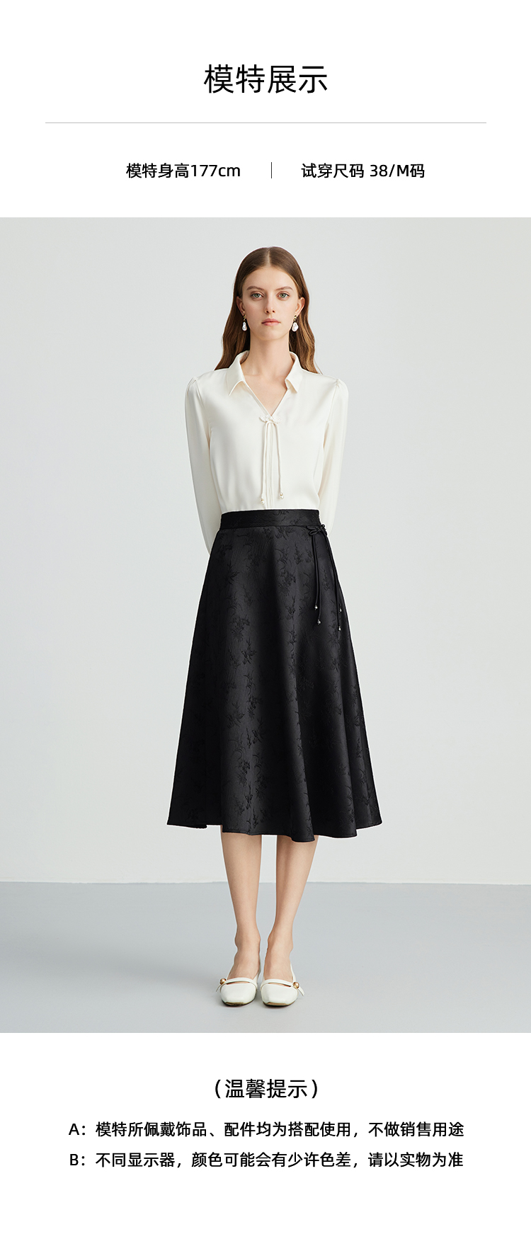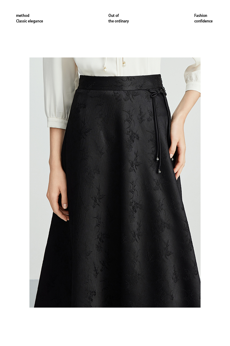 EITIE爱特爱中式盘扣缎面暗纹黑色高腰伞裙过膝半身裙秋新款C2406406