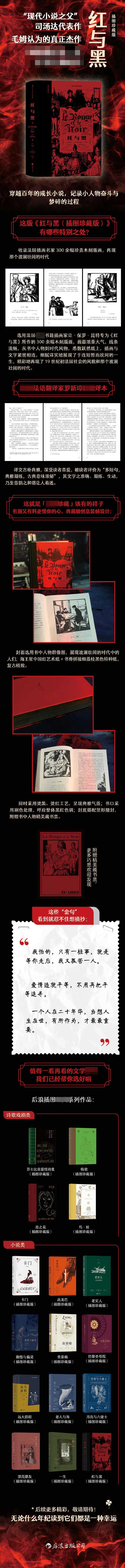 ◎“现代小说之父”司汤达代表作,曾多次被改编为影视剧 《红与黑》作为法国批判现实主义文学的奠基之作,开创了后世“意识流小说”“心理小说”的先河,司汤达也因此被后人称为“现代小说之父”。《红与黑》发表近200年来,被译成多种文字广为流传,曾被多次改编为戏剧、电影、电视剧。 ◎穿越百年的成长小说,记录小人物奋斗与梦碎的过程 《红与黑》紧紧围绕主人公于连个人奋斗与失败的经历这一主线,展现了小人物在时代的巨浪中如何升起野心和欲望,又如何逐渐梦碎直至消亡的过程。小说中梦想与现实之间的挣扎、爱情与阶级之间的矛盾等问题,在每个时代都能引起读者的共鸣。 ◎收录法国插画名家300余幅珍贵木刻版画➡再现波澜壮阔的时代 选用法国书籍插画家让·保罗·昆特专为《红与黑》所作的300余幅木刻版画,画面浓重大气,线条流畅,从书中人物到时代风物,悉数跃然纸上,插画与文字紧密相连,细腻详实地展现了于连短暂而坎坷的一生,精彩地再现了19世纪初法国社会的风貌和那个波澜壮阔的时代。 ◎法语翻译家罗新璋译本➡译笔古朴典雅 法语翻译家罗新璋译本,译文古朴典雅,深受读者喜爱,被读者评价为“多短句,典雅凝练,古典意味浓郁”,“其文字之准确、凝练、生动,乃至音韵之和谐让人着迷。通读全书,惊为天人。” ◎装帧特色:封面选用书中人物群像图,展现波澜壮阔的时代中的人们。海王星中国红艺术纸+书脊拼接细荔枝黑色特种纸,复古精致。同时采用烫黑、烫红工艺,呈现典雅气质。书口采用刷色处理,呼应整体黑红色调。封底搭配竖形腰封,附赠书中人物精美藏书票。