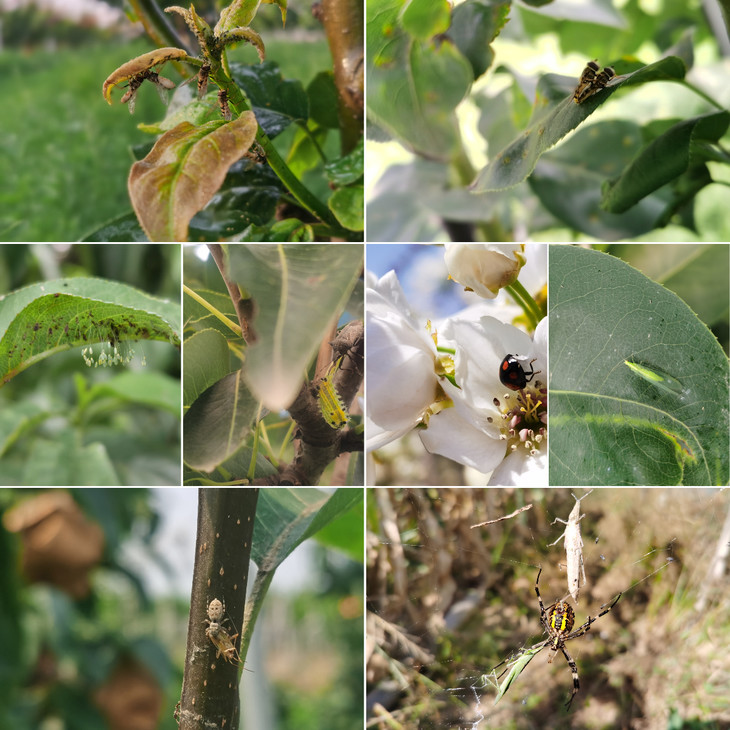 果园内的瓢虫、食蚜蝇、草蛉、捕食蜘蛛、螳螂等益虫都非常多,出现梨木虱和蚜虫等虫害的时候,用生物防治的方法以虫治虫,但天敌有滞后性,害虫还是对部分新枝叶和幼果造成了损害。