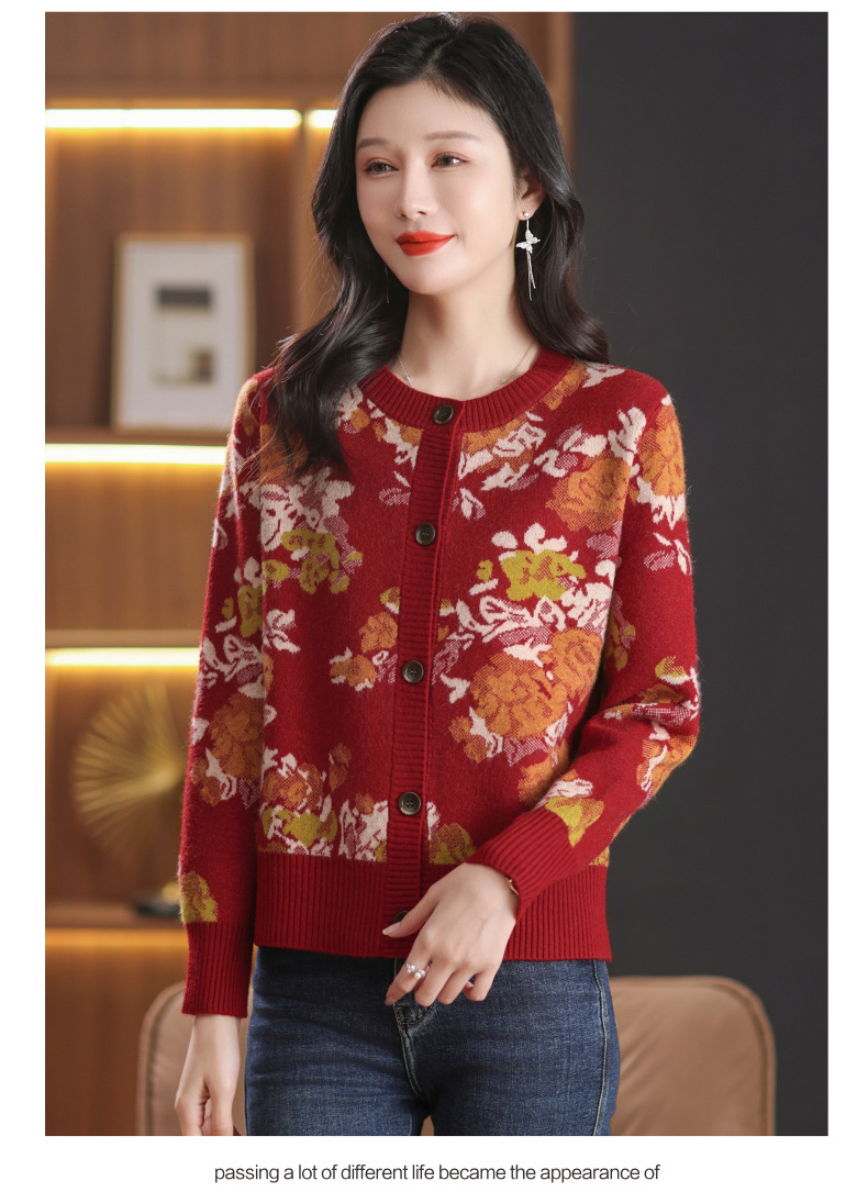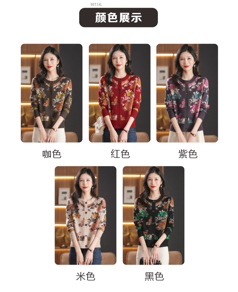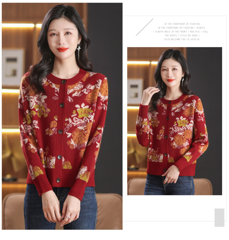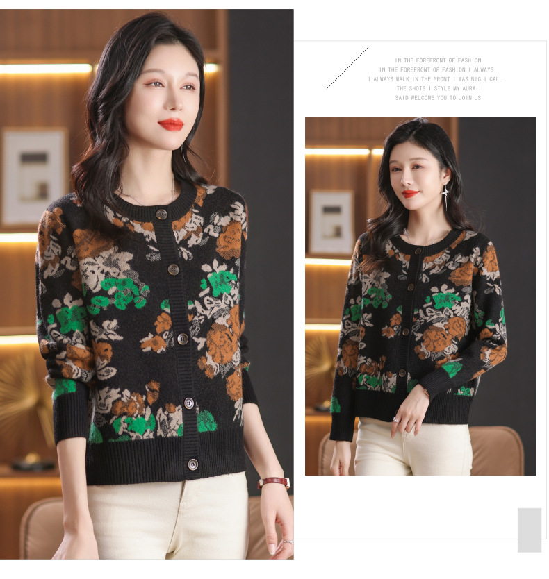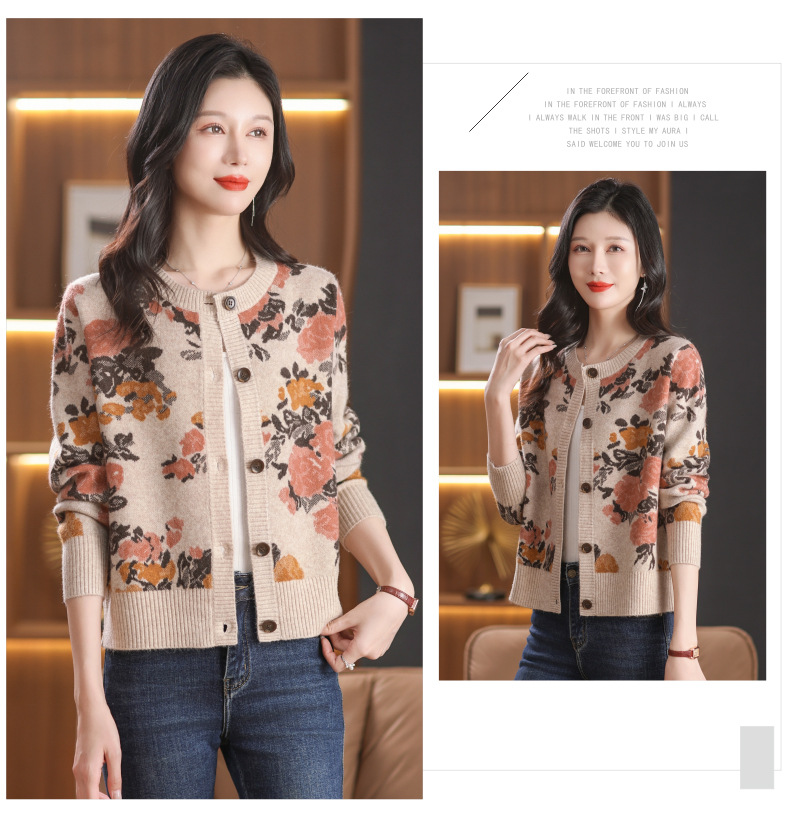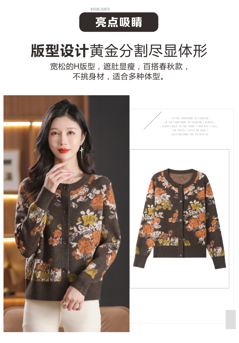 宽松圆领羊毛针织开衫,长袖提花外套CC-101-35430