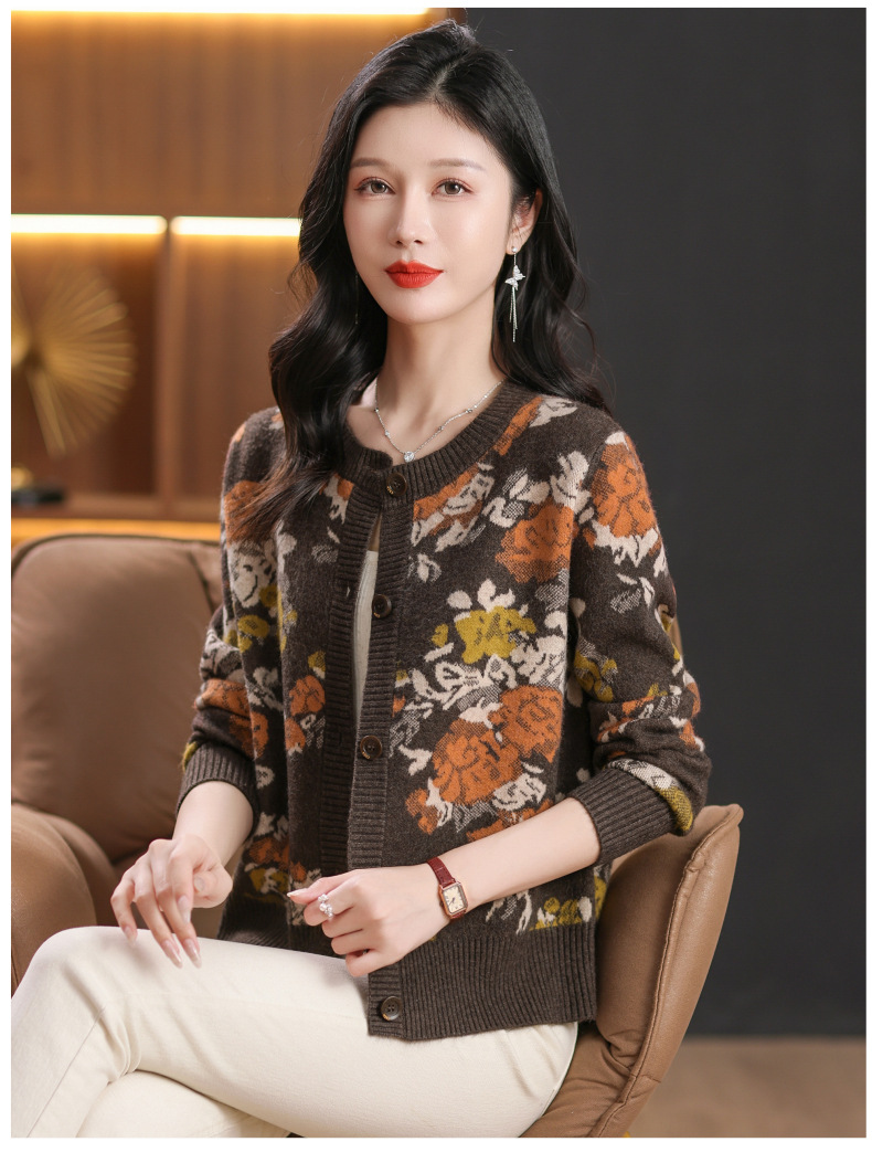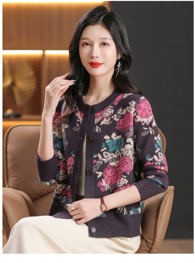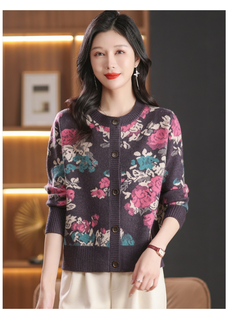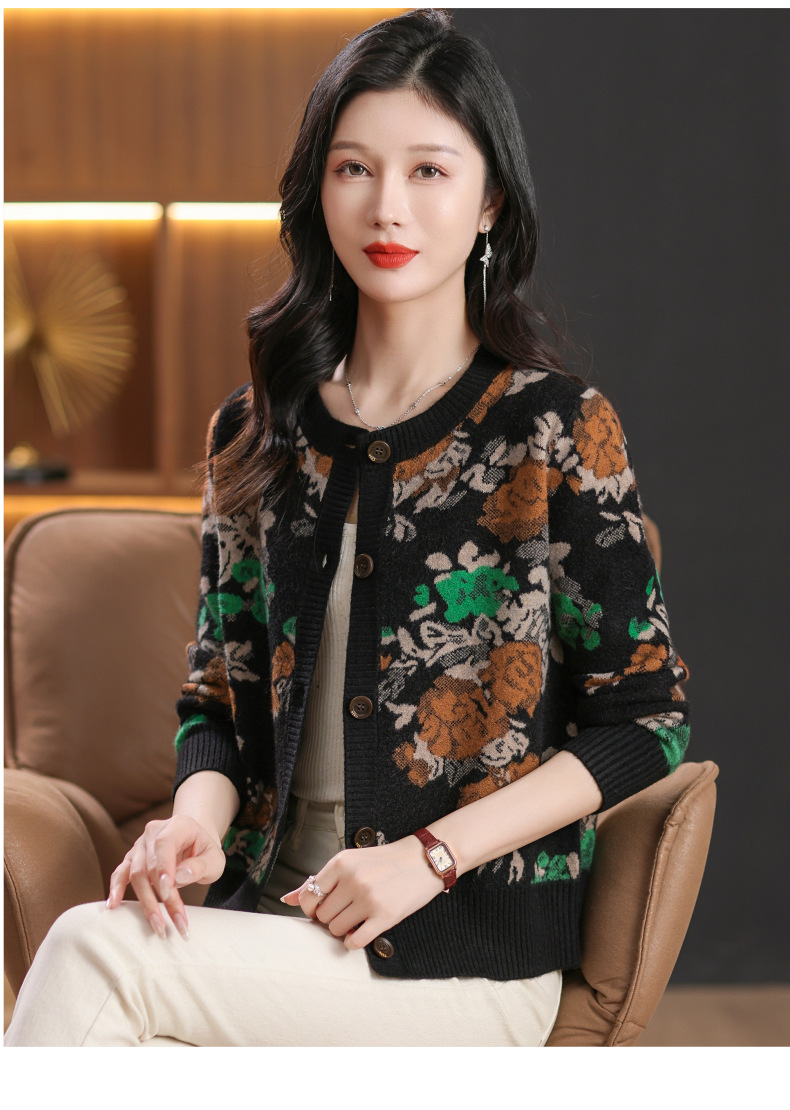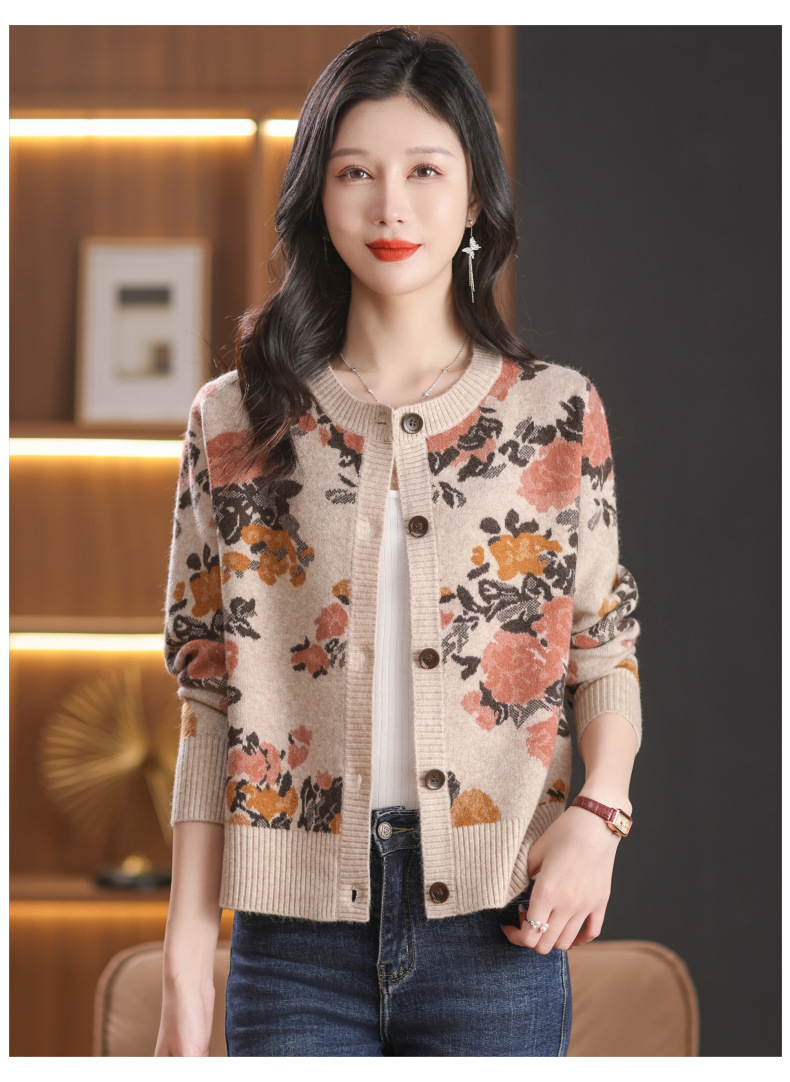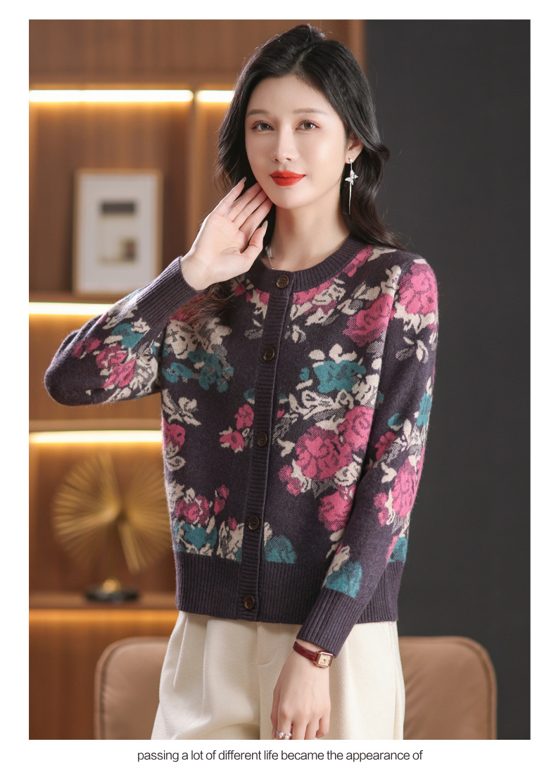 宽松圆领羊毛针织开衫,长袖提花外套CC-101-35430
