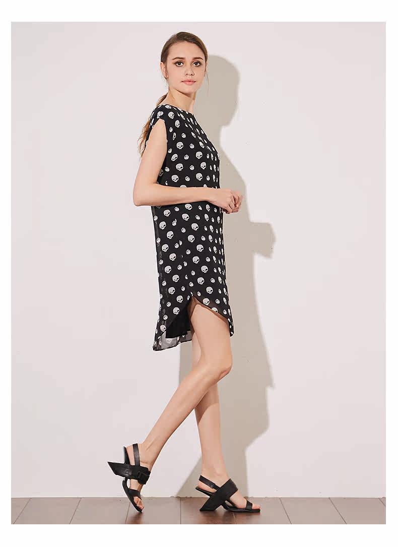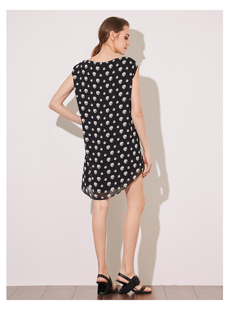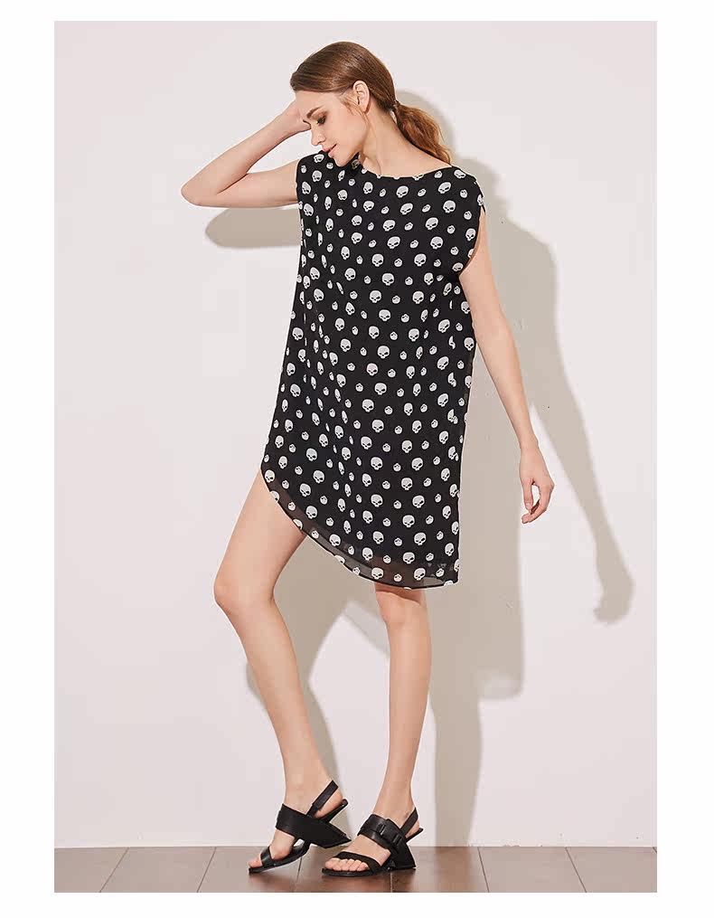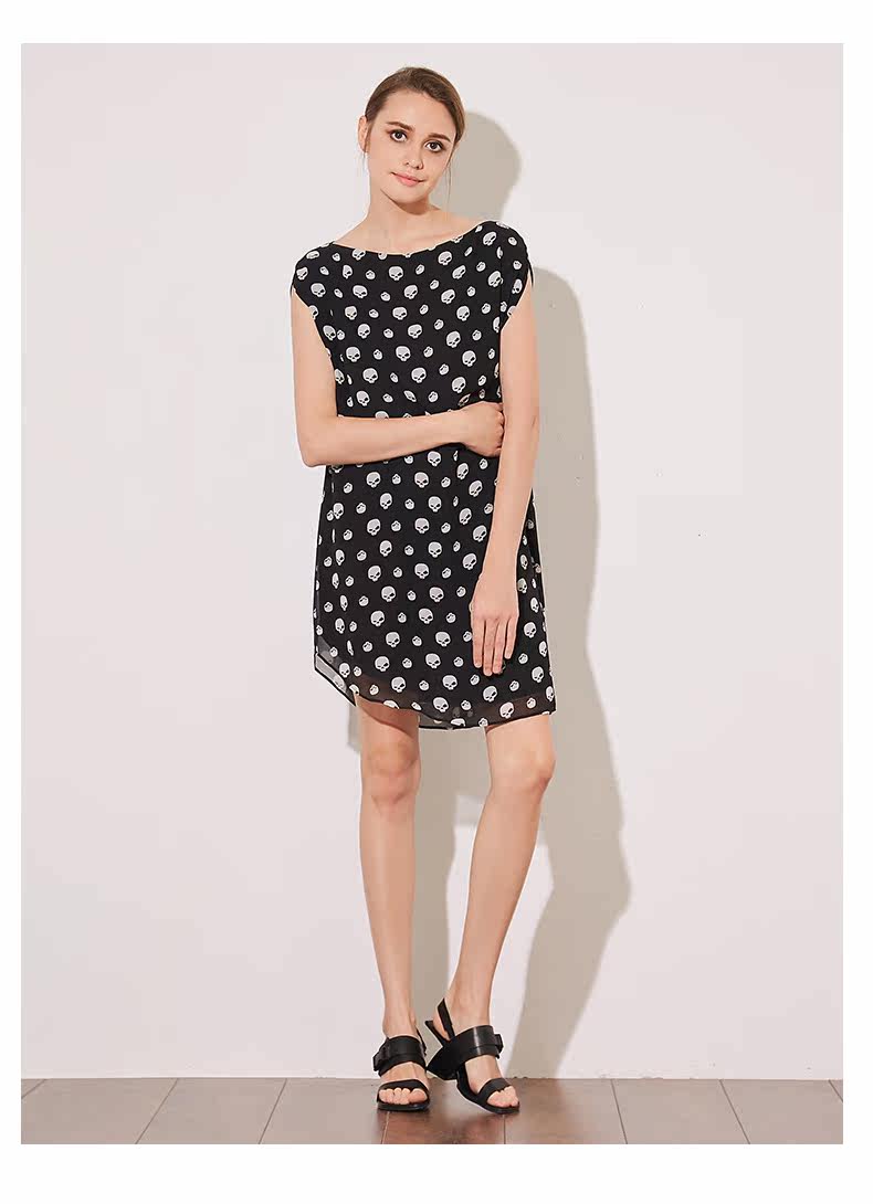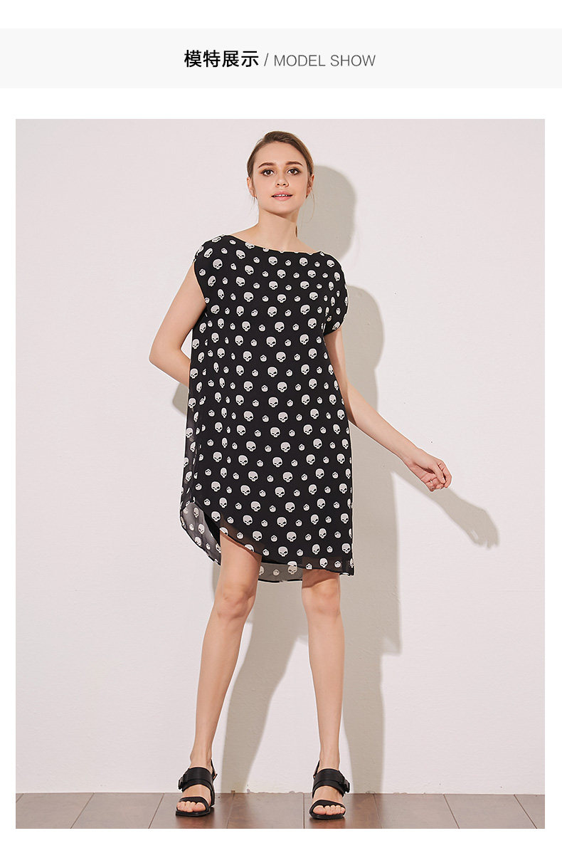 VIMAGE纬漫纪夏季新款女装包袖直筒一字领印花雪纺连衣裙中裙V507076