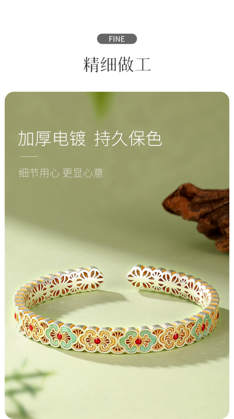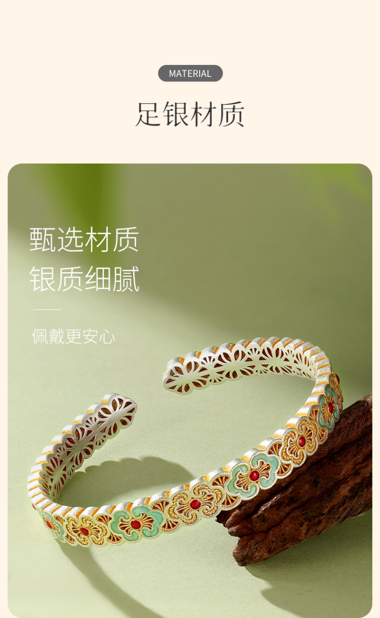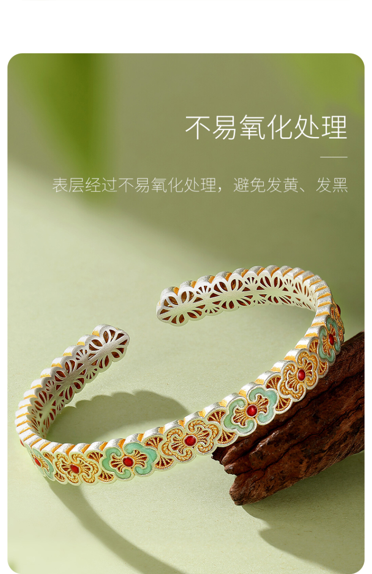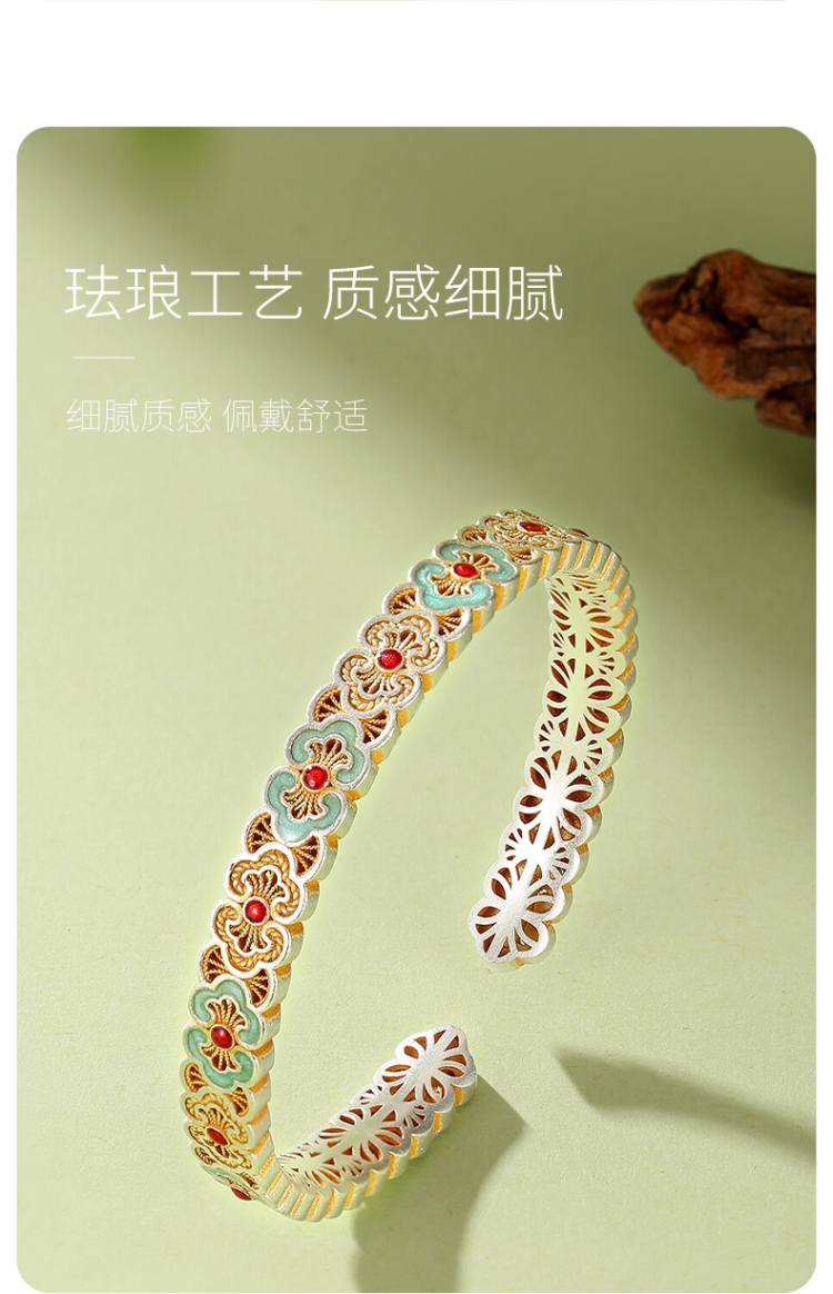 Winy 足银999金缕花笺手镯低温珐琅鎏金工艺配国检证书送女友闺蜜节日生日礼物
