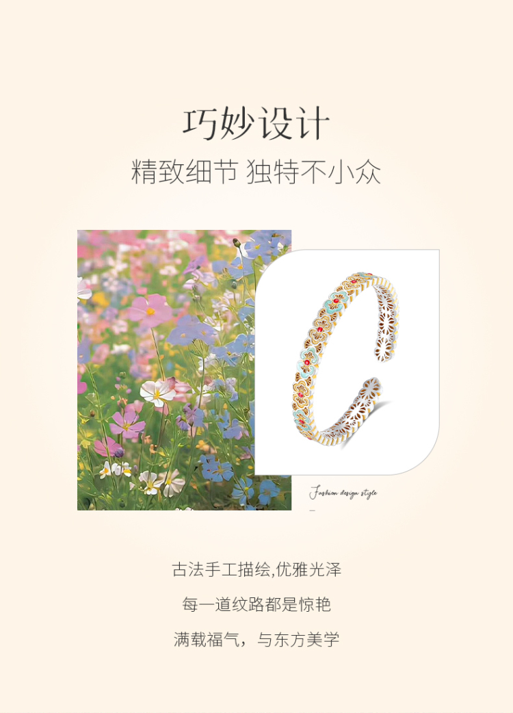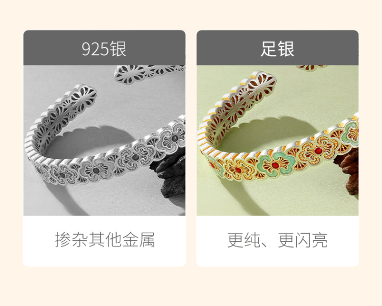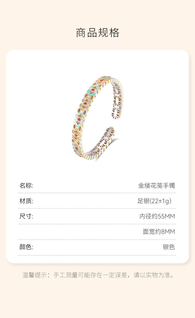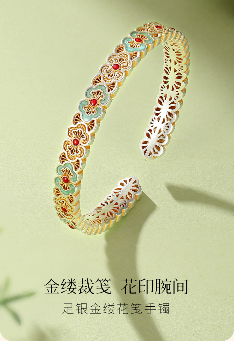Winy 足银999金缕花笺手镯低温珐琅鎏金工艺配国检证书送女友闺蜜节日生日礼物
