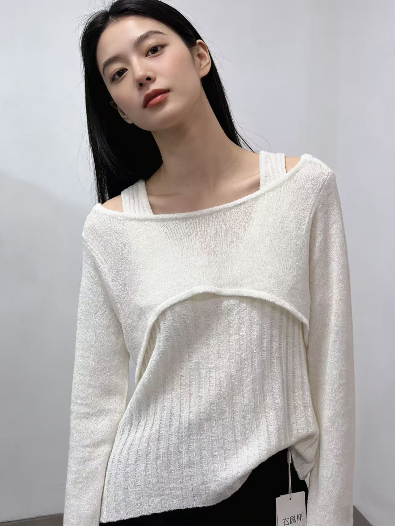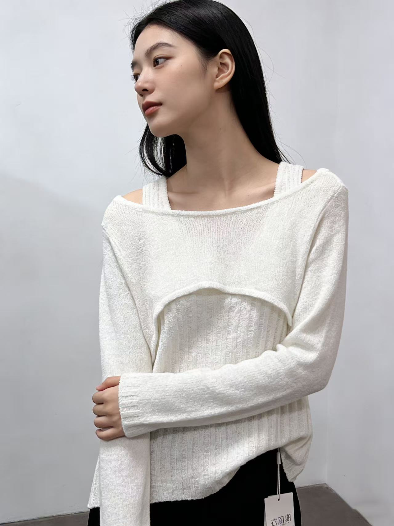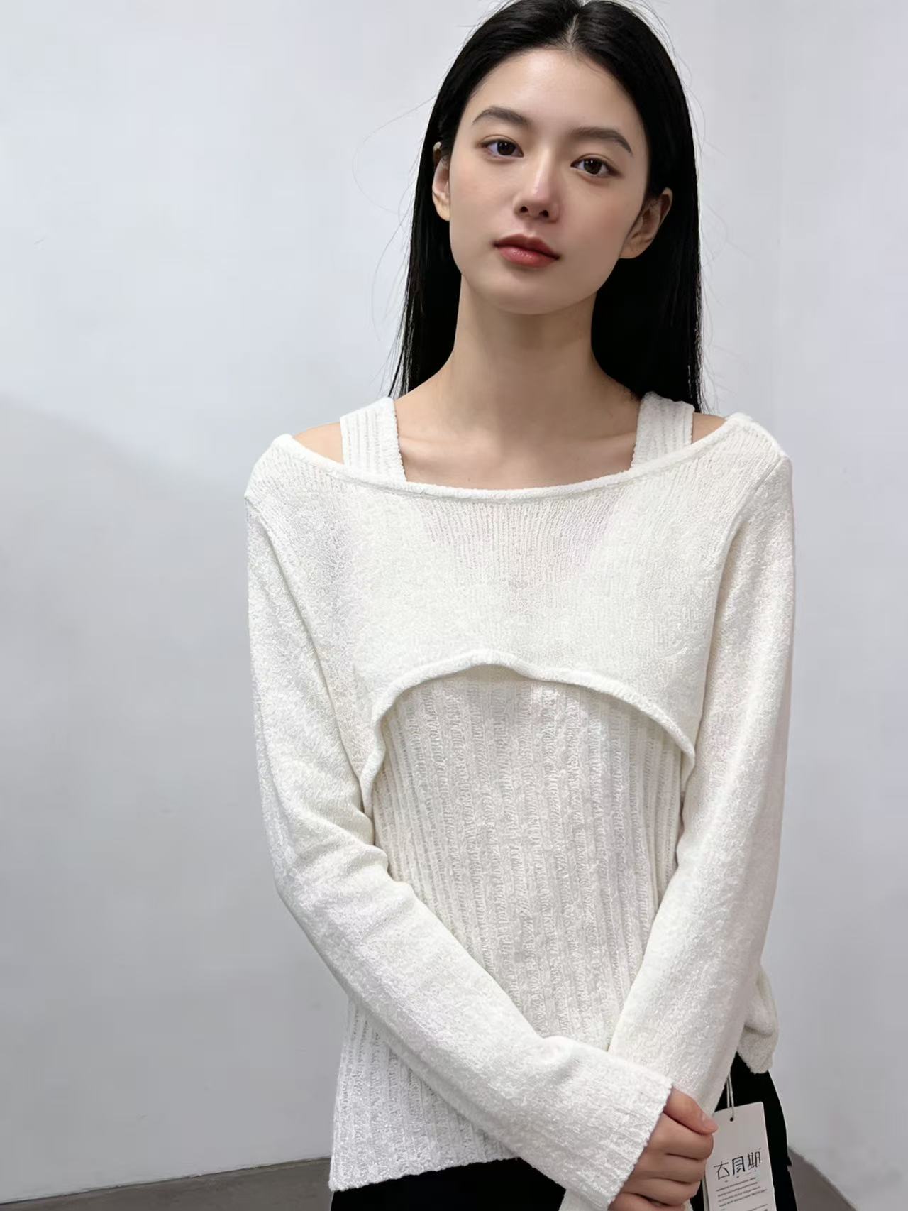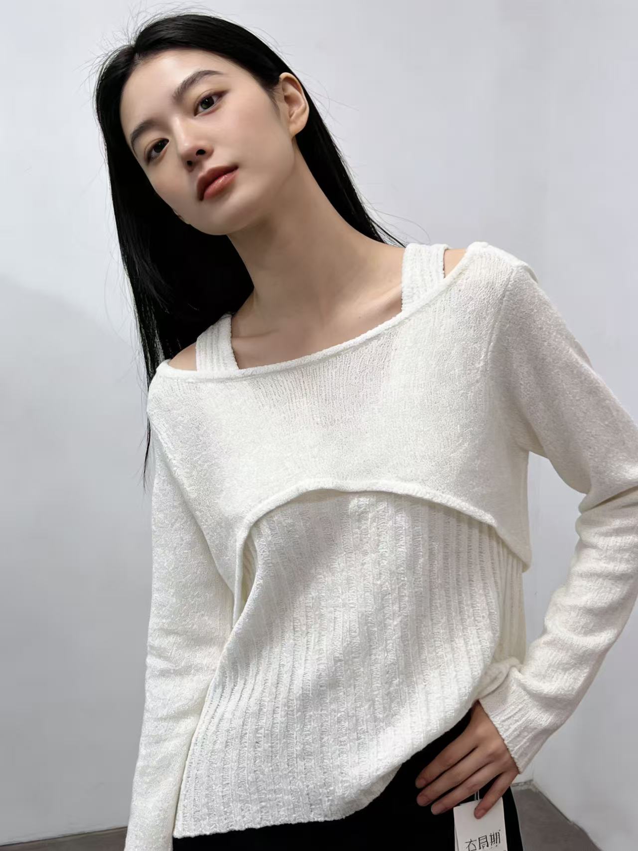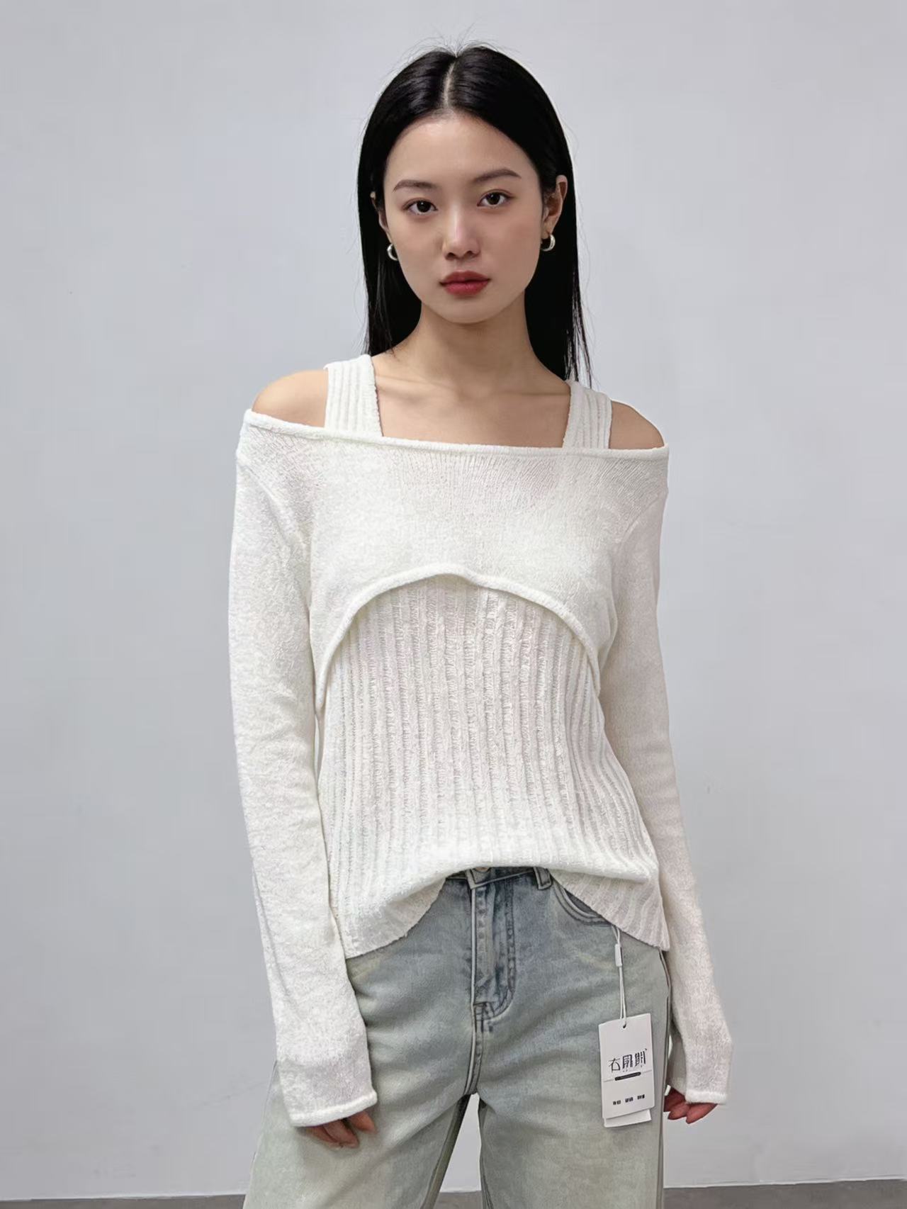 418良粉节|2026 活动爆款 品牌促➡️薄款【自营】衣周期8610一字肩假两件设计感镂空针织上衣-喜出