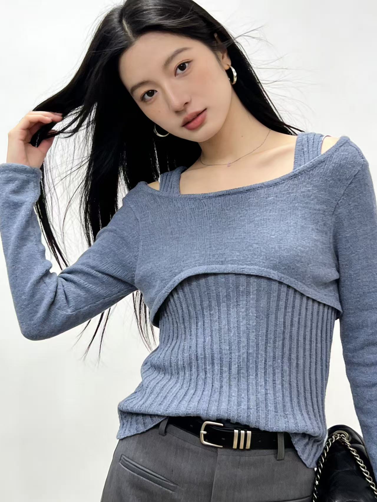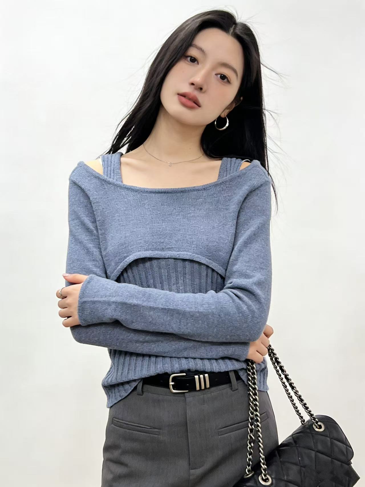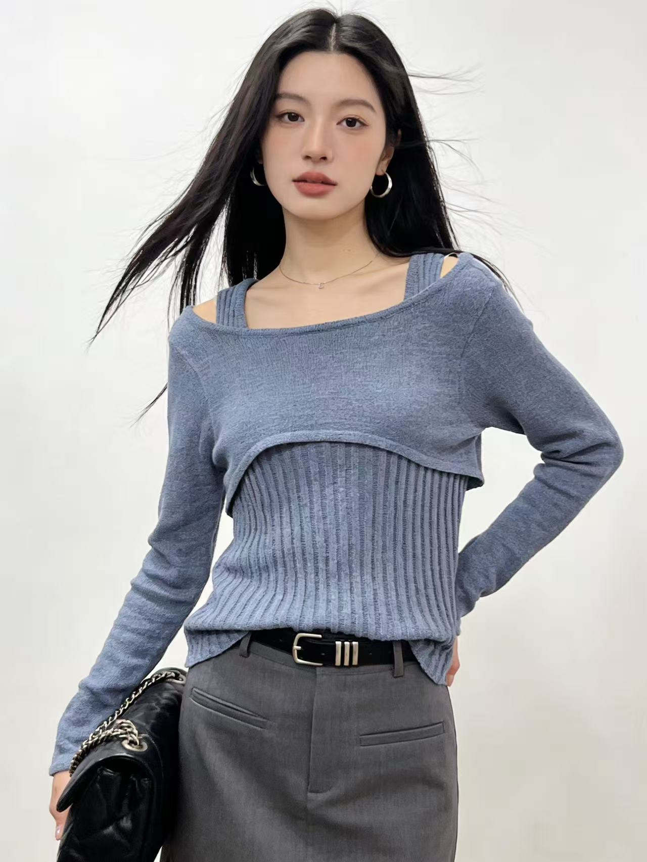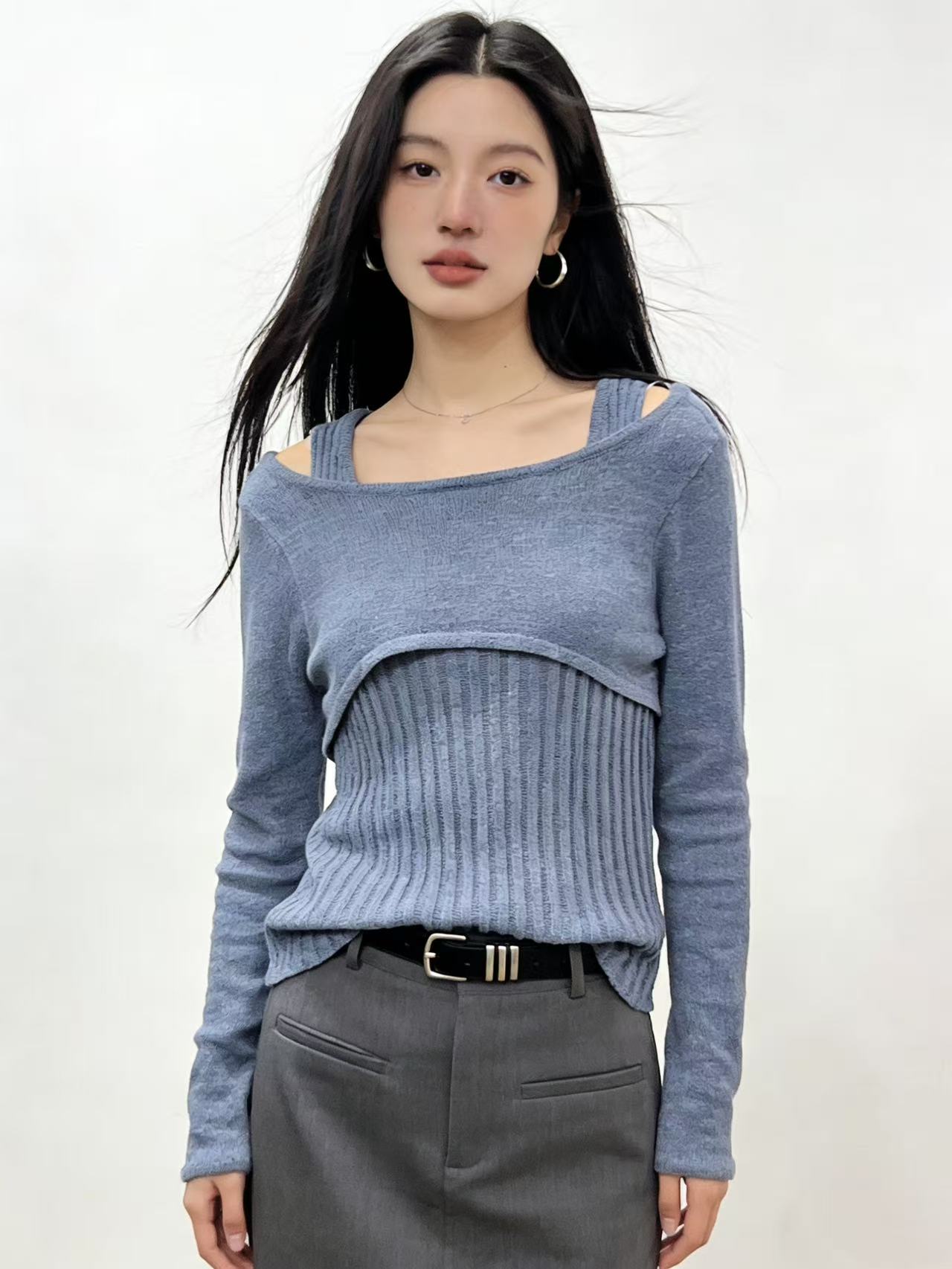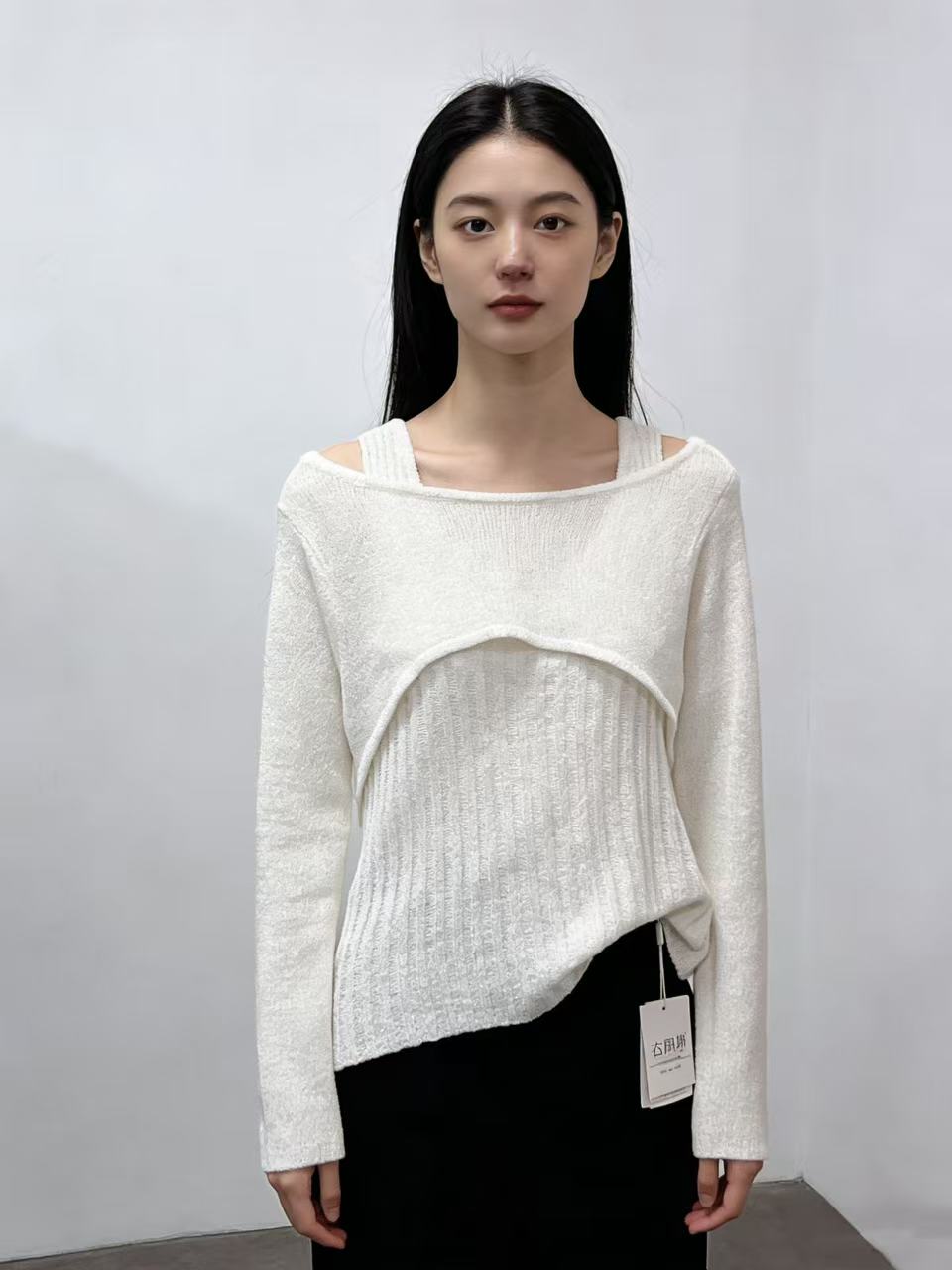 418良粉节|2026 活动爆款 品牌促➡️薄款【自营】衣周期8610一字肩假两件设计感镂空针织上衣-喜出