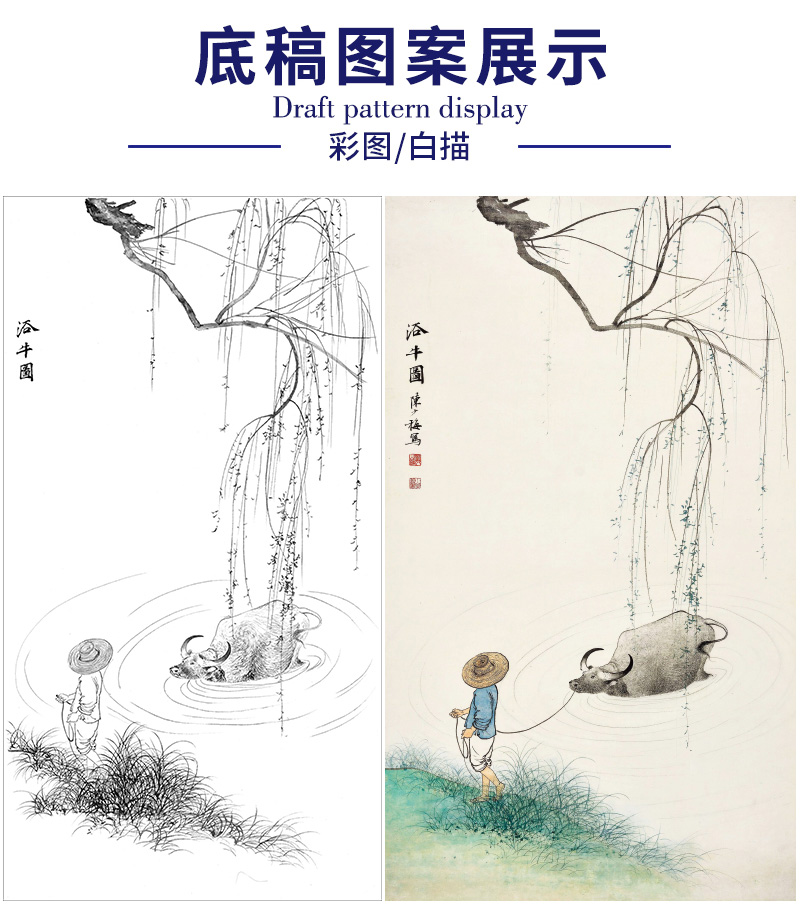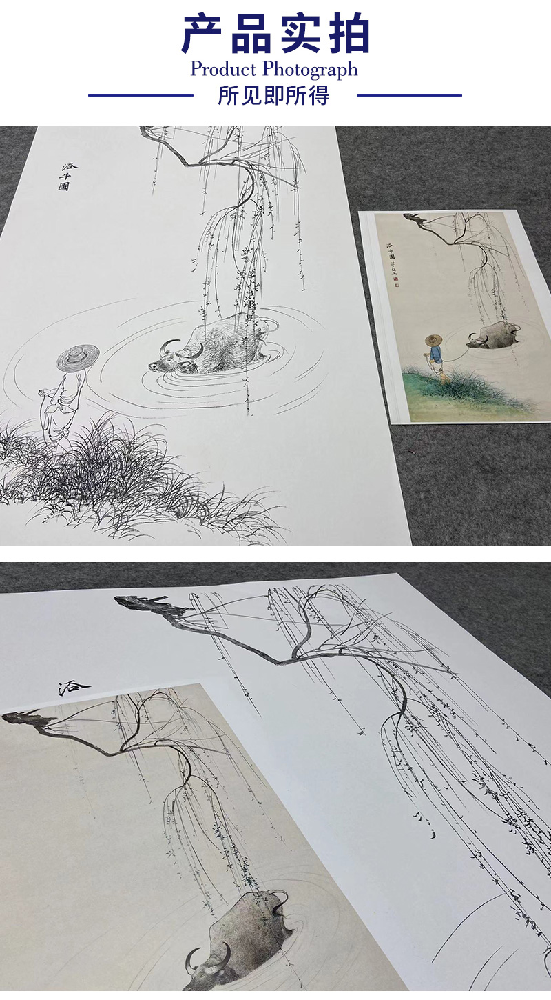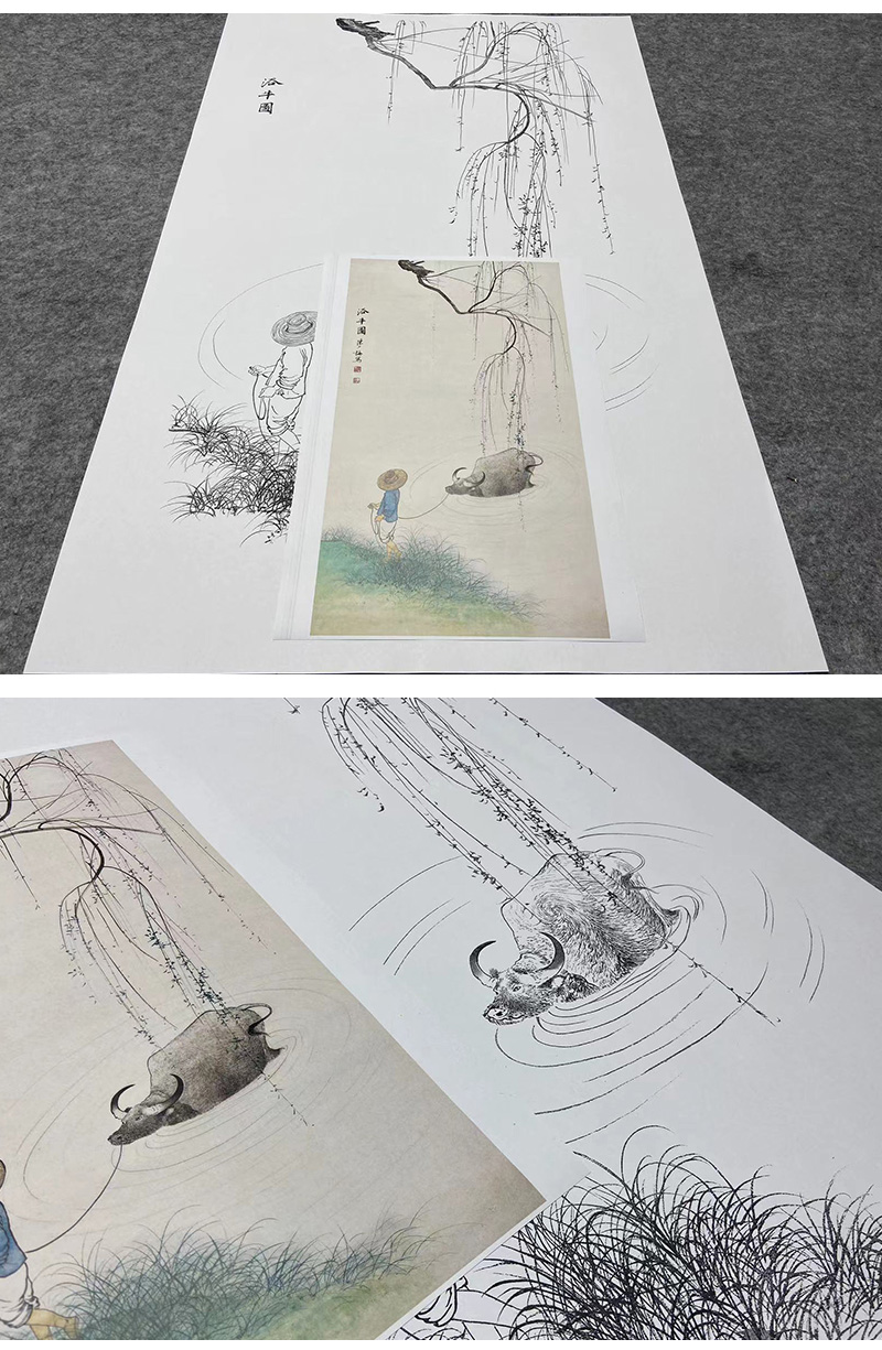 陈少梅工笔画白描底稿《浴牛图》临摹勾线高清打印稿YL20