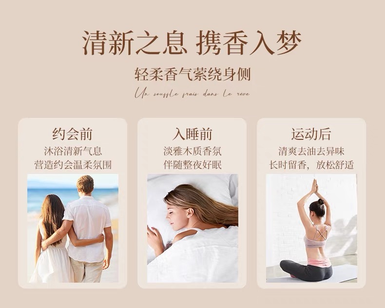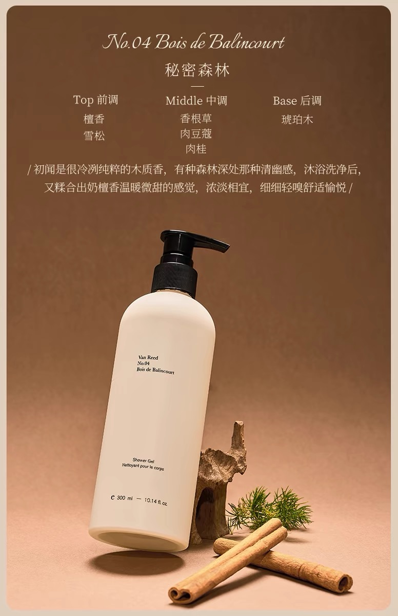 是微甜温柔的木质香,以雪松和檀香为主,辅以辛辣的肉桂、肉豆蔻复合物和朴实的香根草香调。初闻是很冷冽纯粹的木质香,有种森林深处那种清幽感,沐浴洗净后,又糅合出奶檀香温暖微甜的感觉,浓淡相宜,细细轻嗅舒适愉悦