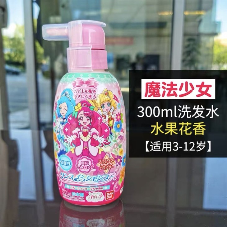 Bandai 美少女洗发水300ml👍万代儿童无泪配方洗发护发二合一洗发水💦,温和清洁的同时给发根和头皮充分养护,一瓶搞定。无硅油弱酸性👶,萃取天然保湿成分,只需一点点,就能搓出丰富的泡沫☁。#玫瑰水果香,含有葡萄柚、柠檬等7种水果提取,海洋胶原蛋白和氨基酸等保湿成分,滋润润滑头发,增加头发光泽🌟,修护发丝,平衡头发油脂。